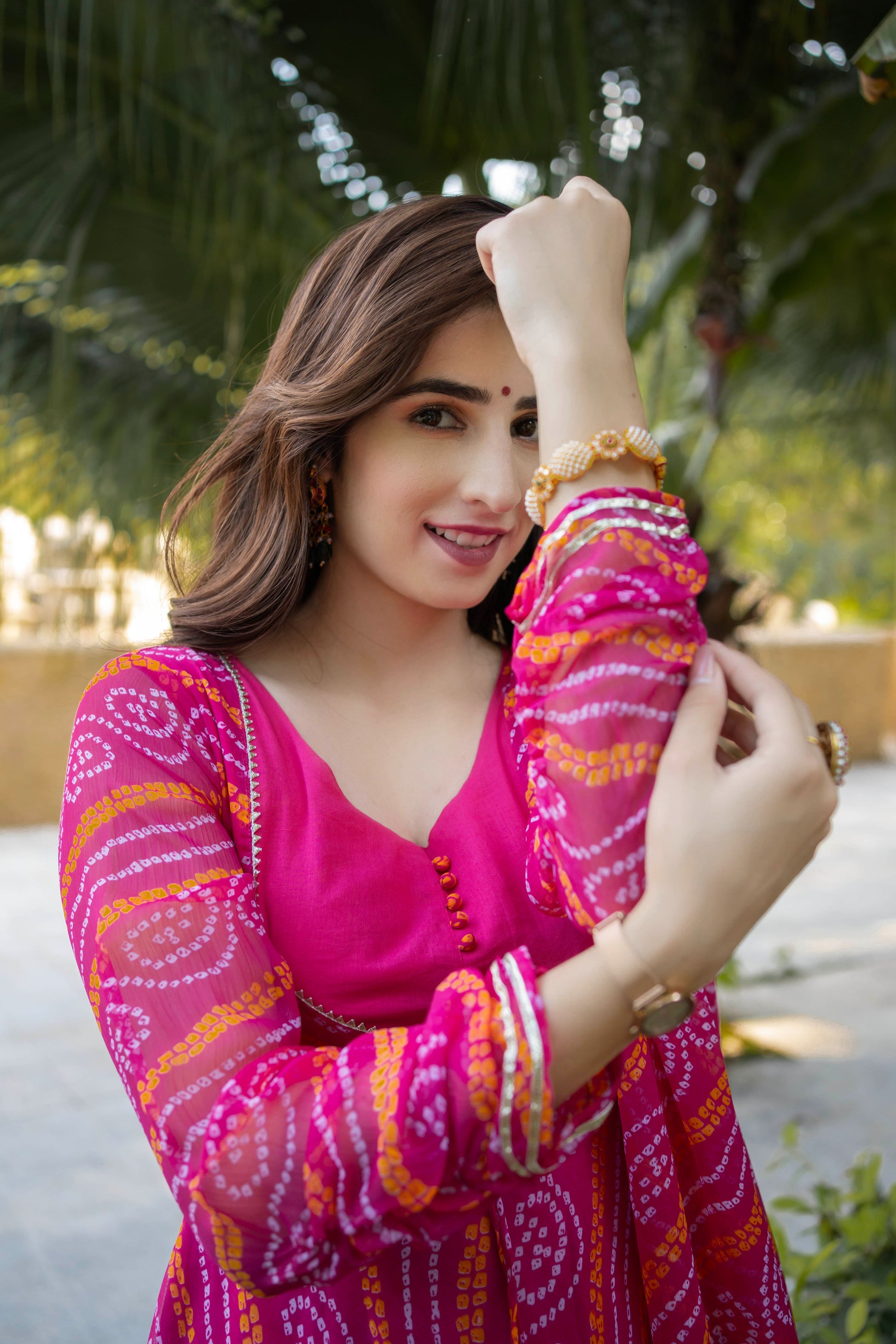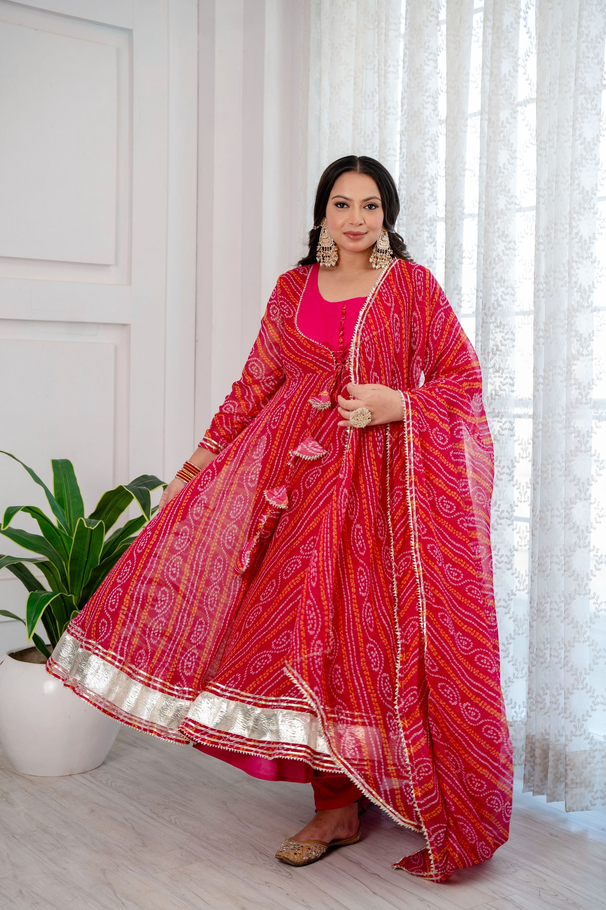 This beautiful set is our gulabo pure chiffon bandhani suit set. It is handcrafted in silky chiffon fabric, this exquisite anarkali outfit features a tranquil color scheme. You can't miss out on this one, this color goes with all occasions.
