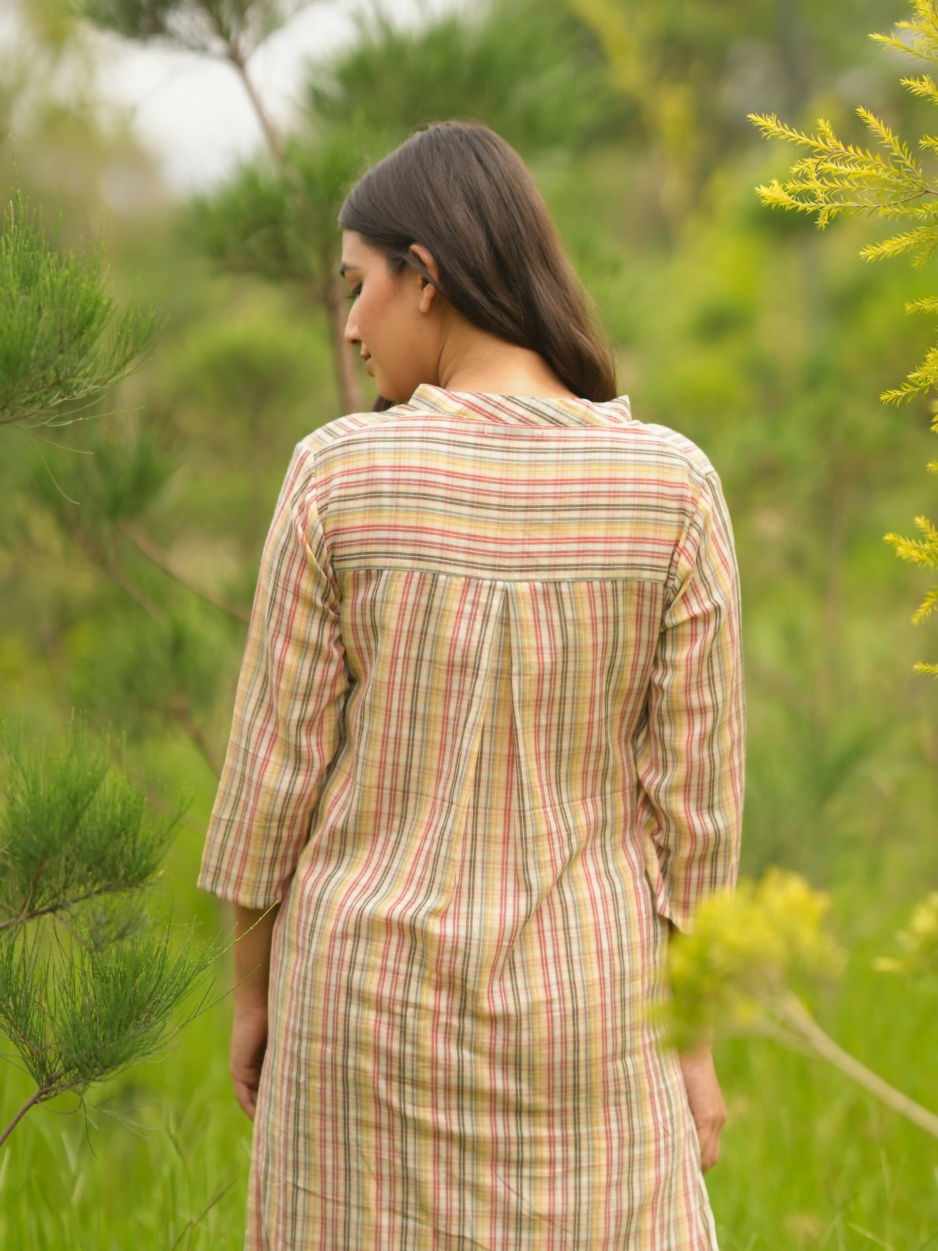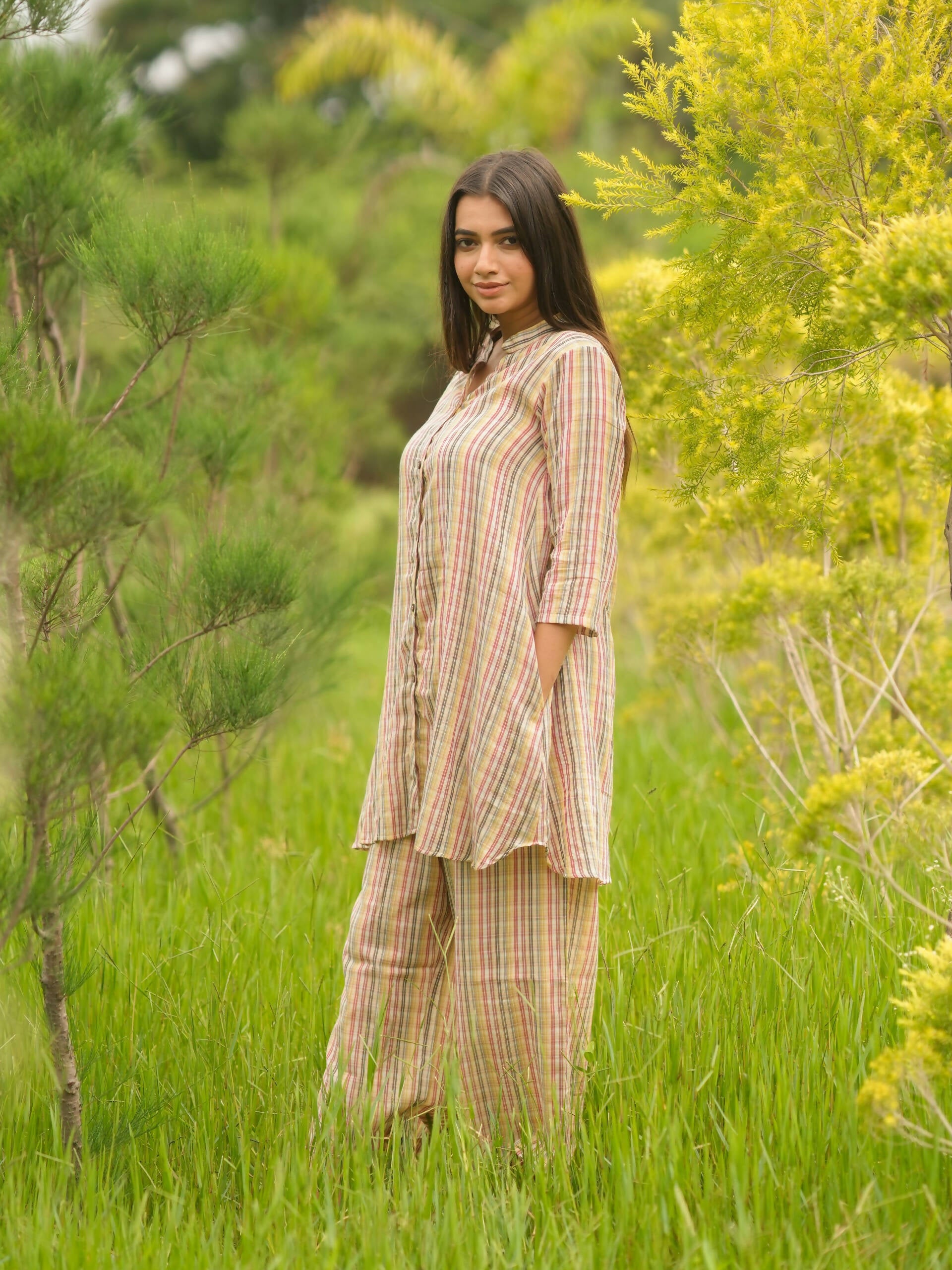 Multicolored Checkered Shirt with mock placket. Shirt is lined with natural colored cotton lining fabric. Paired with coordinated Palazzos.