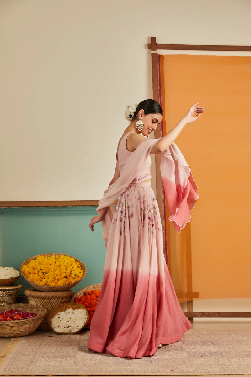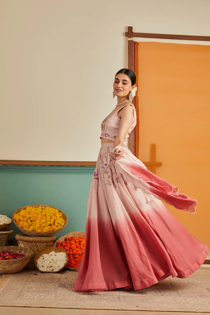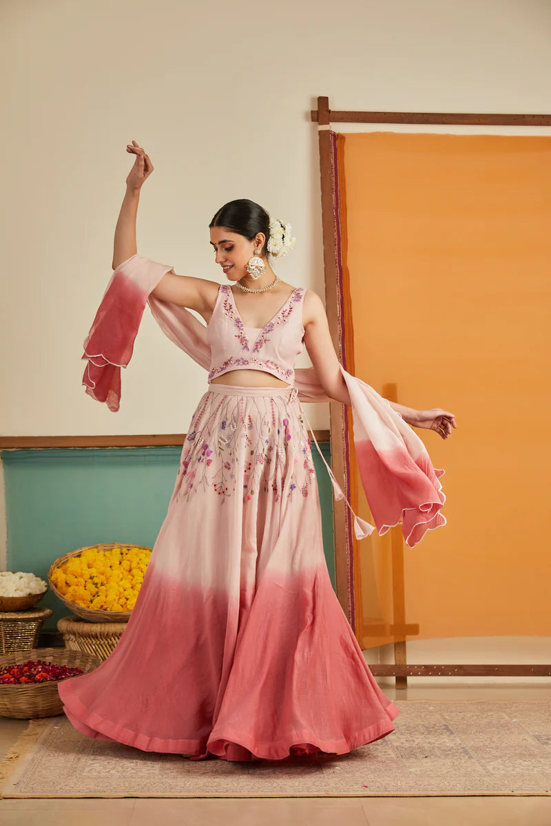 Our Pink Ombre Chanderi Lehenga Set features floral creepers cascading upside down from the waist, creating a mesmerizing spectacle. The choli features a V neckline and a cut-sleeves blouse, adorned with hand-embroidered florals at the neck and waist. The ensemble is completed with an ombré-shaded dupatta, with scalloped edges.