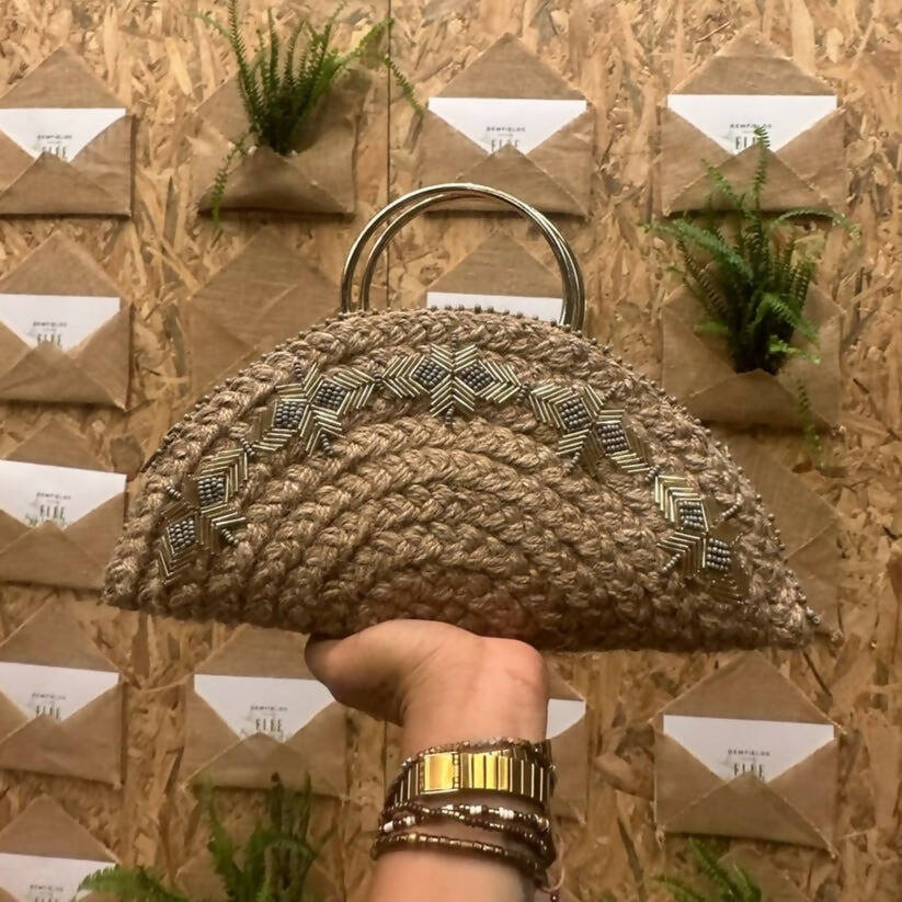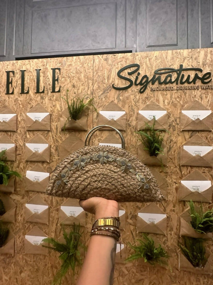 Half Moons are Dhaaga Life's signature design. The bag is handcrafted from a single jute dhaaga (thread). Every bag connoisseur deserves this unique clutch.