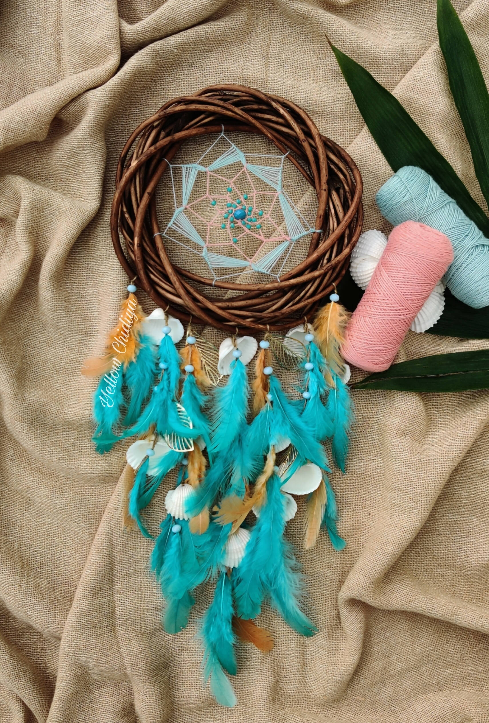 Materials: Cane Wreath, Cotton Thread, Feathers, Shells, Metal Charms