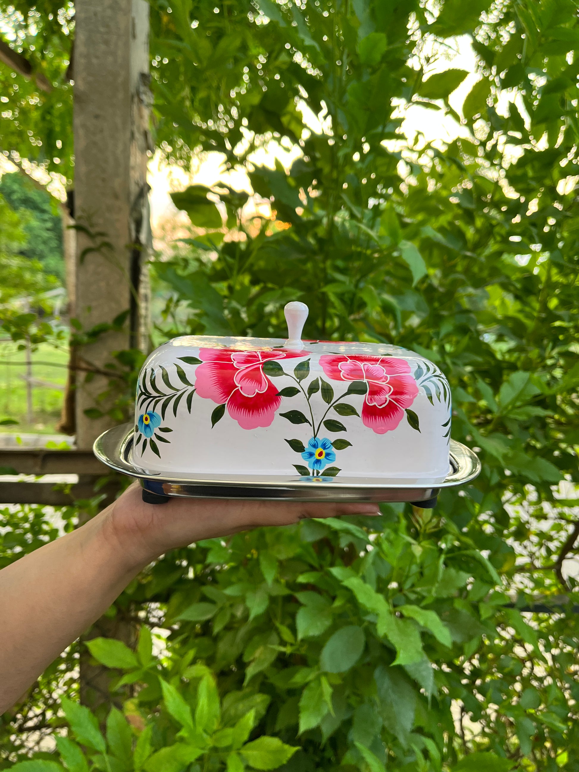 This hand-painted stainless steel butter dish is a perfect addition to any kitchen. The durable stainless steel material ensures long-lasting use, while the hand-painted design adds a touch of elegance. Keep your butter fresh and easily accessible with this stylish and functional dish.