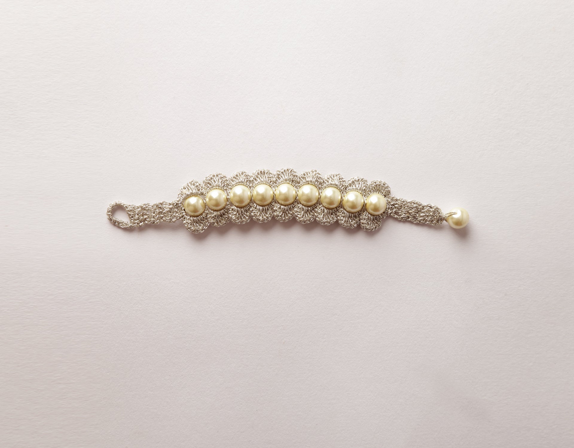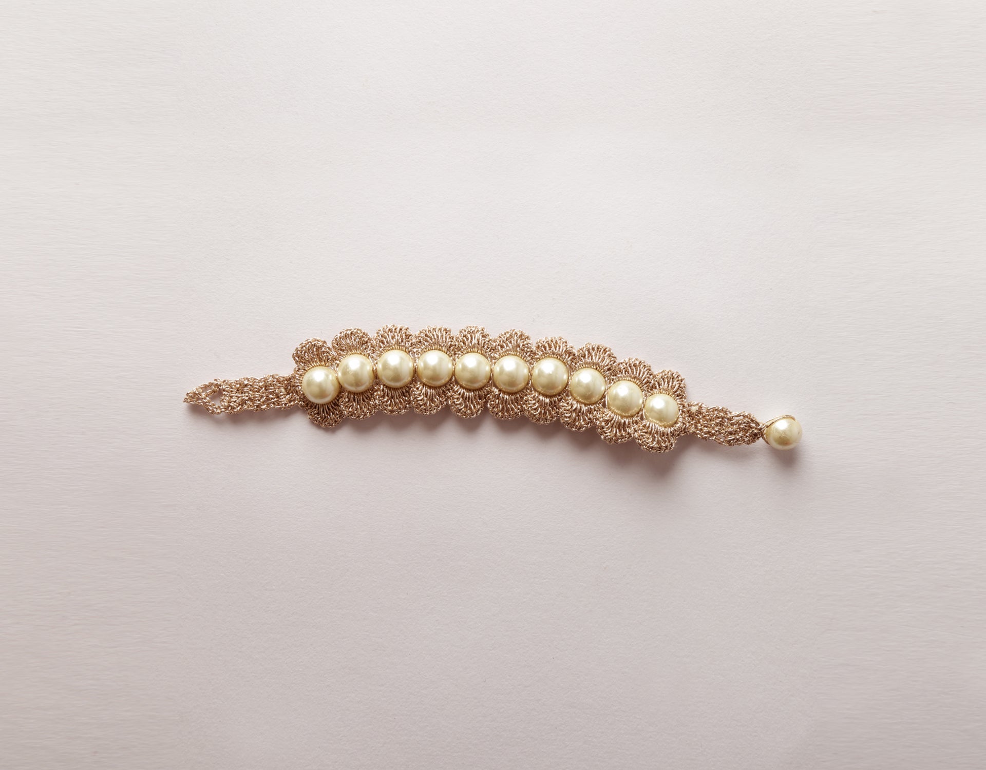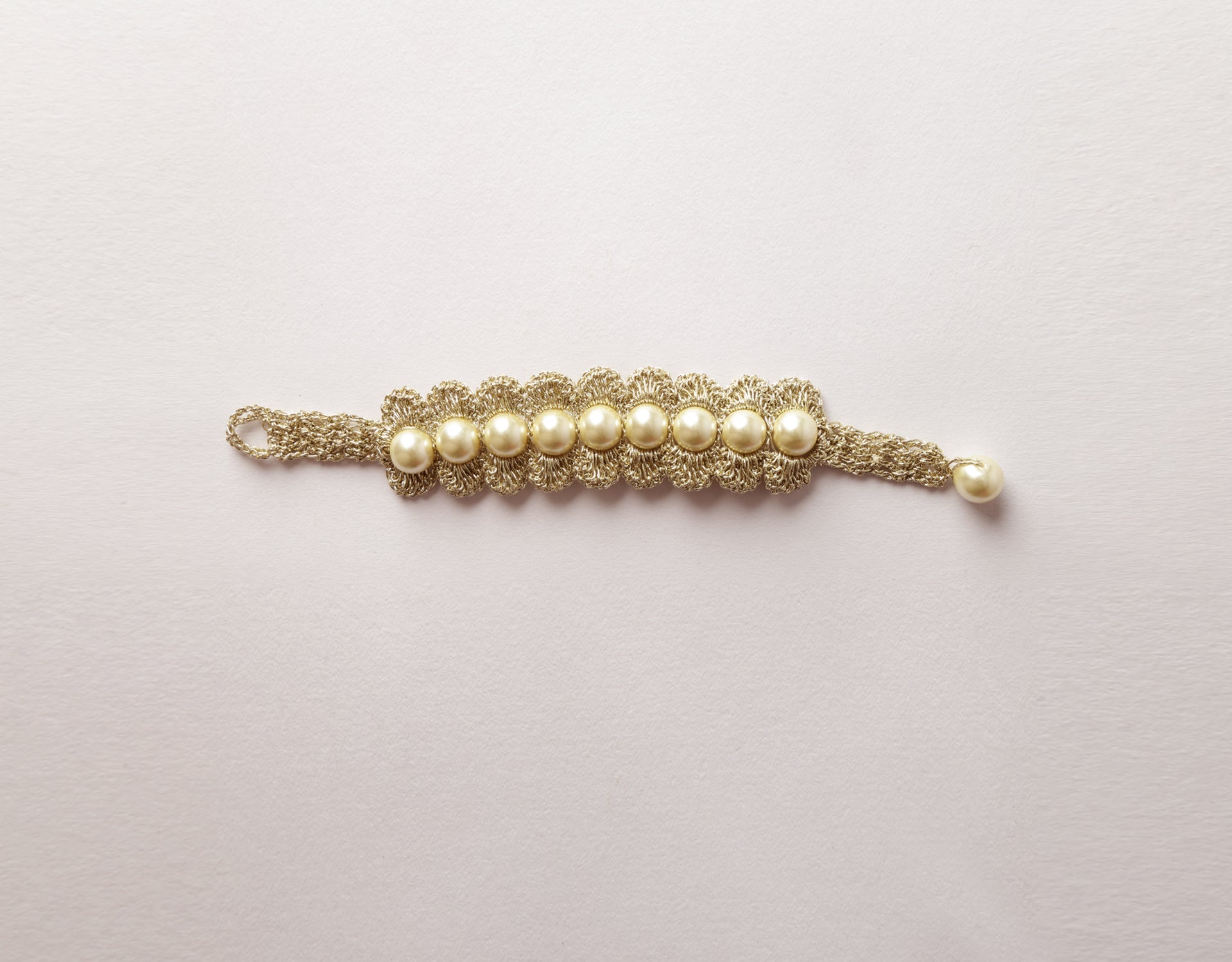 Materials: Metallic thread, Off-white pearl bead