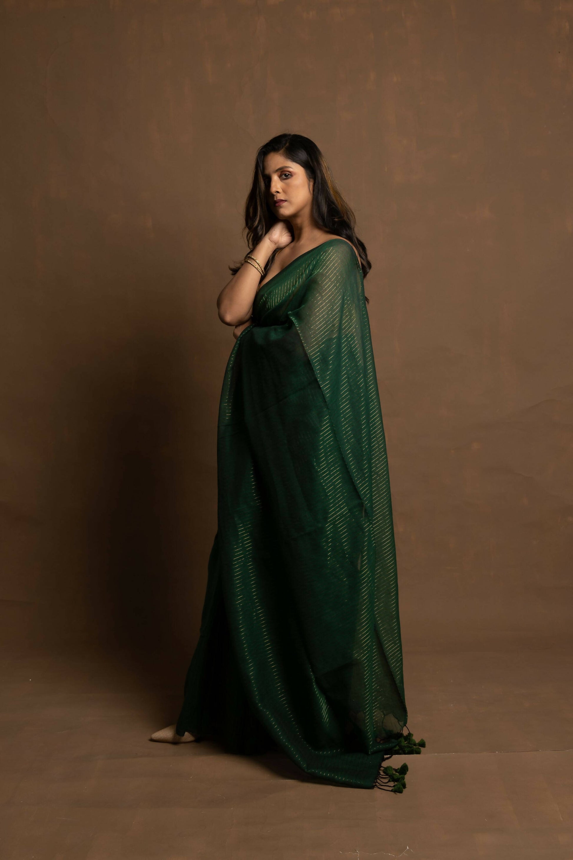 Handloom cotton saree with zari stripes which is a classic and can be styled in multiple ways! Style it for a casual event or pair it with heavy jewellery for an intimate event. You can also opt for contrasting blouse to make a statement!