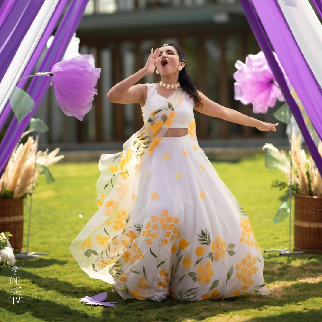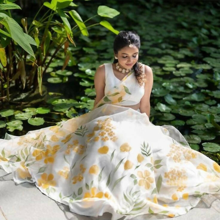 Stitched organza hand-painted lehenga with organza hand-painted dupatta. Both the lehenga and dupatta are enhanced with sequins work.