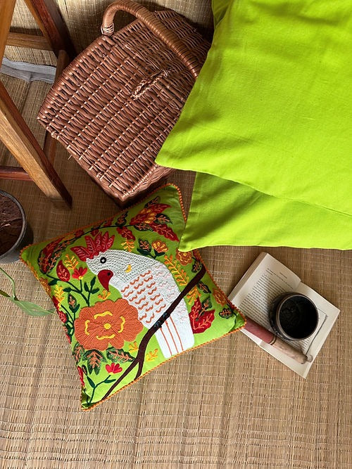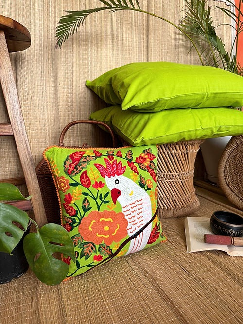 Brighten up your home with these beautiful cushion covers! The embroidered Cockatoo cushion brings a playful, tropical vibe with its detailed bird design. The 'Harit' cushion cover in solid green adds a refreshing, natural touch to any room, making them the perfect pair for a lively and stylish decor.