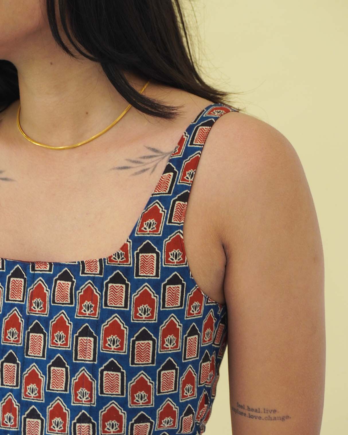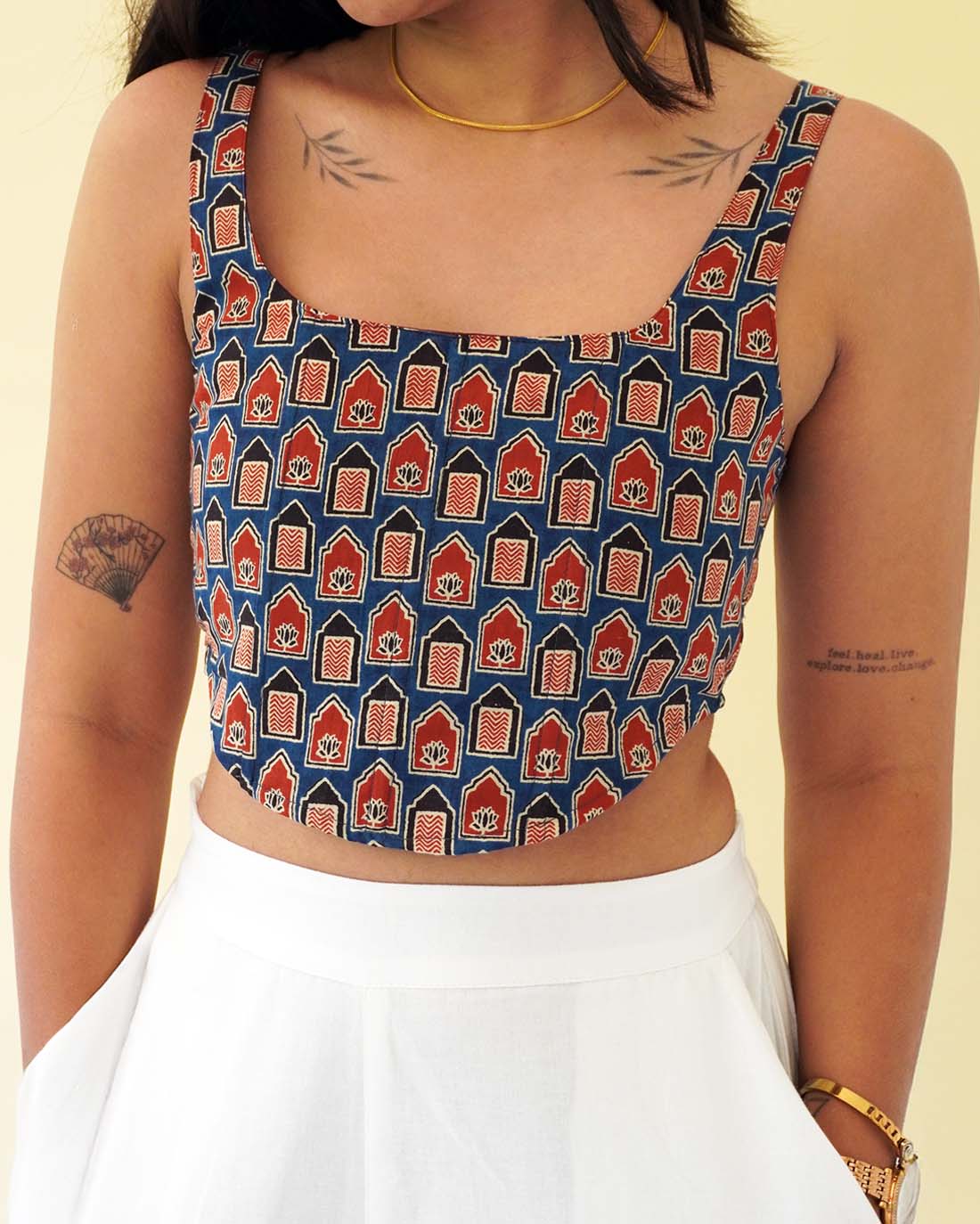 The Haveli Cotton Corset is a unique blend of comfort and cultural charm, crafted from breathable, high-quality cotton for a lightweight and relaxed fit. Inspired by the intricate patterns and timeless allure of haveli architecture, this corset features delicate detailings.