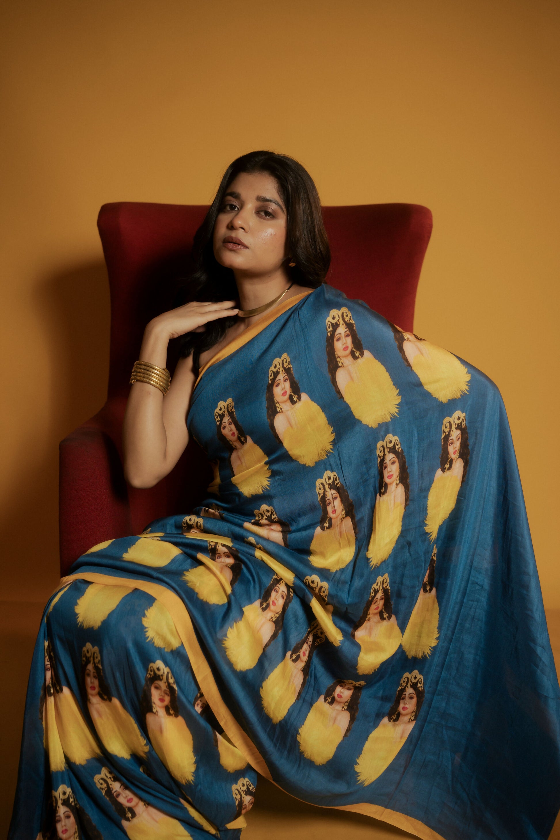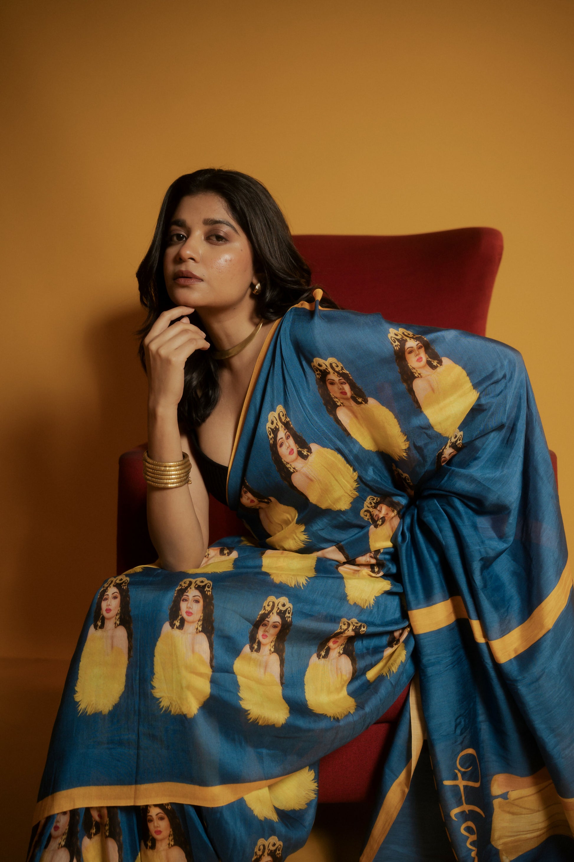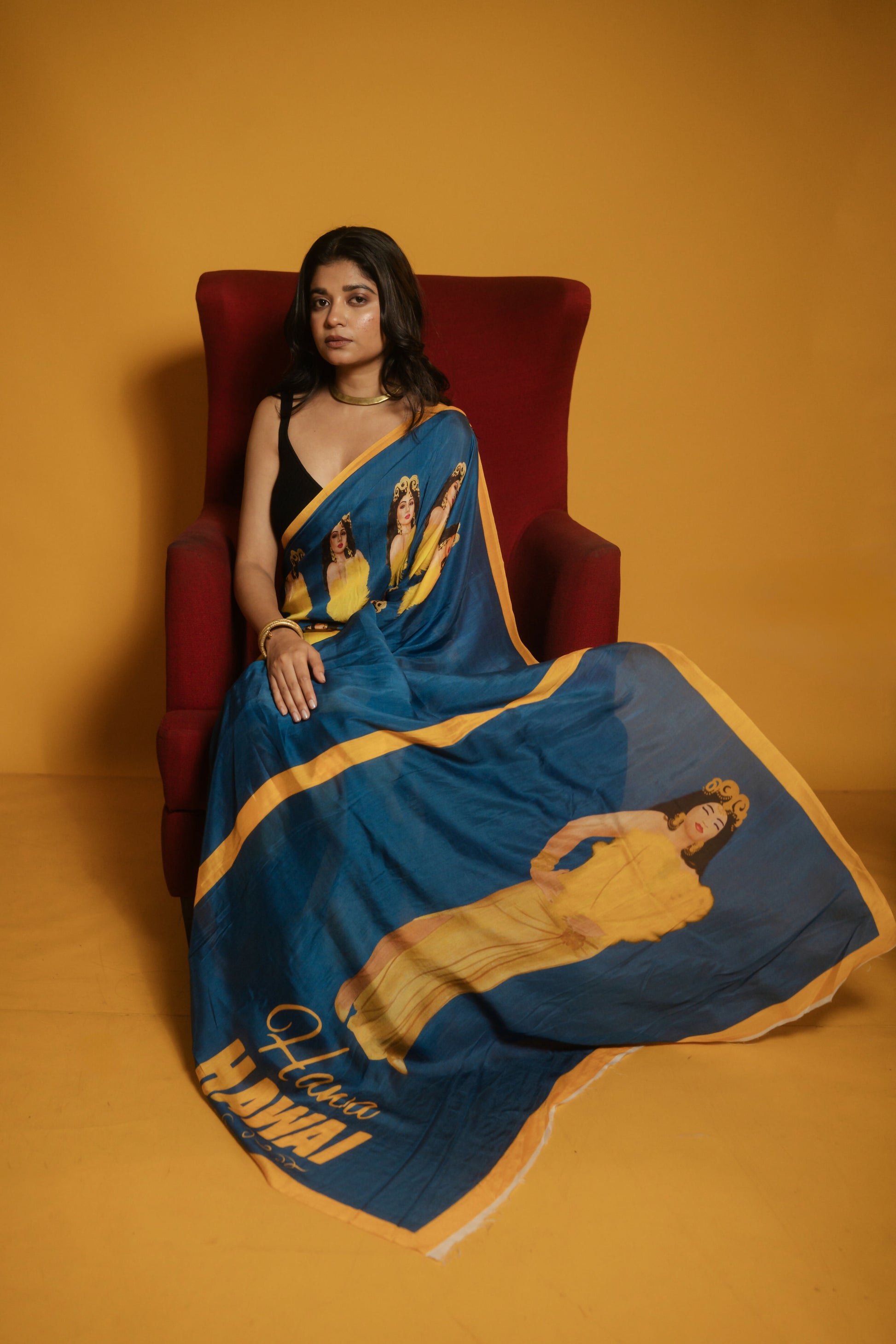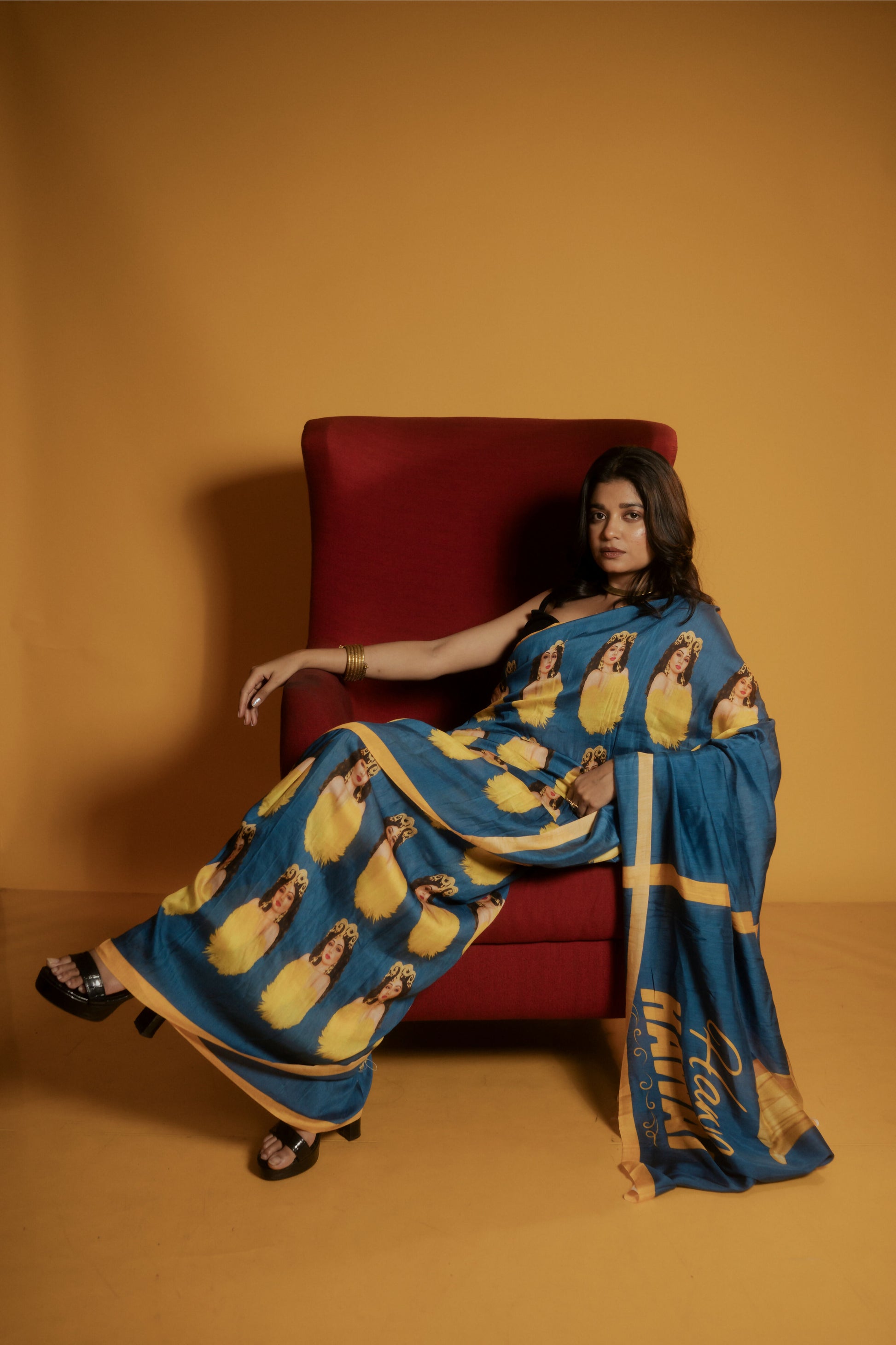This exquisite Bollywood-inspired saree is the perfect choice for retro-themed parties, designed to make you the center of attention. Crafted from luxurious Silk, it drapes gracefully, exuding elegance and charm. Embrace your inner Bollywood diva and make a lasting impression with this timeless statement piece.