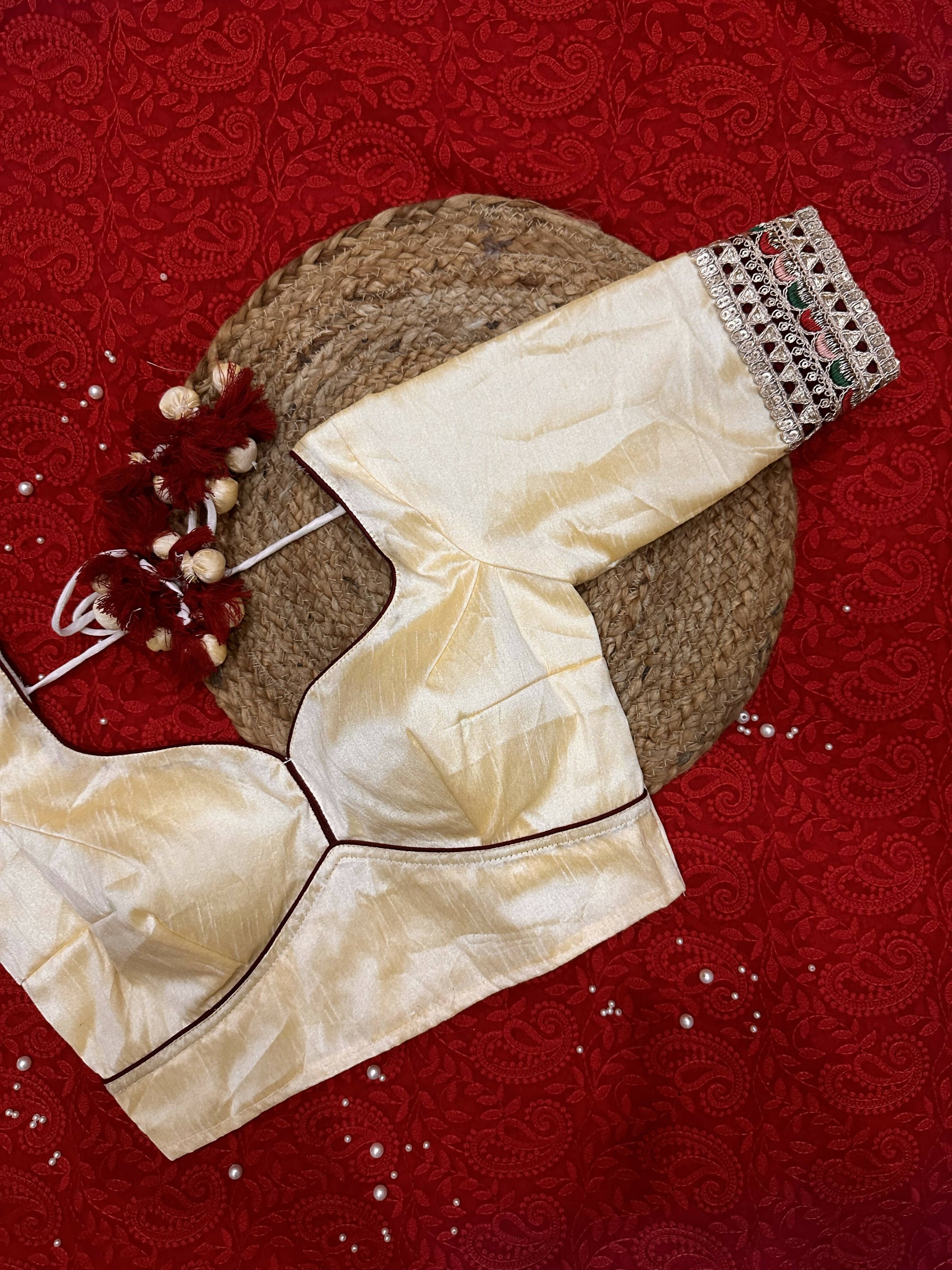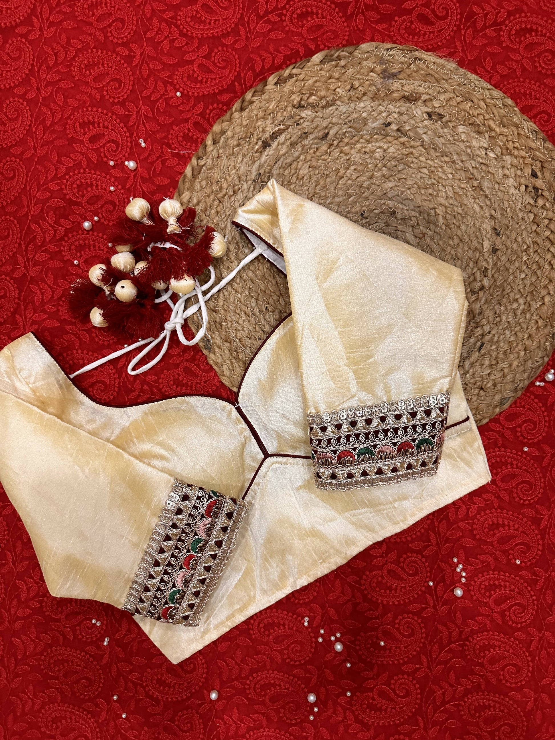 Elegantly designed to complement any saree, this blouse is a timeless fusion of tradition and style. And a perfect piece to add a statement to your attire! Pair it with a monotone saree or go all over by pairing it with a contrast saree. This one will surely will be a statement piece in your wardrobe.