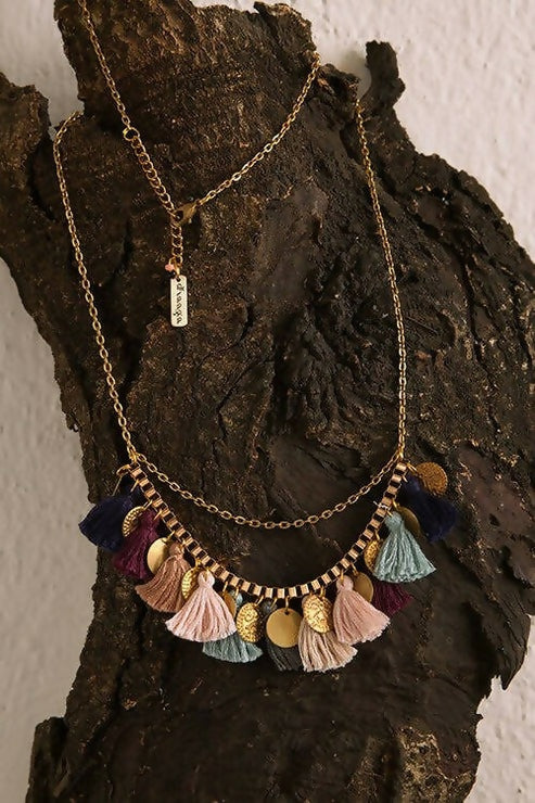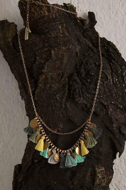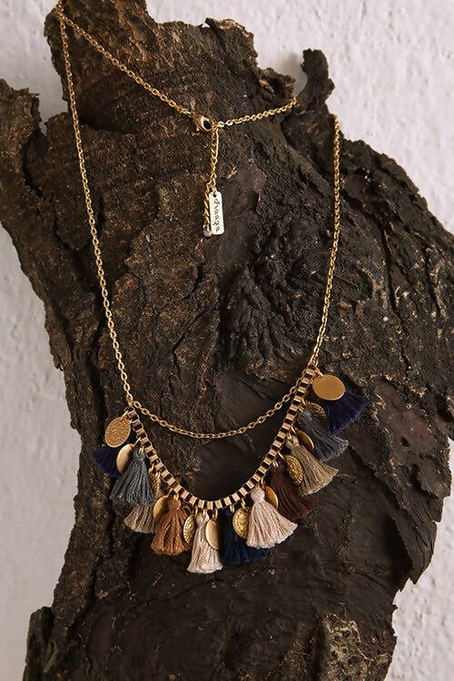 Handmade rose gold box double layered chain necklace has a combination of subtle colour tassels along with embossed brass coins that add to the charm. The colours gives the vibe of forest or desert. Get your safari mode on with with this colour combinations.