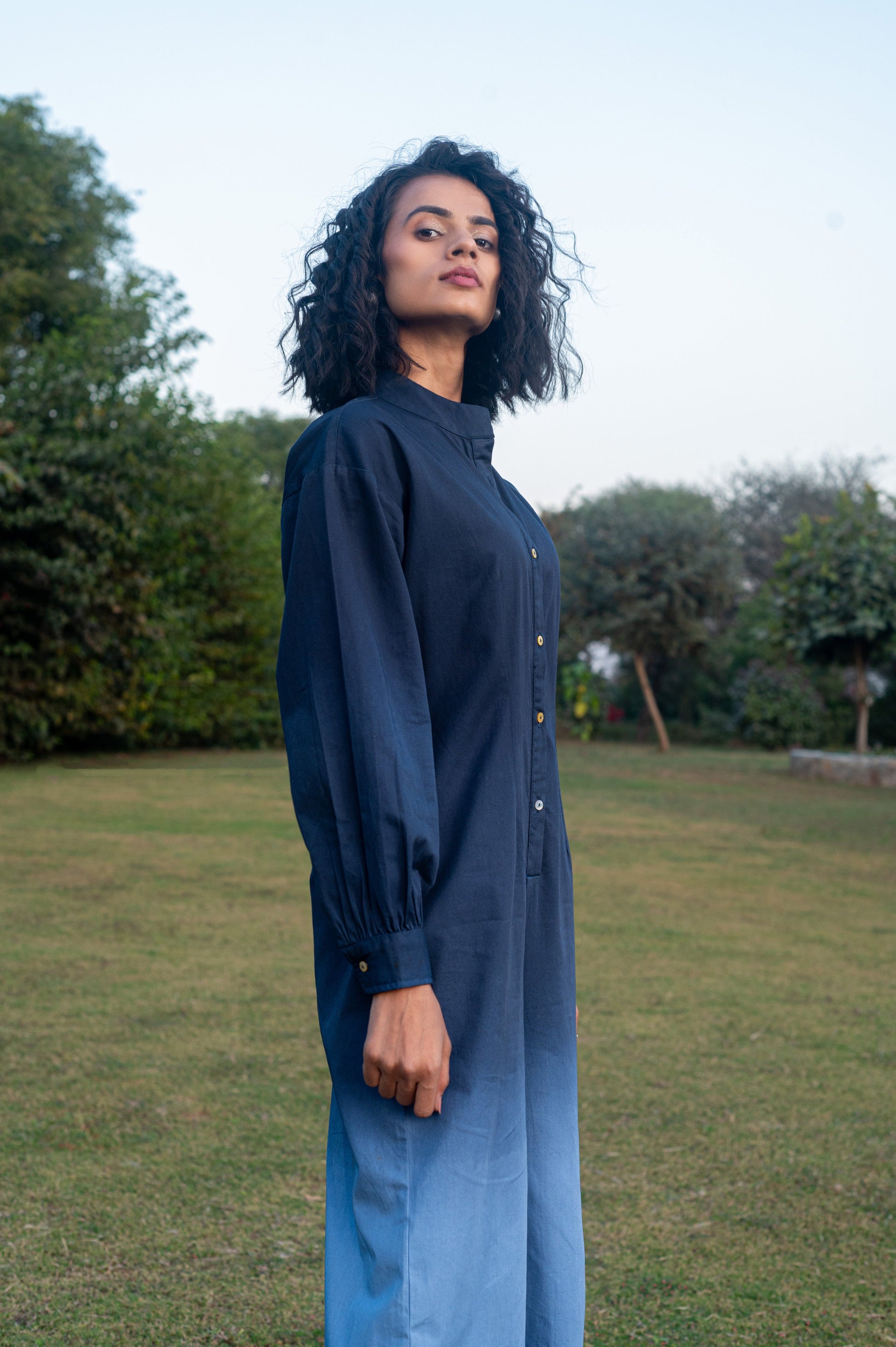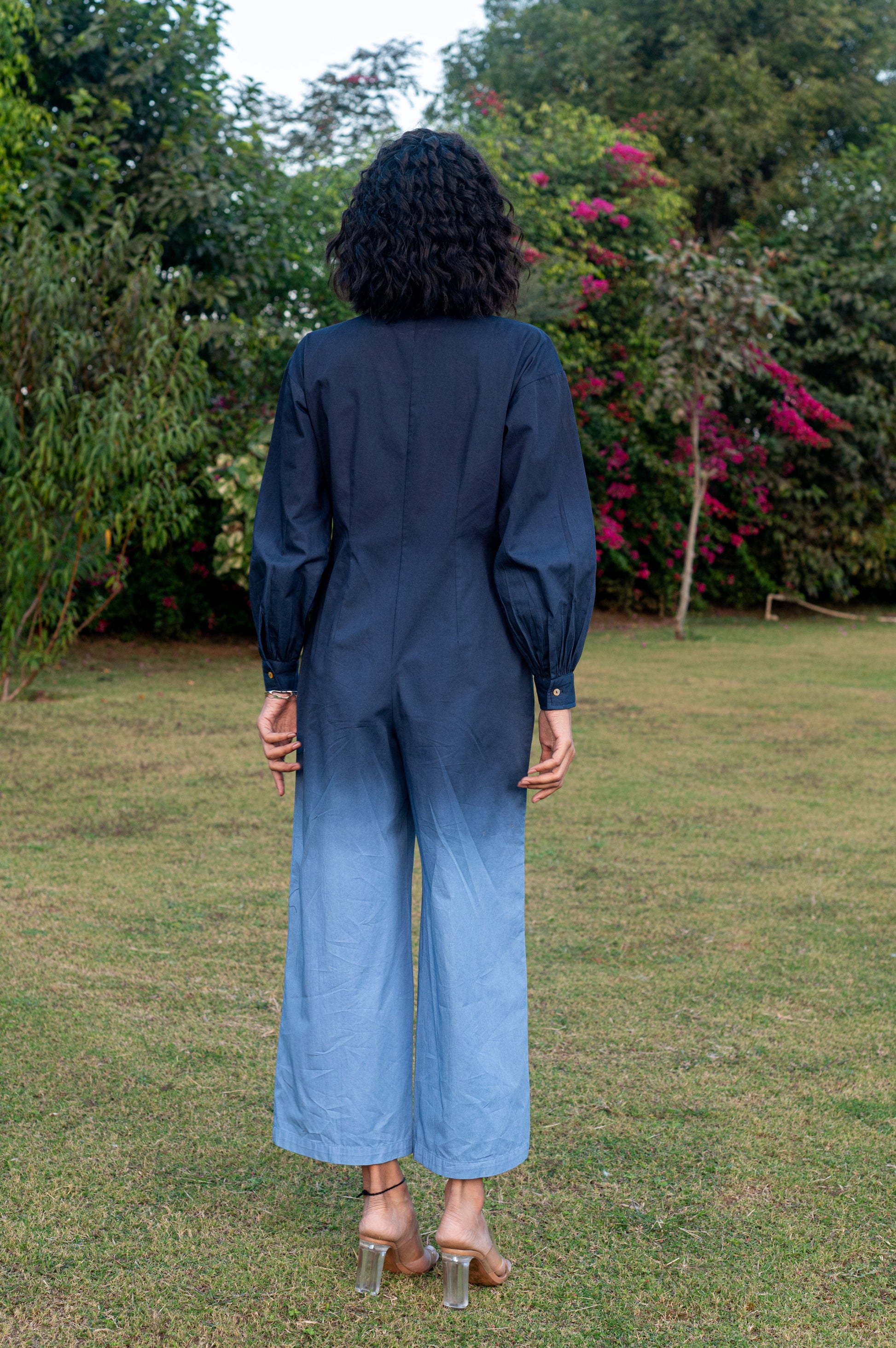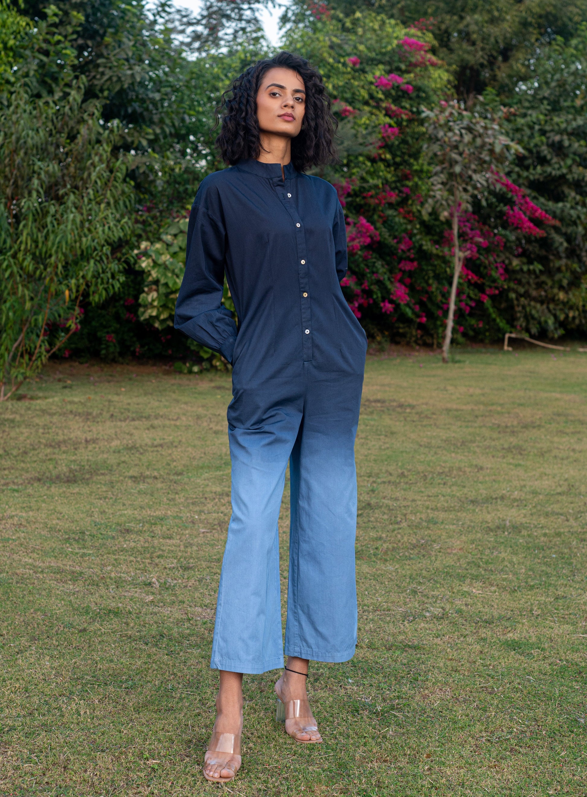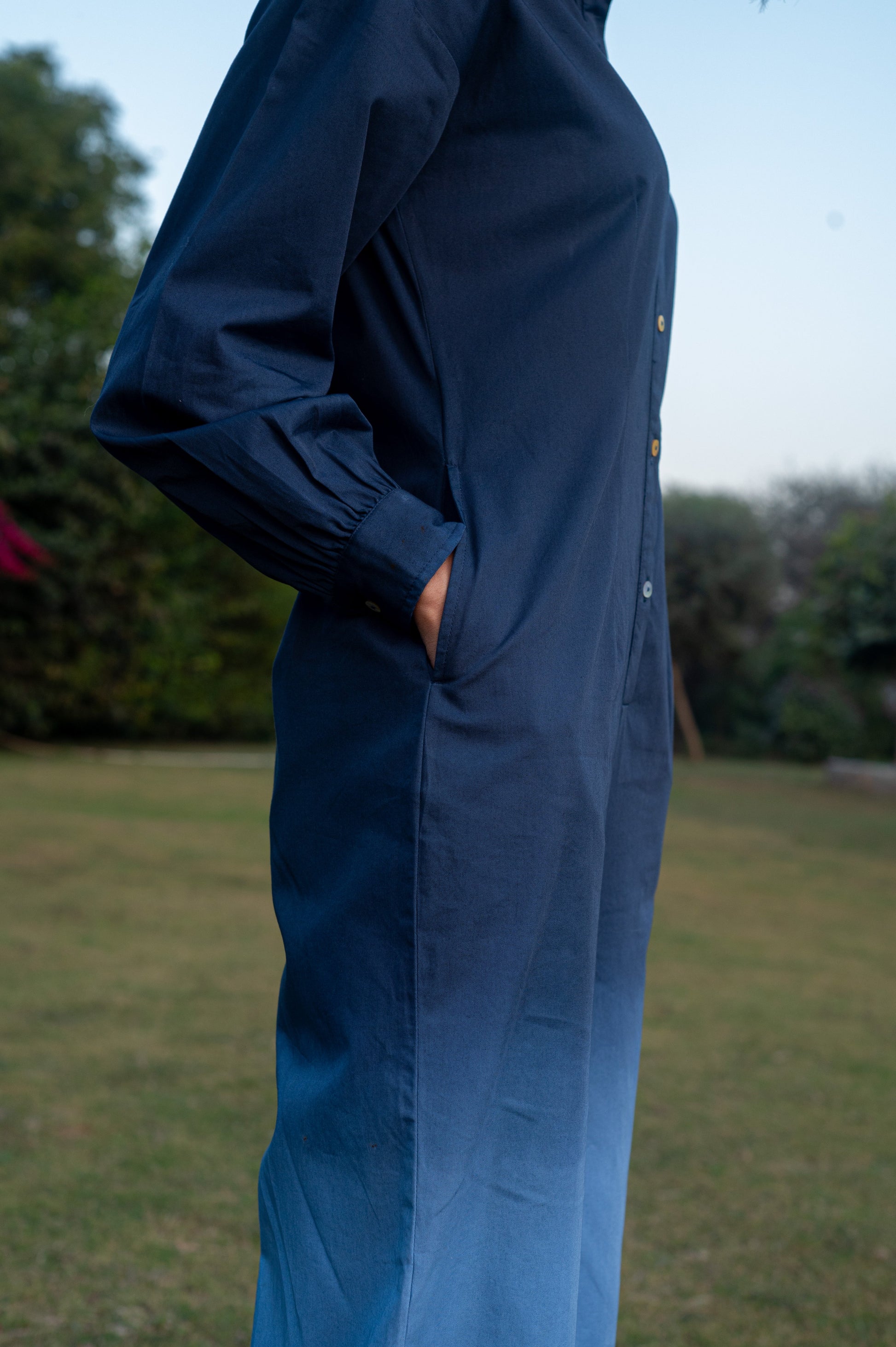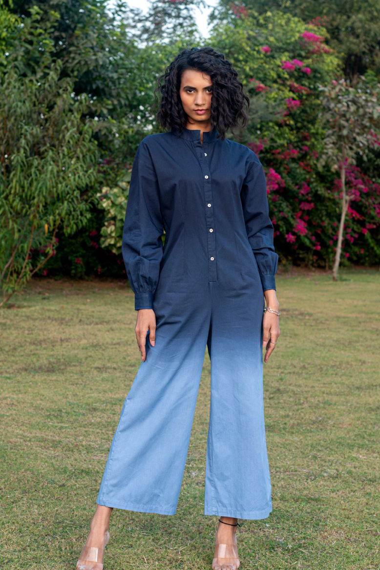 Hester jumpsuit seamlessly blends comfort and style with its full sleeves and striking long placket, featuring a soothing ombre effect that gracefully transitions through the fabric. The ombre design adds a modern, dynamic touch, making this piece perfect for both casual and dressier winter occasions.