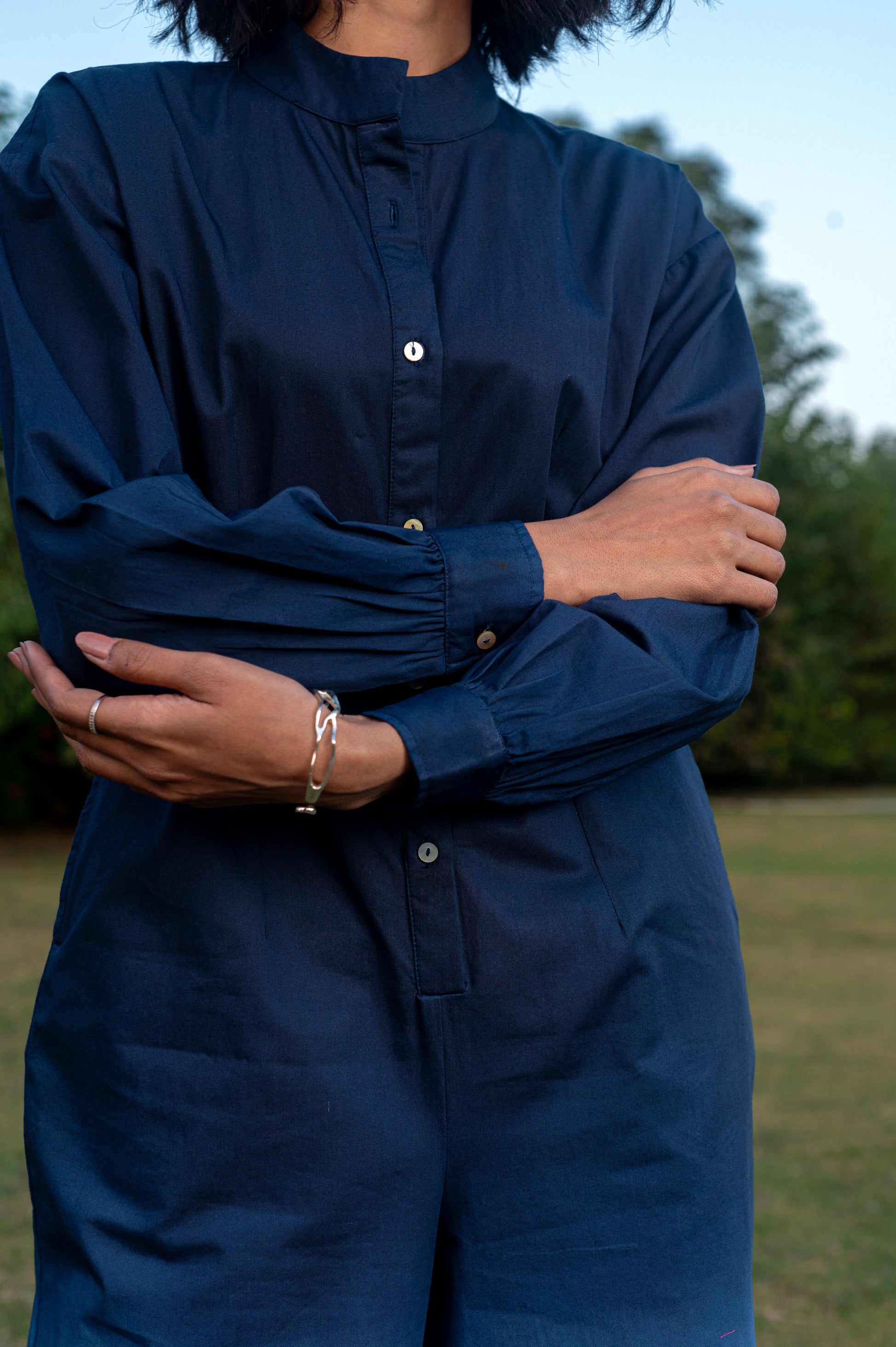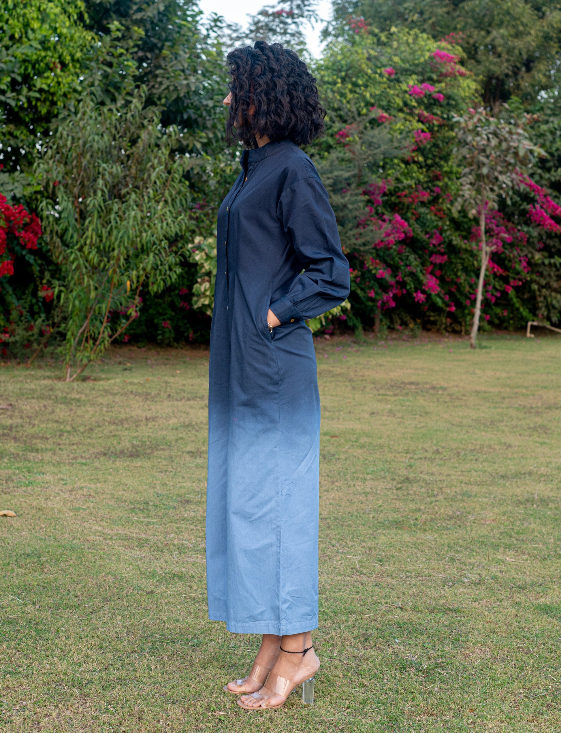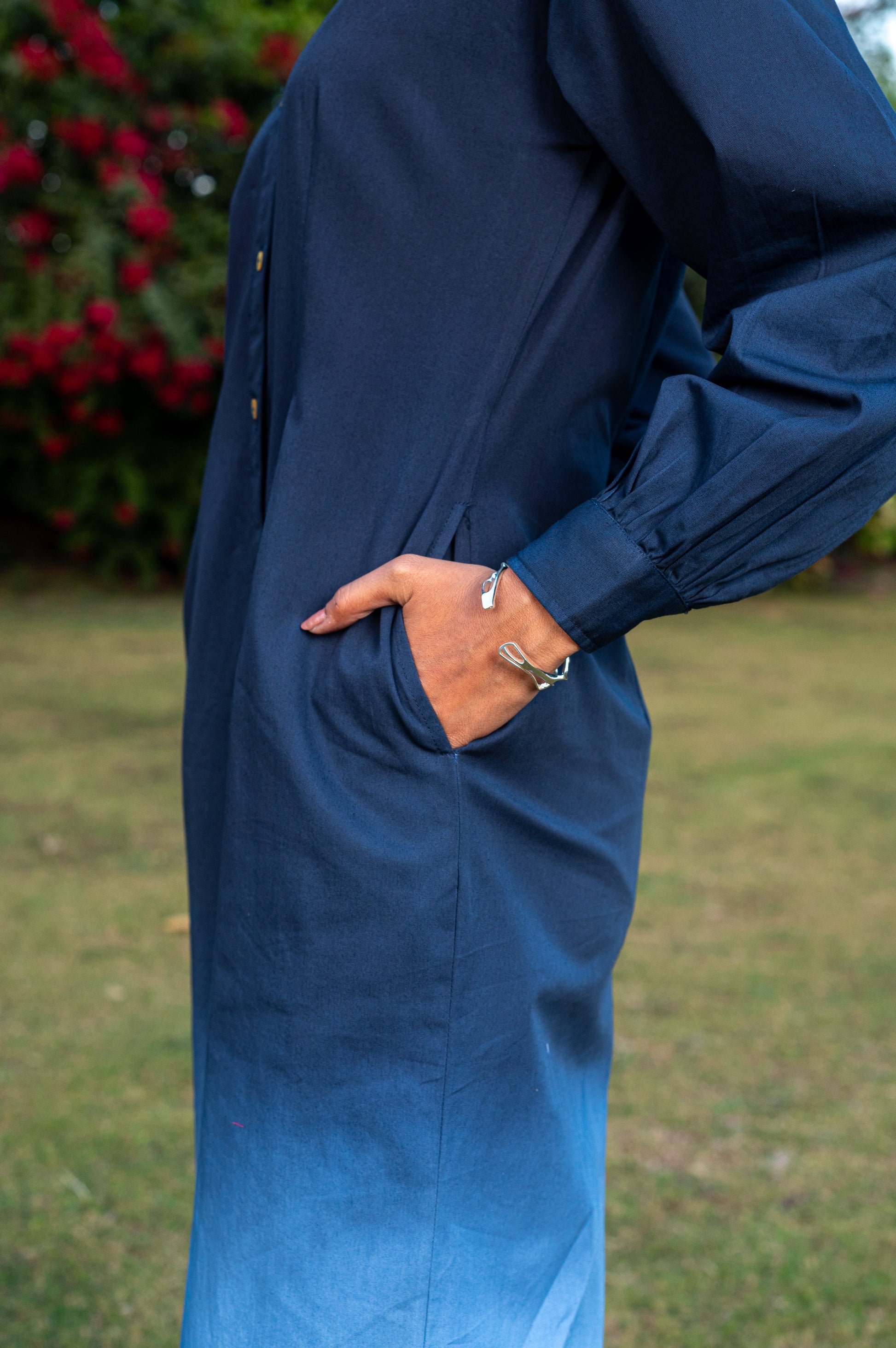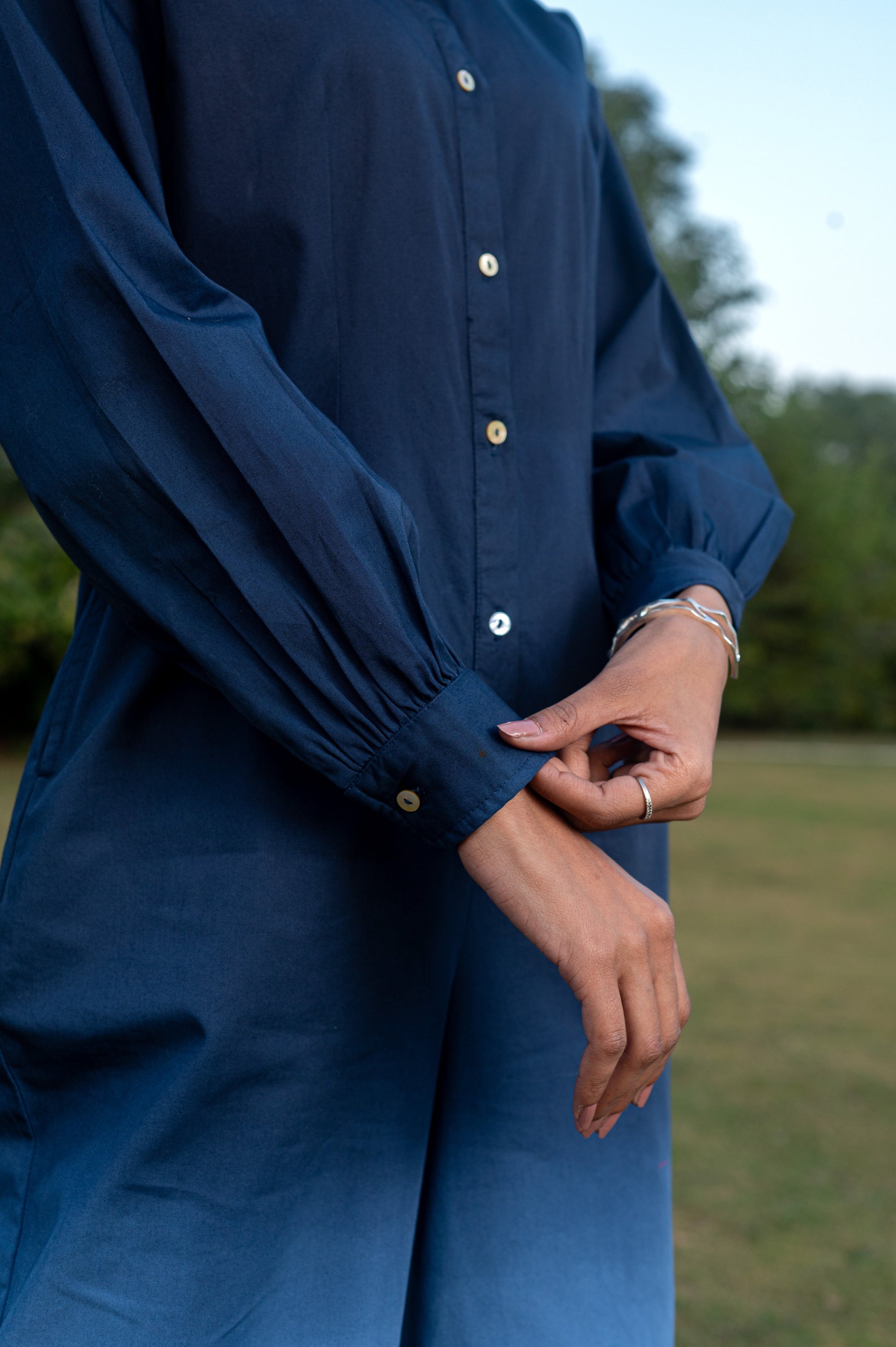 Hester jumpsuit seamlessly blends comfort and style with its full sleeves and striking long placket, featuring a soothing ombre effect that gracefully transitions through the fabric. The ombre design adds a modern, dynamic touch, making this piece perfect for both casual and dressier winter occasions.