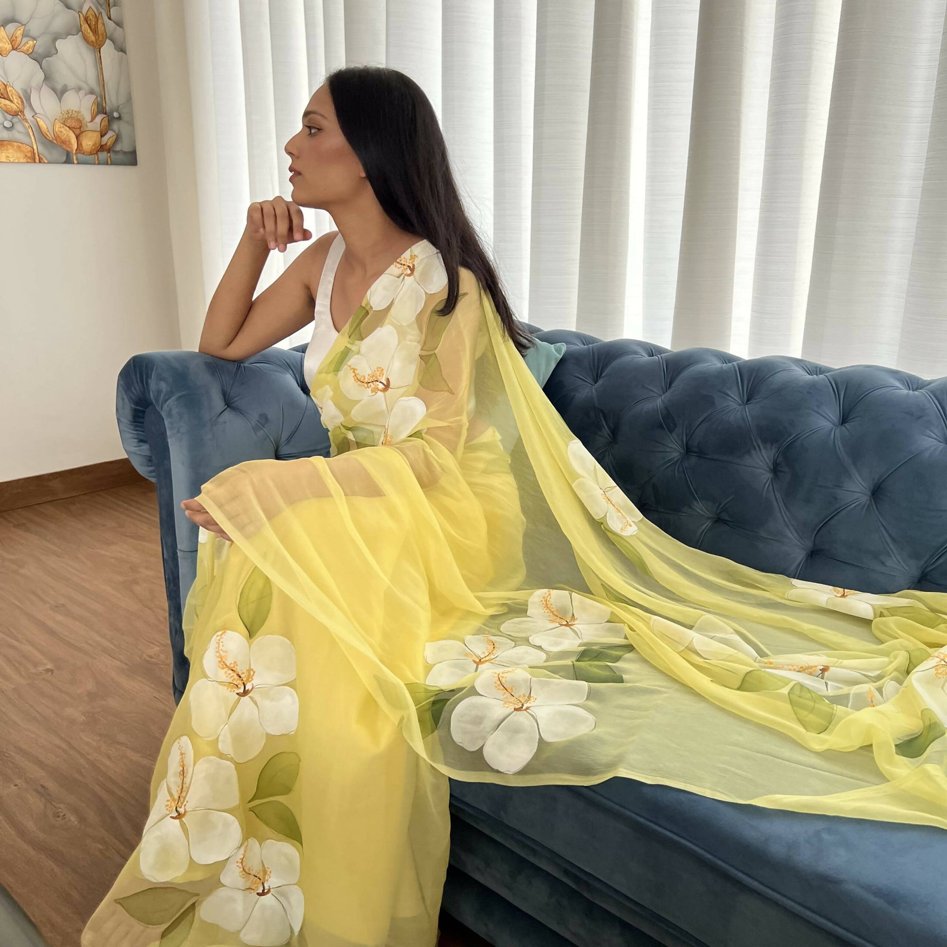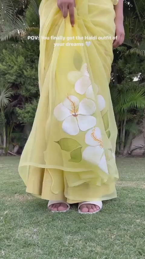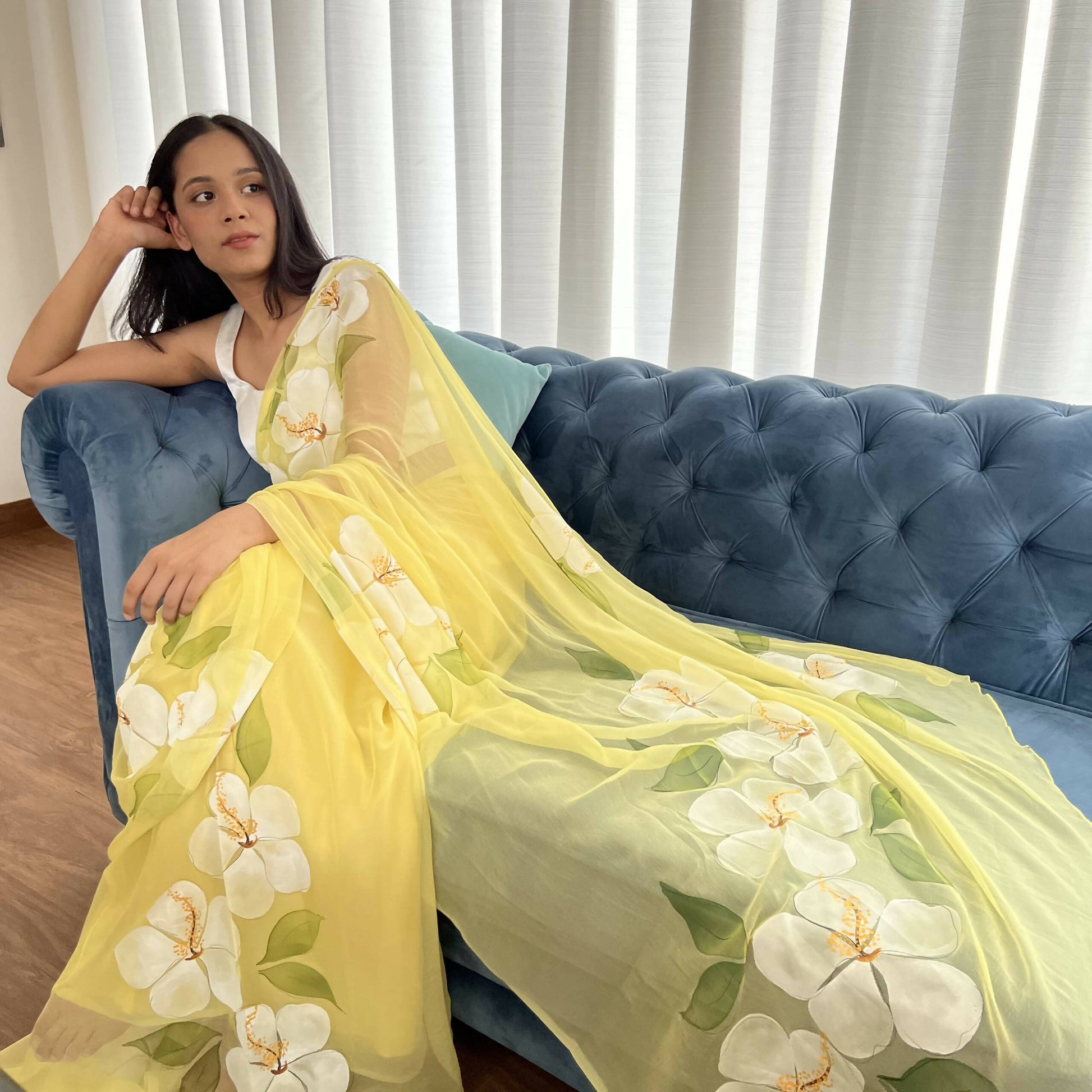 Yellow base chiffon saree hand-painted with white hibiscus flowers. The saree comes with an unstitched silk blouse piece similar to the base colour of the saree.