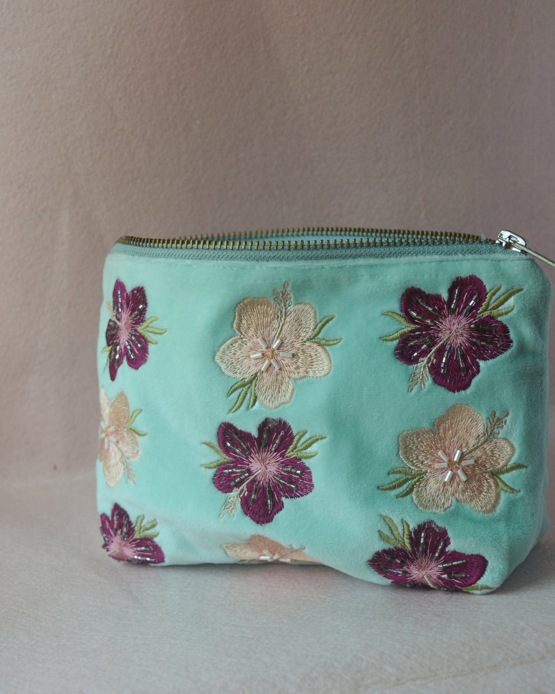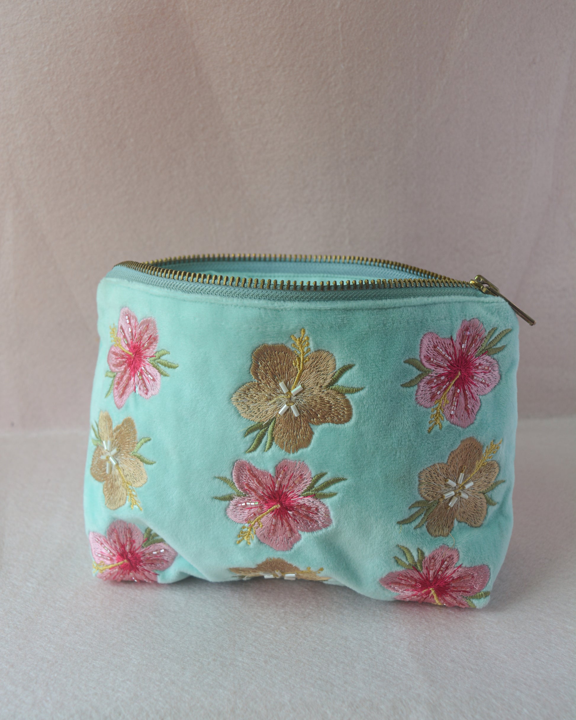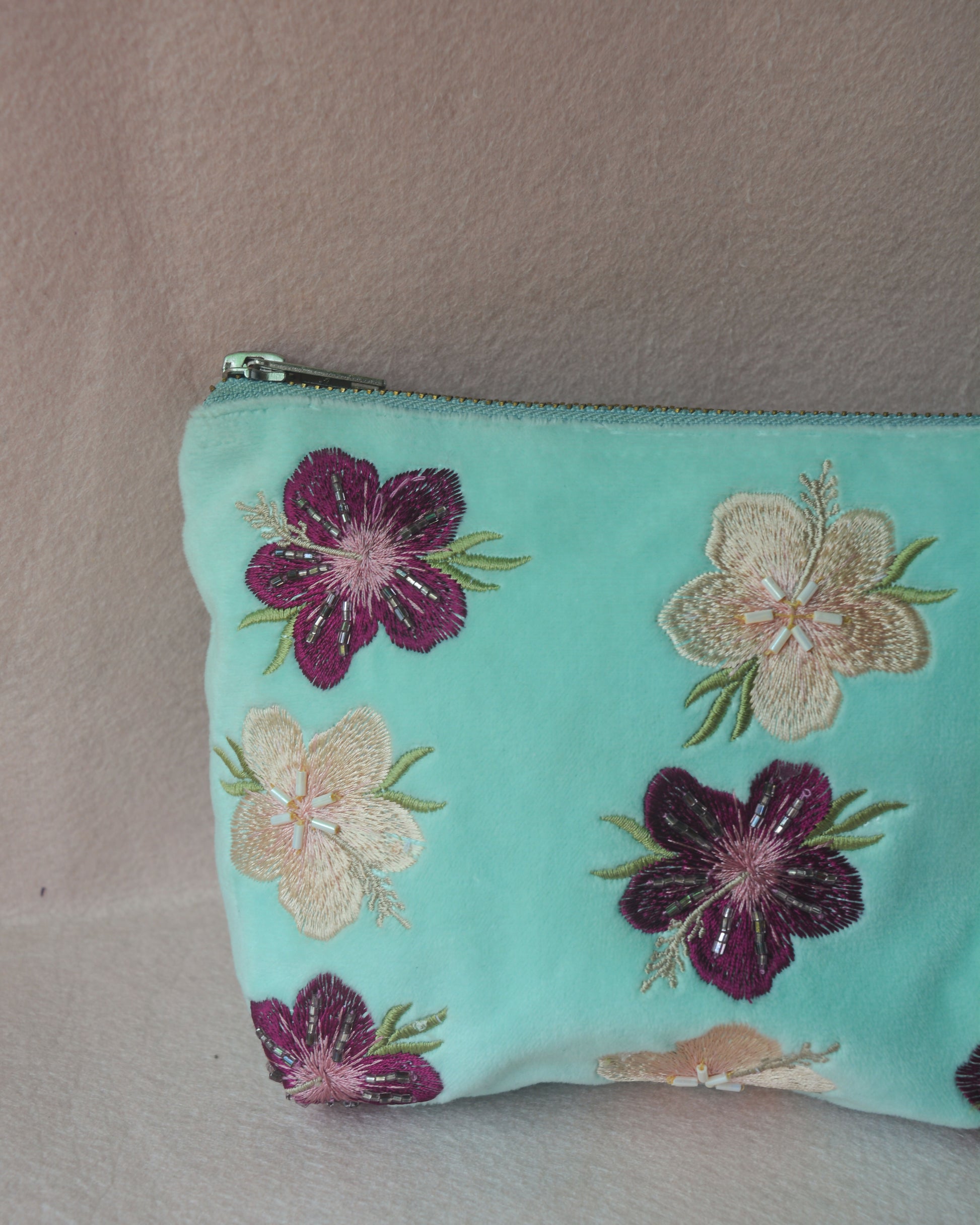 Part of our "Beach Please" summer edit, this turquoise blue mid sized pouch is made using soft, luxurious velvet fabric with thoughtfully embroidered hibiscus flower motifs, and to further enhance its look, the pouch has hand-sewn intricate glass beads detailing over it. This pouch is the perfect everyday carry along bag, sized perfectly to store all your everyday essentials and more. It is made to fit in your handbag and doubles up as a statement purse too. Available in two different colors - pink & beige, purple & light peach