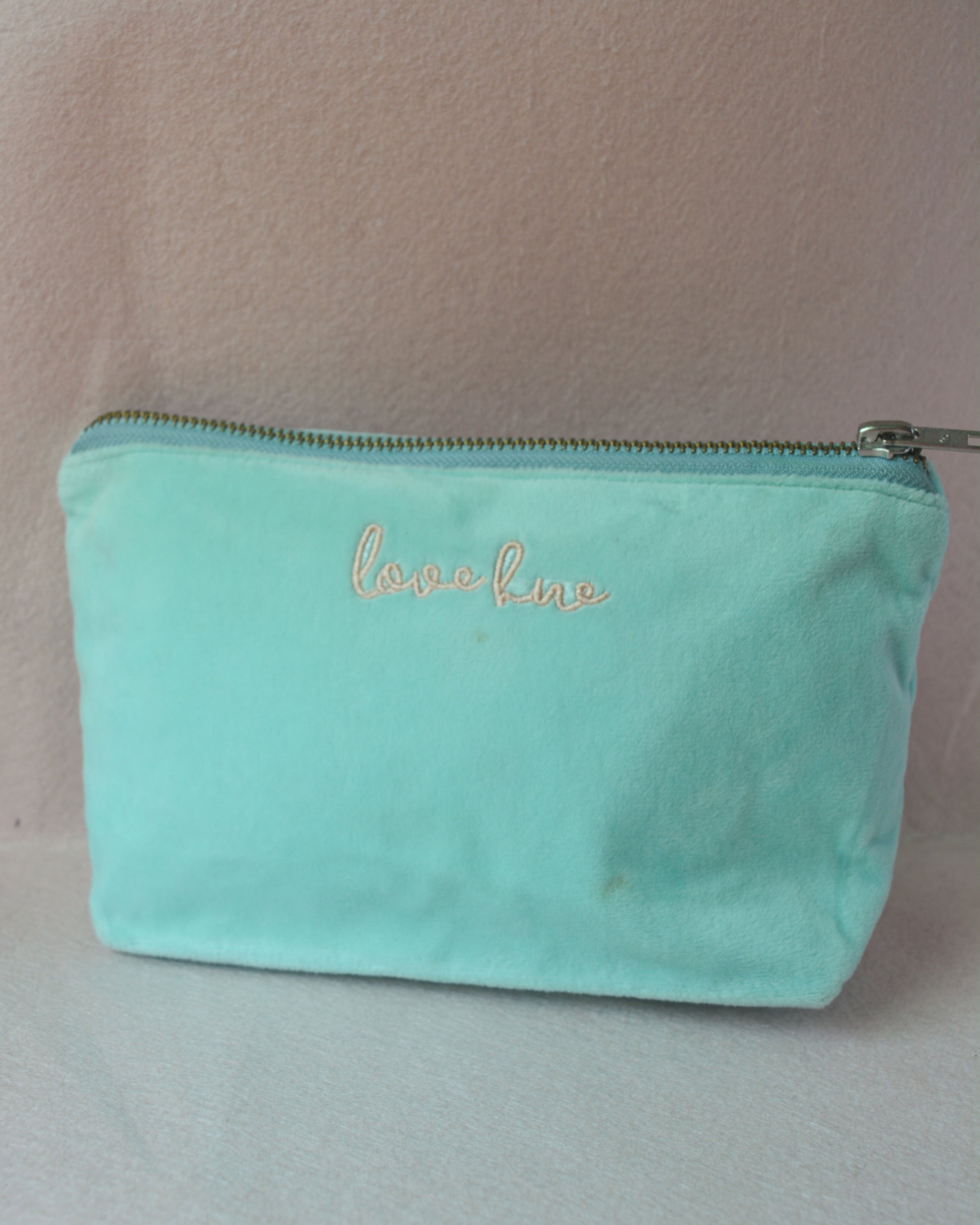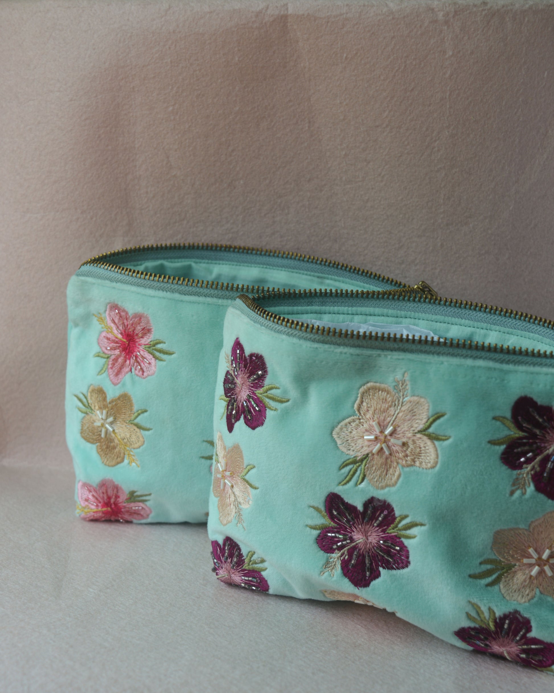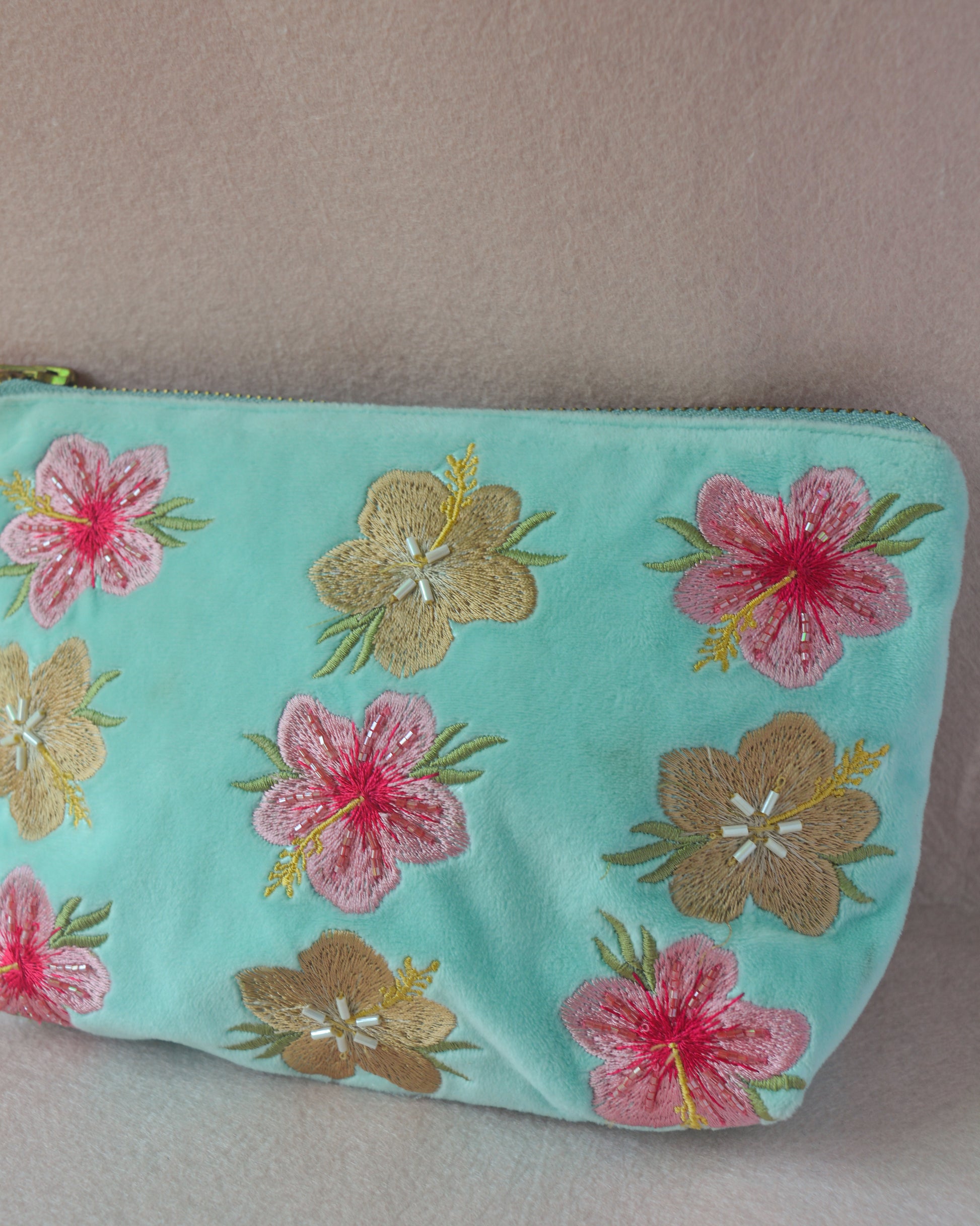 Part of our "Beach Please" summer edit, this turquoise blue mid sized pouch is made using soft, luxurious velvet fabric with thoughtfully embroidered hibiscus flower motifs, and to further enhance its look, the pouch has hand-sewn intricate glass beads detailing over it. This pouch is the perfect everyday carry along bag, sized perfectly to store all your everyday essentials and more. It is made to fit in your handbag and doubles up as a statement purse too. Available in two different colors - pink & beige, purple & light peach