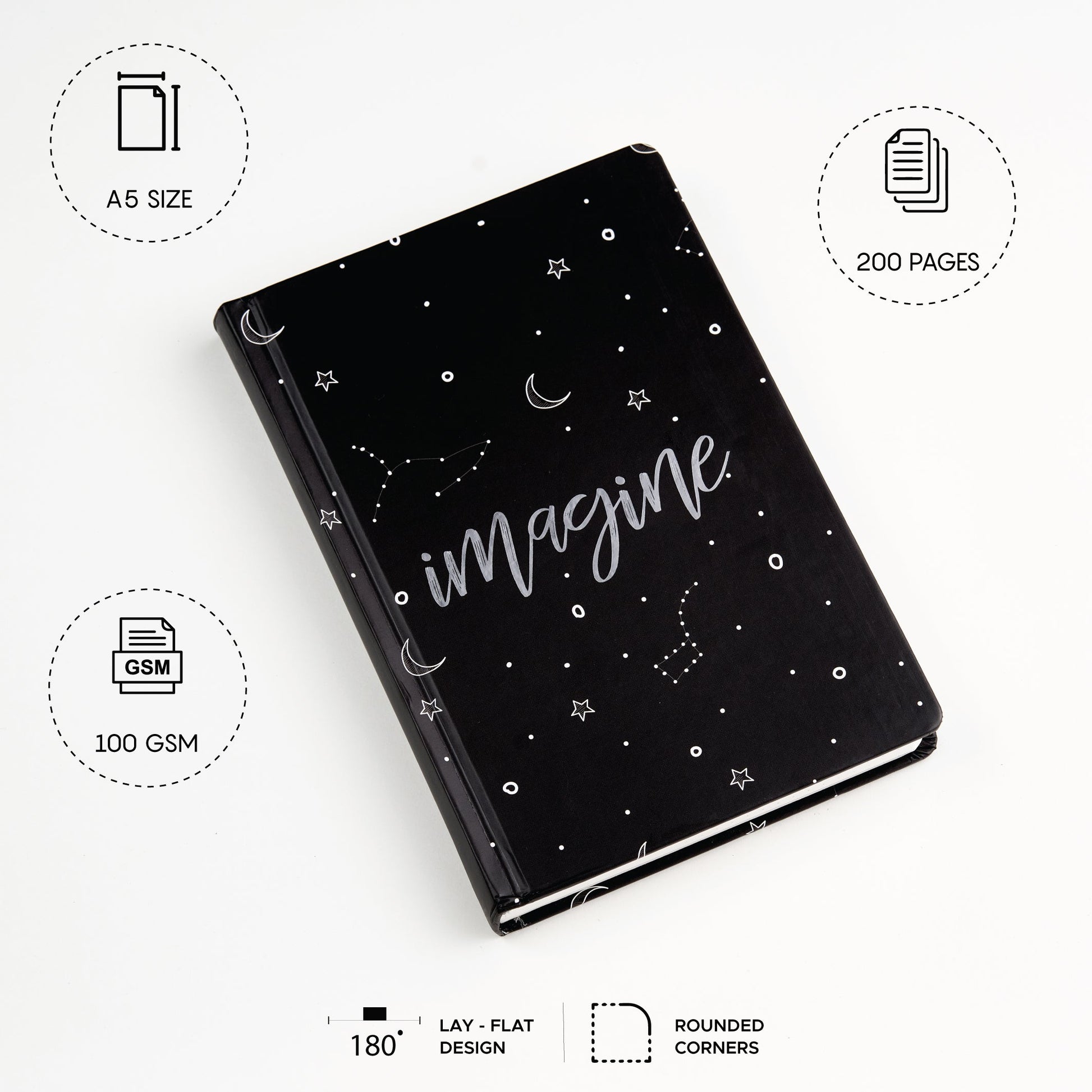 Features that matter: A5 | 100 GSM | 200 pages | Dot Grids | 3 Bookmarks to stay on track | Elastic Closure | Flat-lay Ergonomics | Rounded Corners | Hardbound Cover.