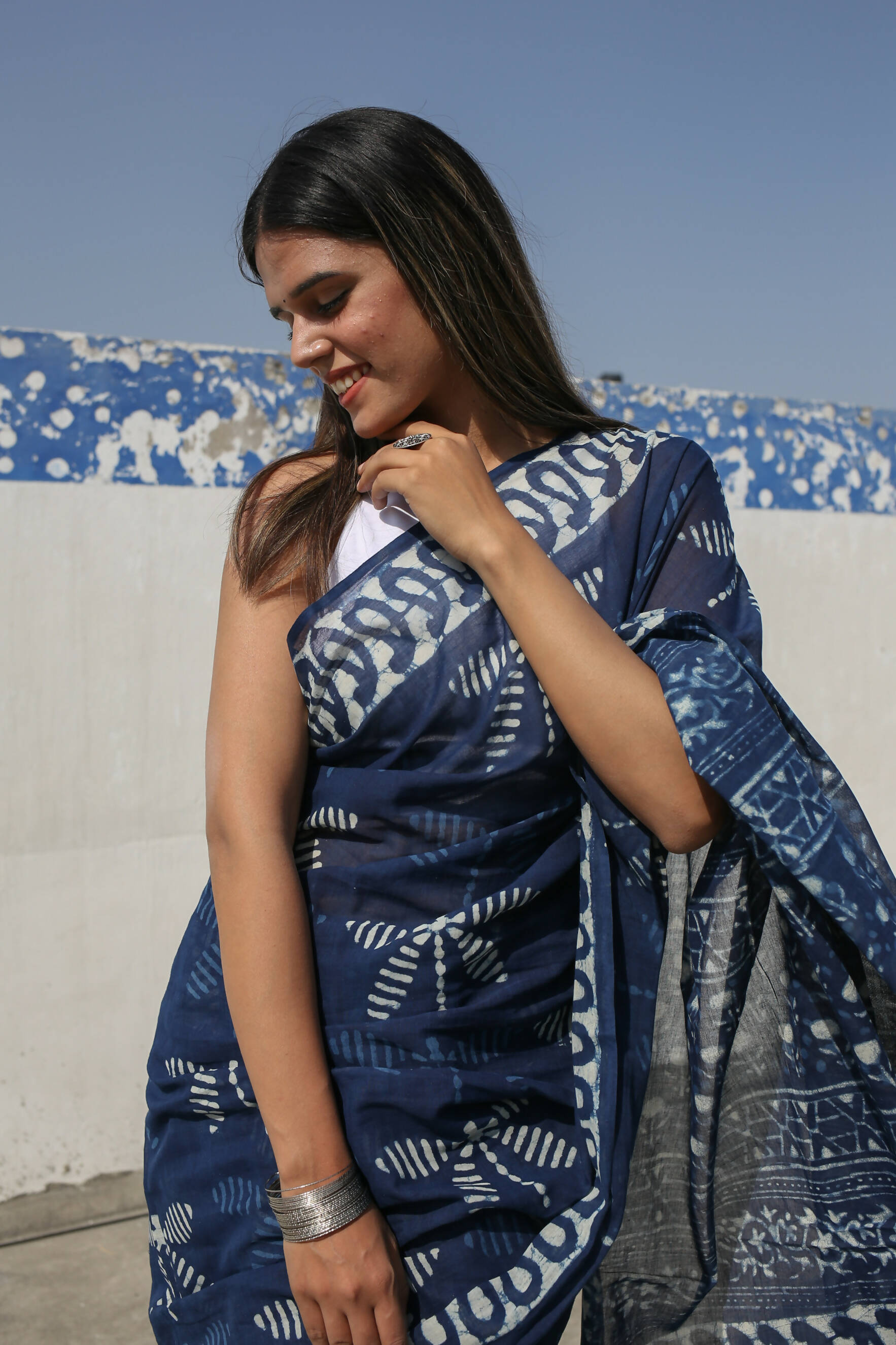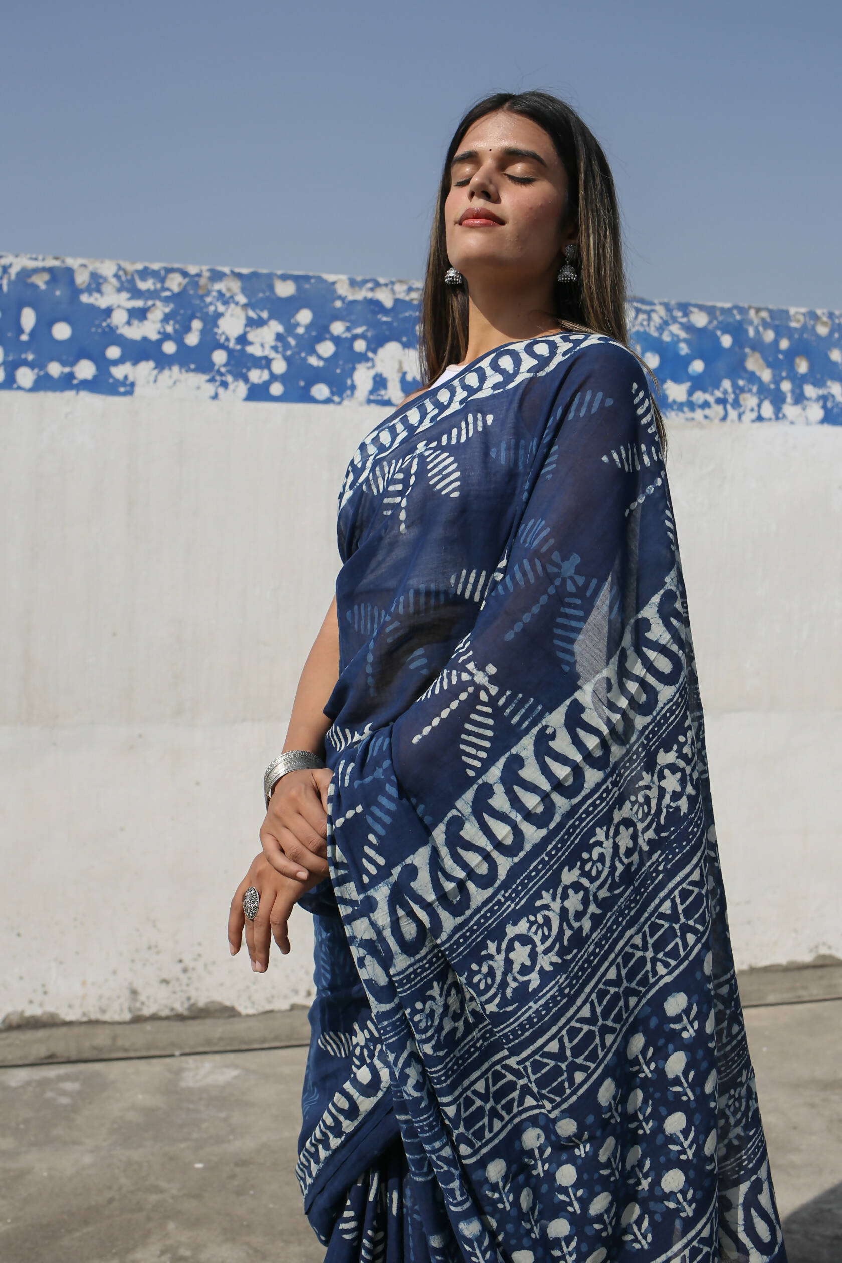 Indigo Dragonflies - Hand Block Print Mulmul Cotton Bagru Saree