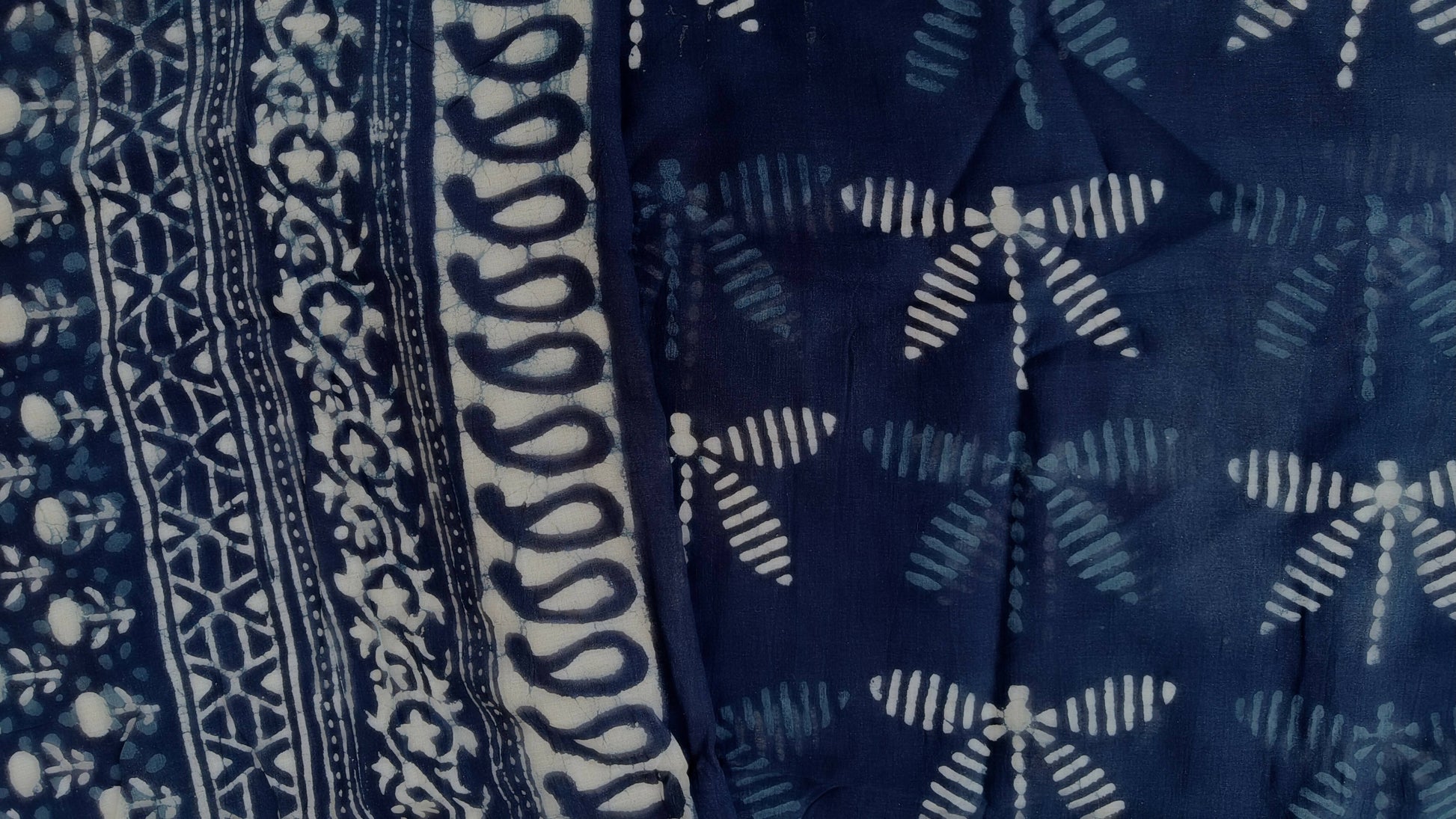 Indigo Dragonflies hand block printed saree is a magnificent work of art and style that is handcrafted with meticulous attention to detail. The saree is a masterpiece that showcases the timeless beauty of traditional Indian textiles. The rich indigo blue hues of the saree are enhanced by the intricate dragonfly motifs. Each motif has been expertly hand block printed by our skilled artisans, using traditional wooden blocks that have been passed down through generations.