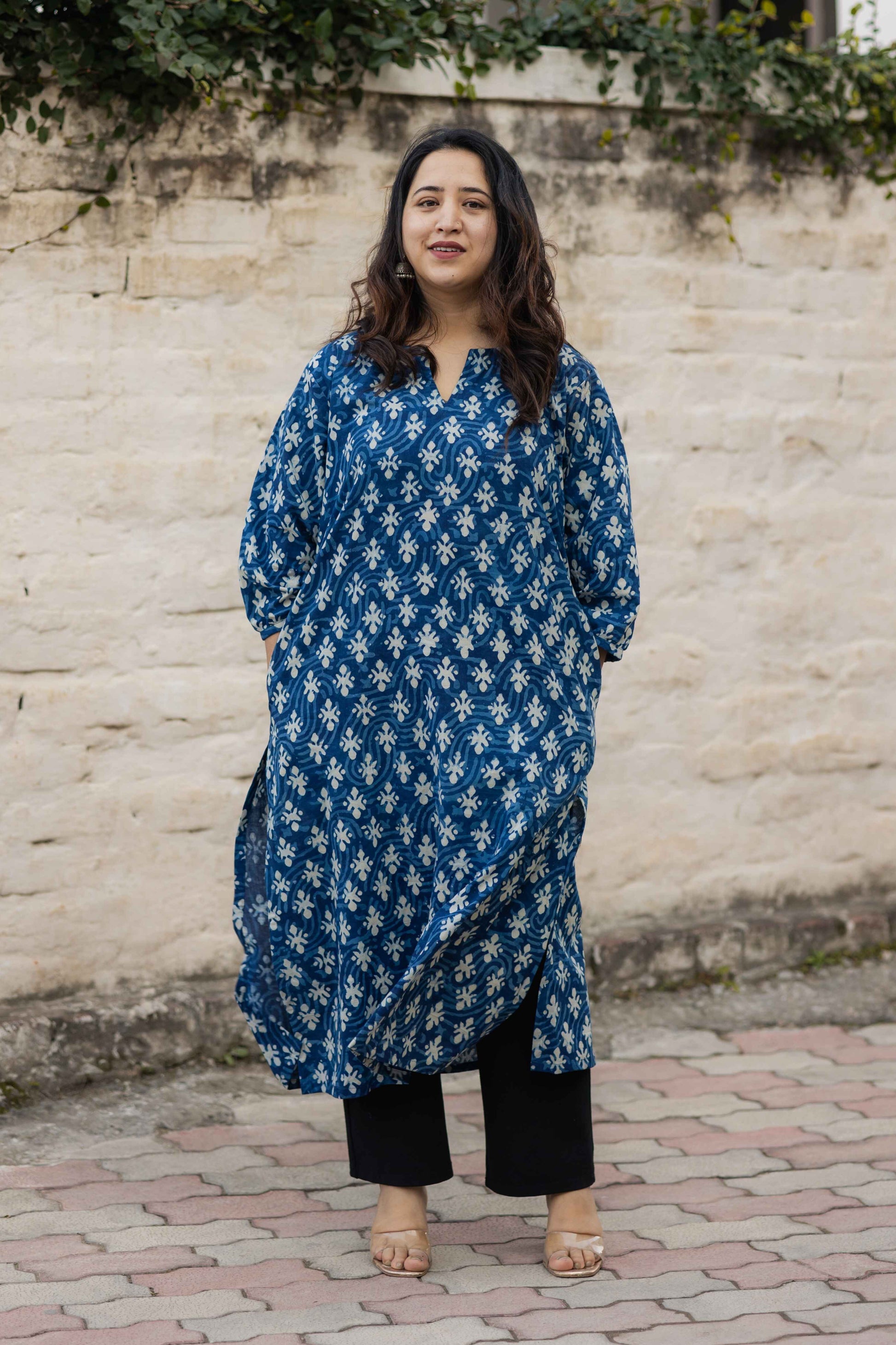Elegant and stylish, this Indigo Long Flared kurta is crafted from soft cotton fabric for all-day comfort. Featuring a chic Round V-slit Neck and 3/4th puff sleeves, it offers a flattering A-line silhouette with pockets for added functionality. Perfect for both casual and festive occasions.