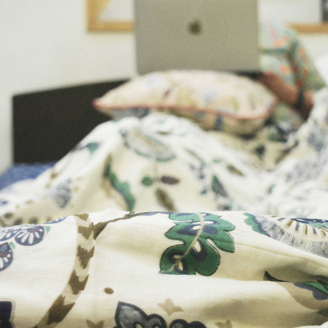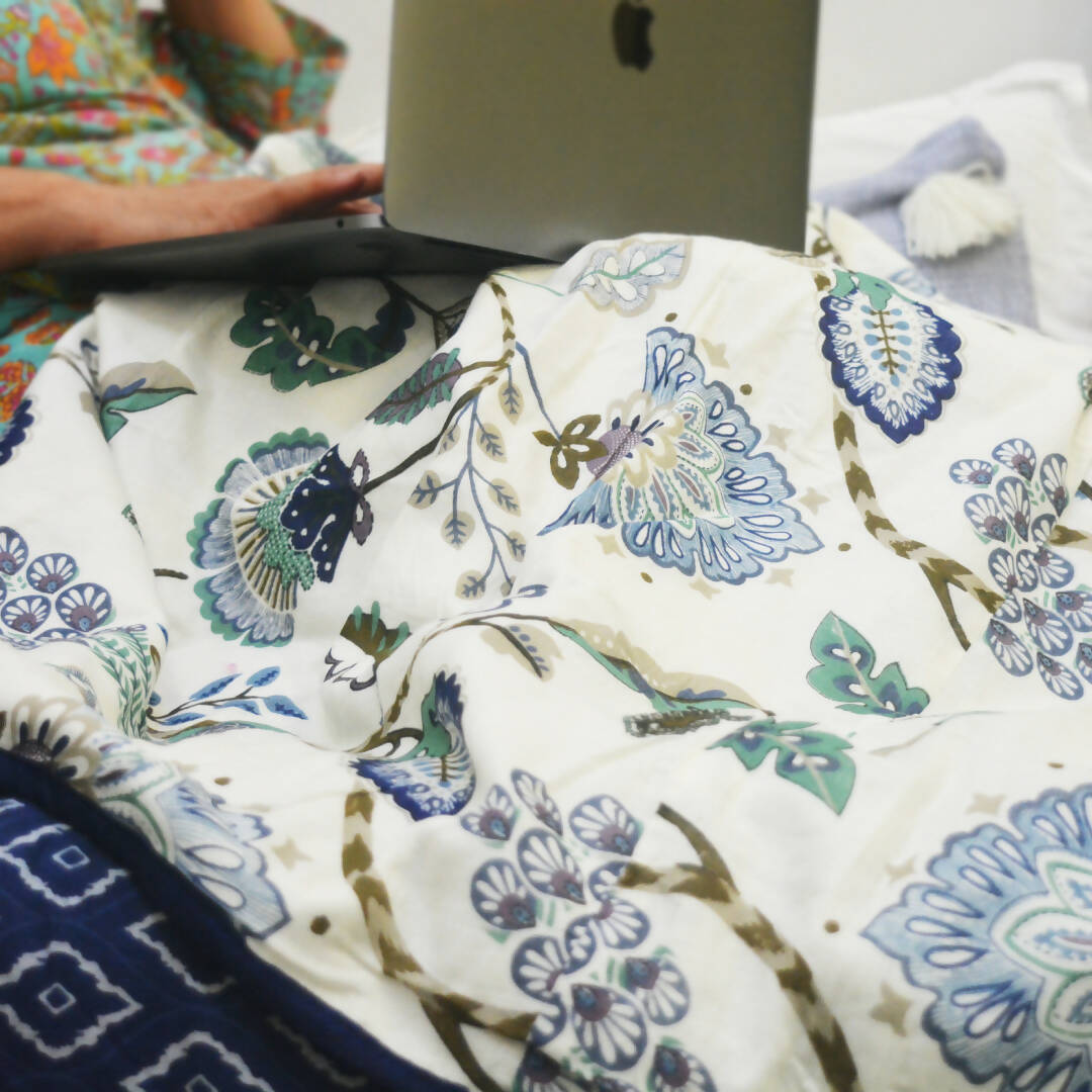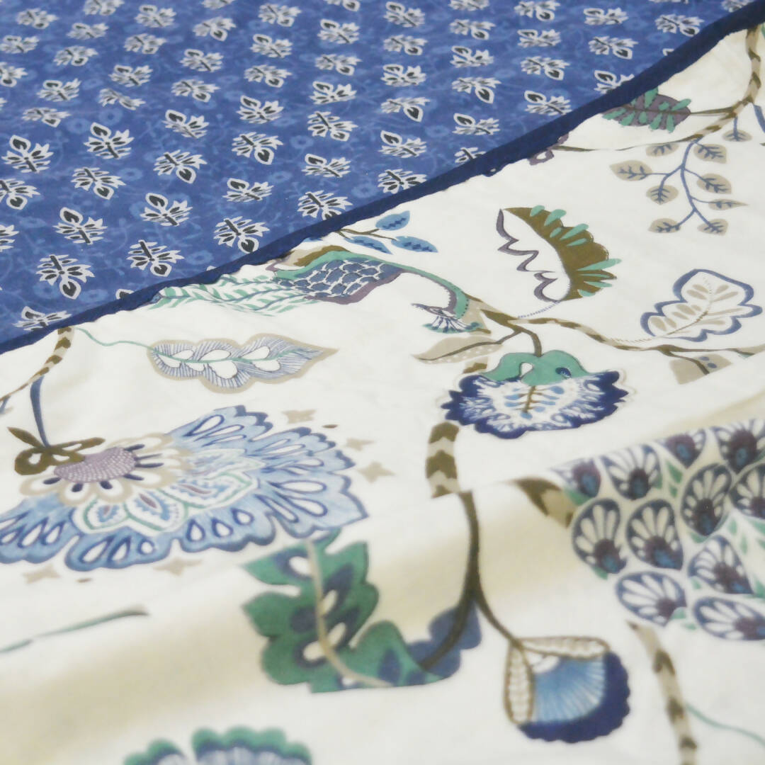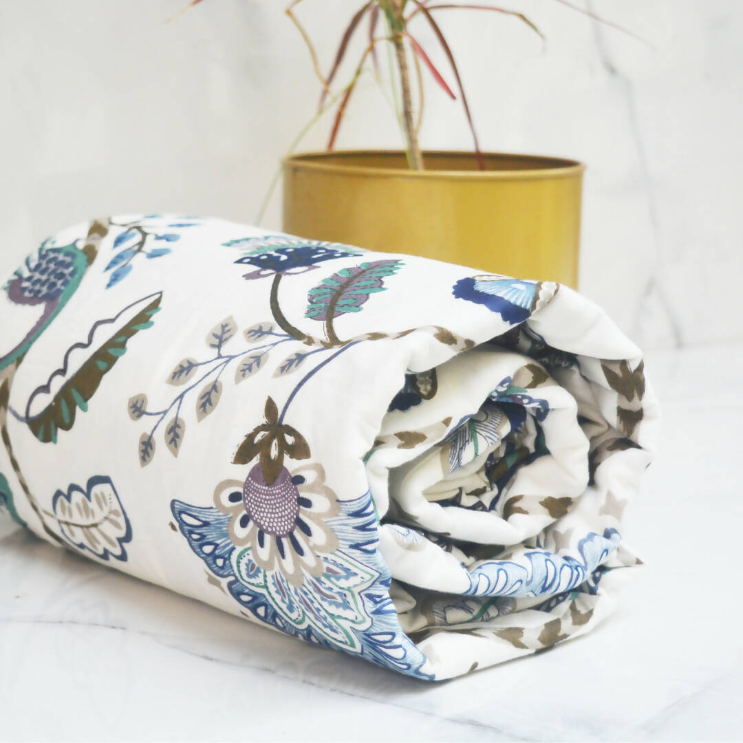 Peacocks and Rajasthan go long back. One can quite easily spot this majestic creature roam freely on the streets of the cities and villages. One such village called the Mor (peacock) village has been the source of inspiration for this collection where as many as 1500 peacocks live harmoniously with people in a closed community. Inspired by nature's most beautiful elements, the Indigo Mist All-over Printed reversible mulmul dohar is a handcrafted dream.