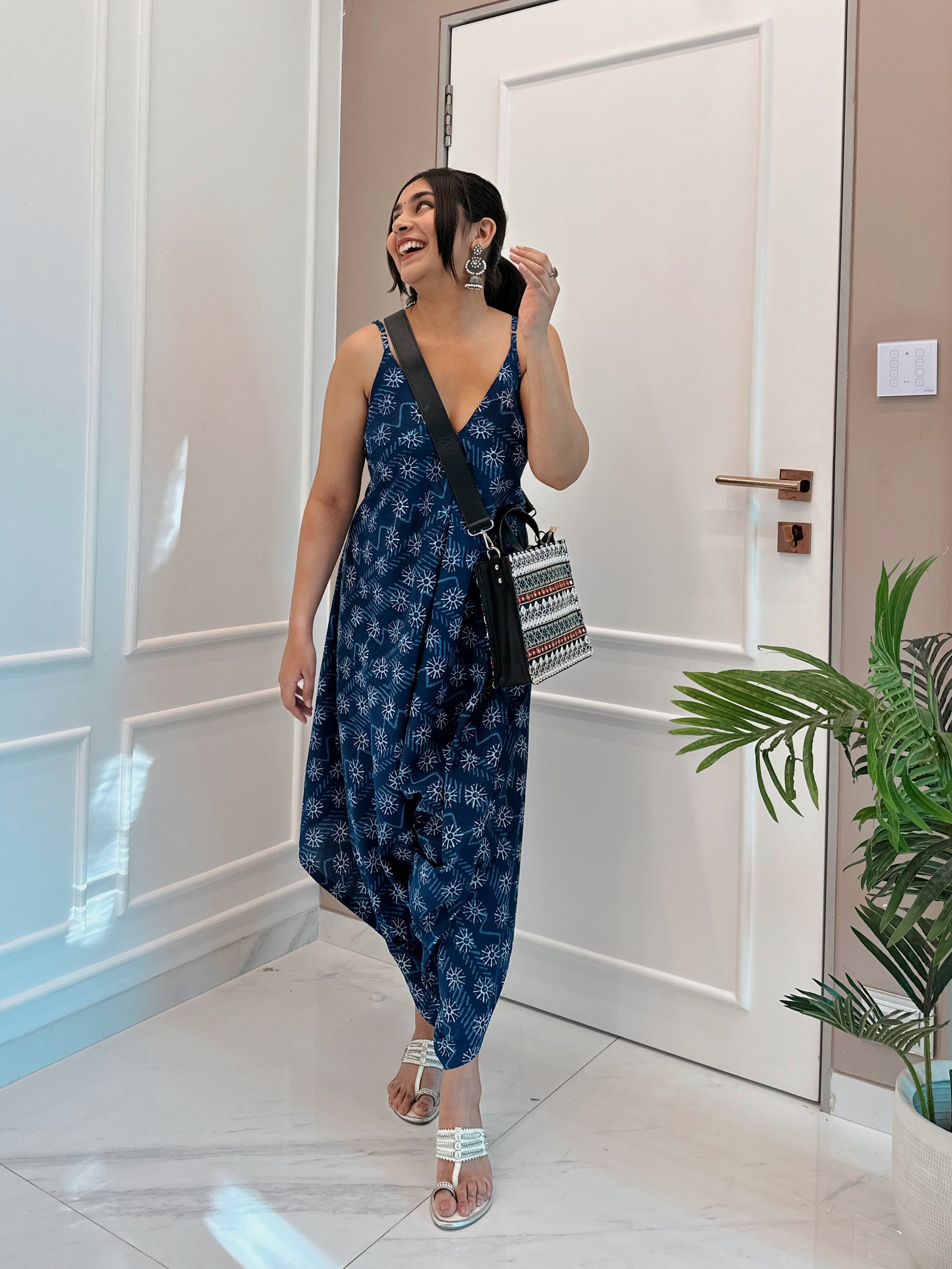 The Indigo Print Pushkar Jumpsuit is perfect for a relaxed, boho vibe. It features a stylish V-neck, sleeveless design, and playful tassel details. With adjustable shoulder straps and a tie-up back, it’s comfortable and effortlessly chic.