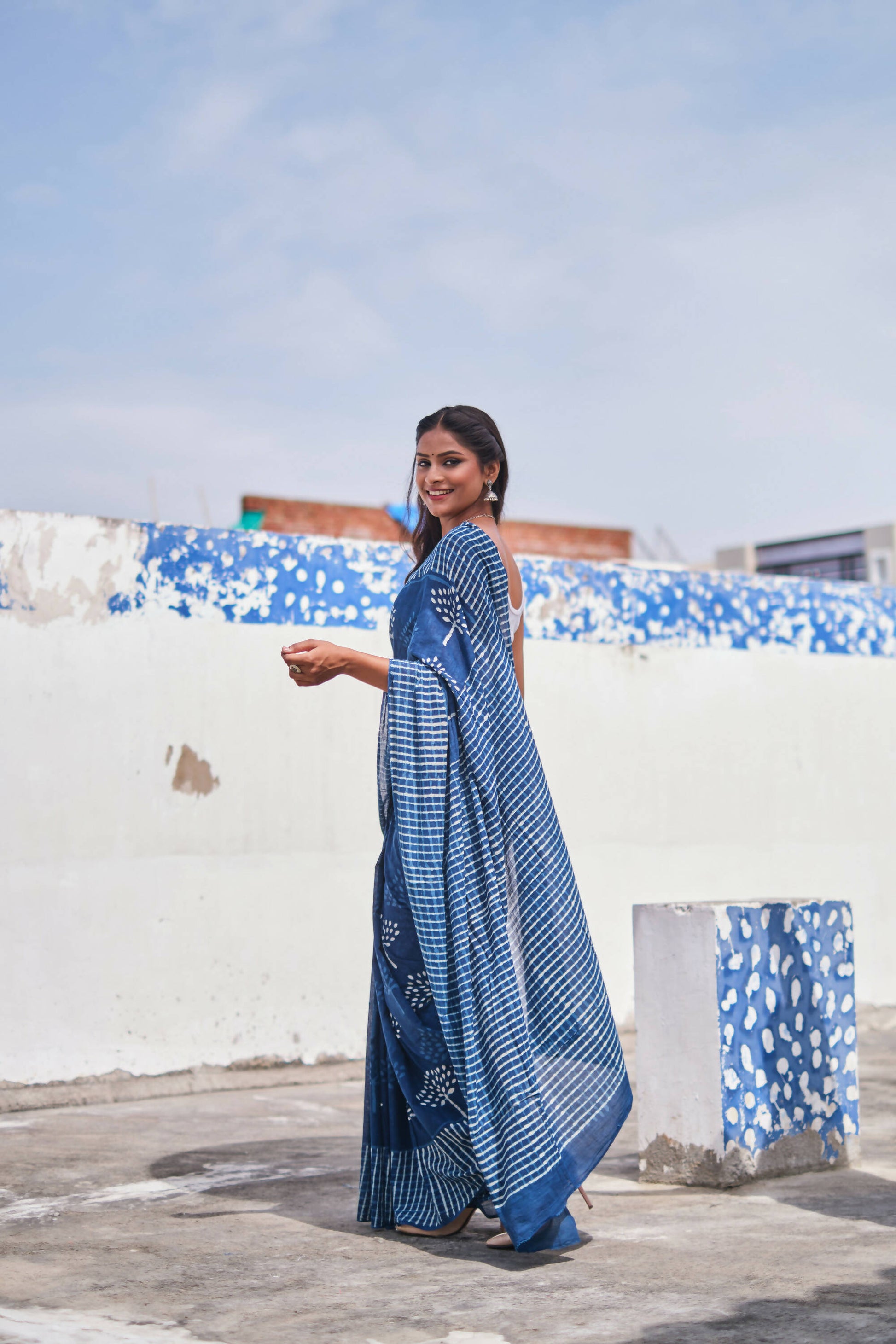 Indigo Spells - Dabu Hand Block Print Mulmul Cotton Bagru Saree