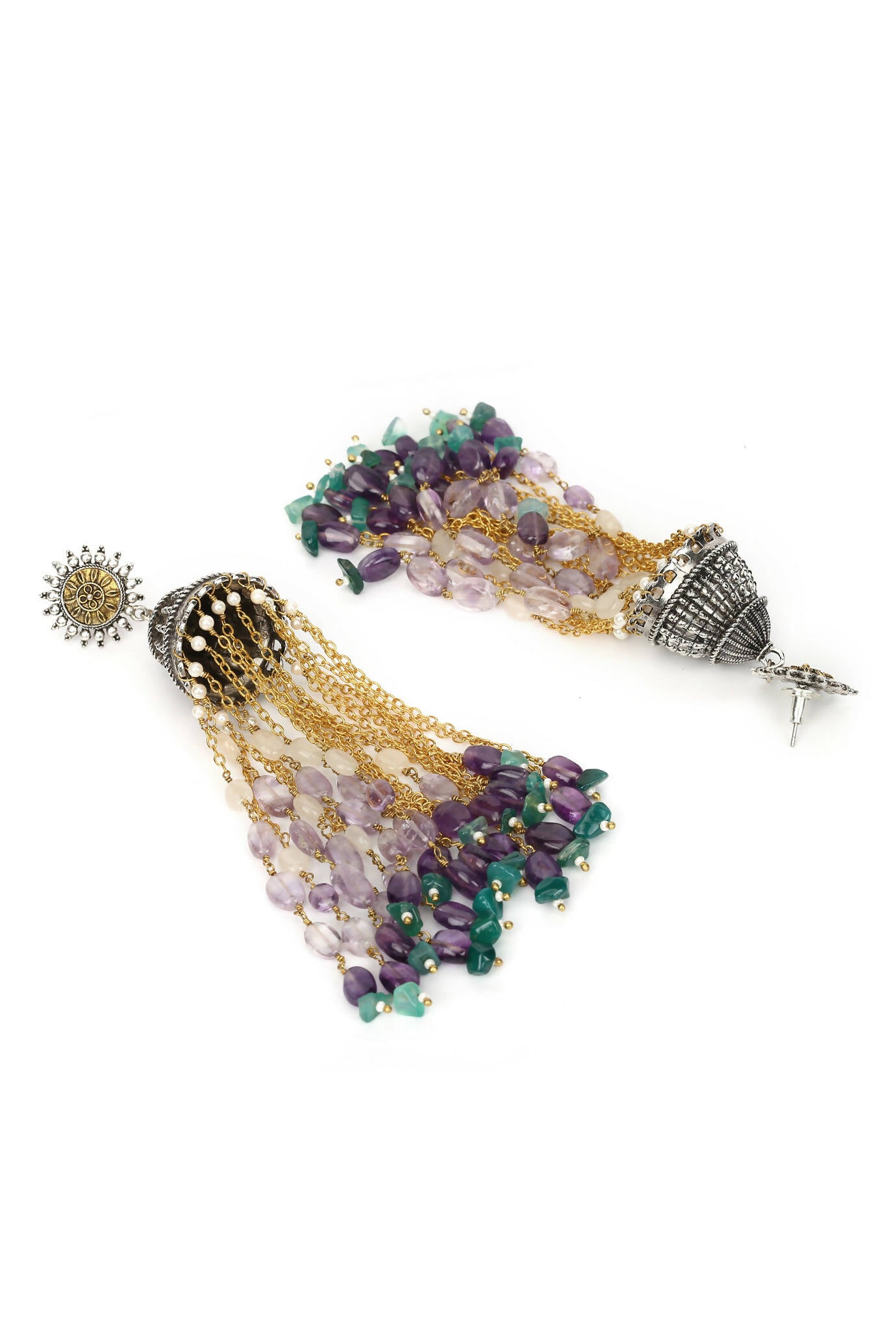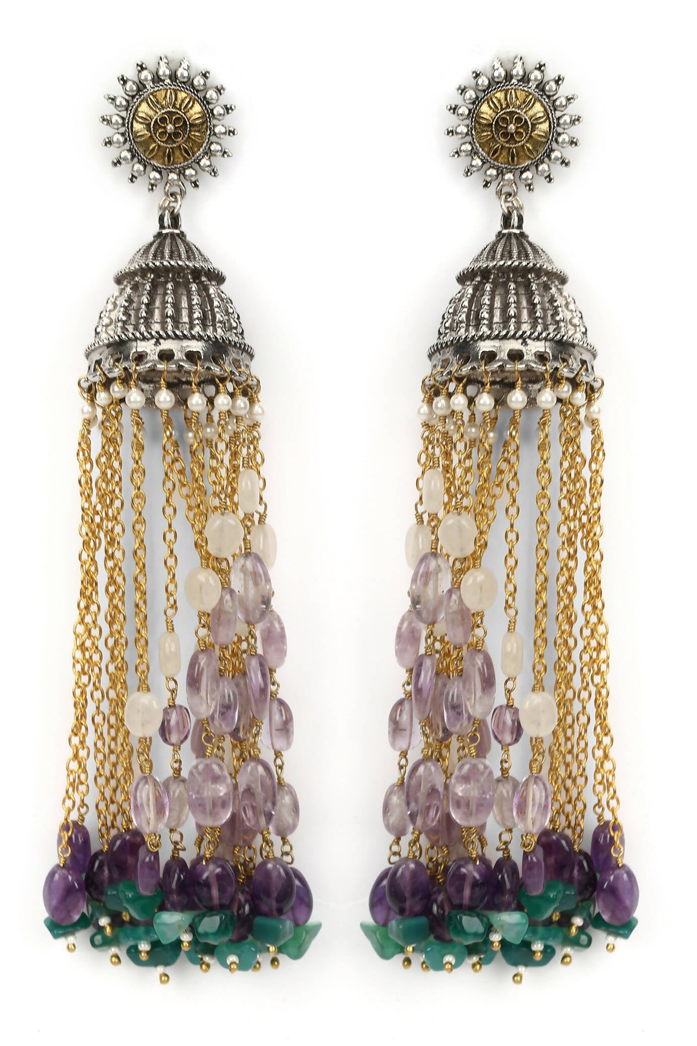 The lines and lines of bright colours forming a rainbow are our inspiration for the spectrum of golden chains and vibrant shades of cabochon stones created for our earrings. Wear these statement dual tones jhumkas with a chikankari kurta for maximum impact.