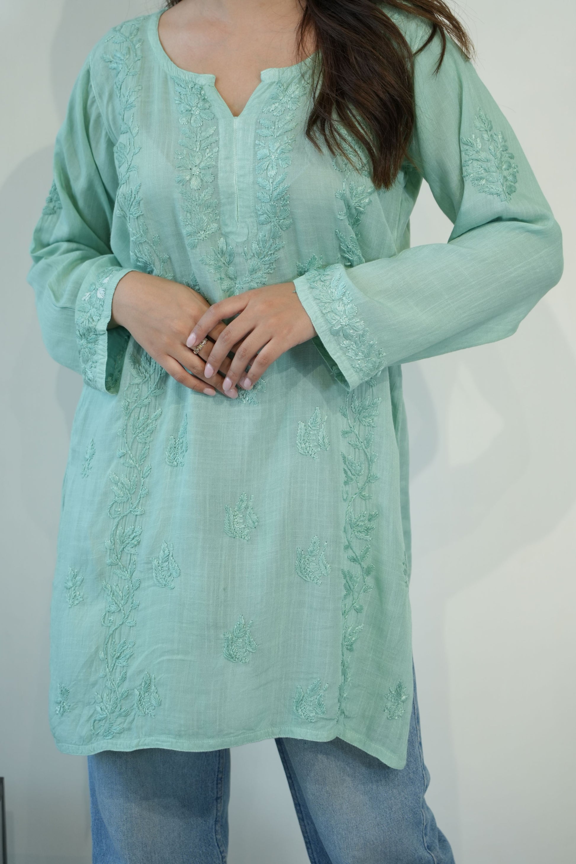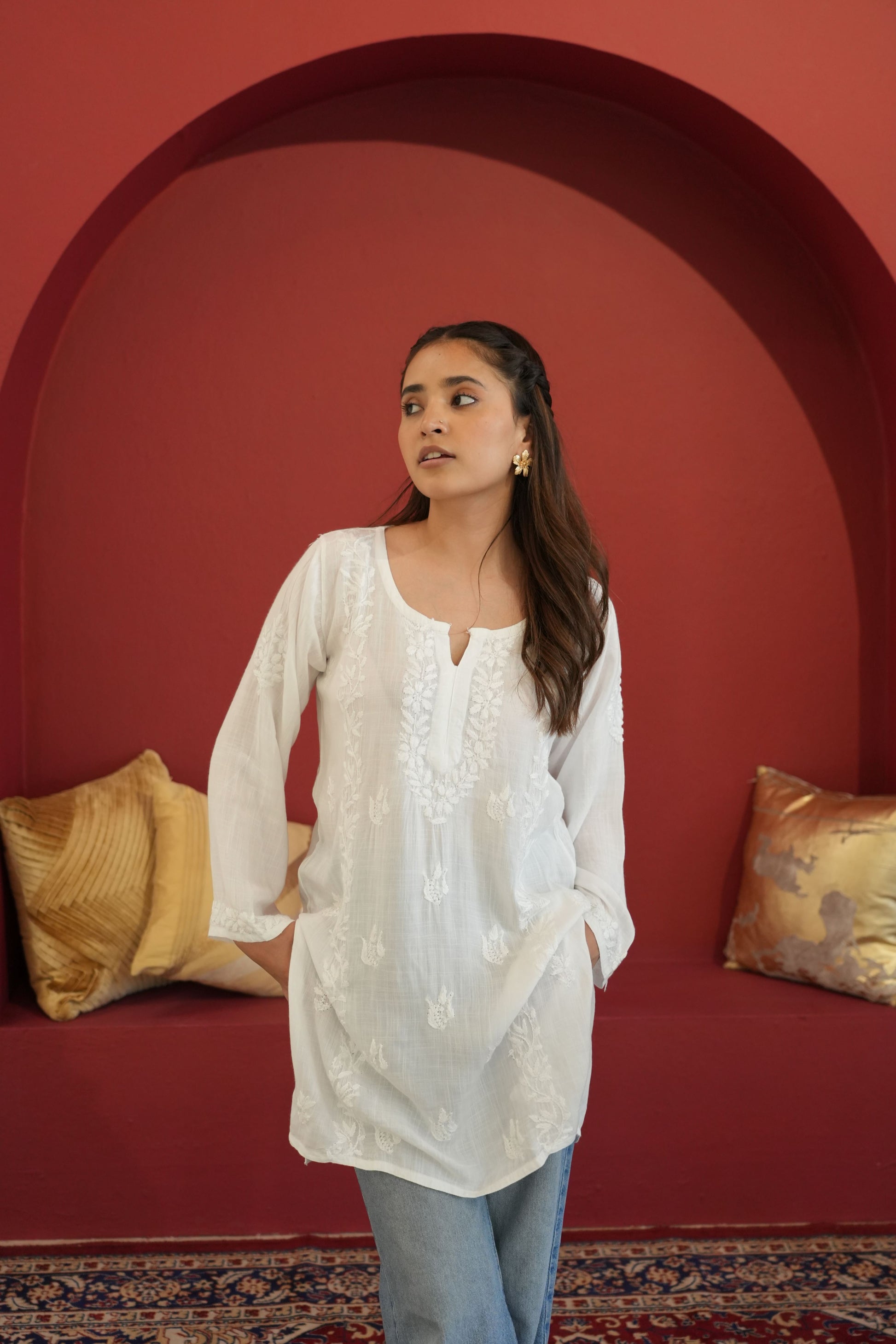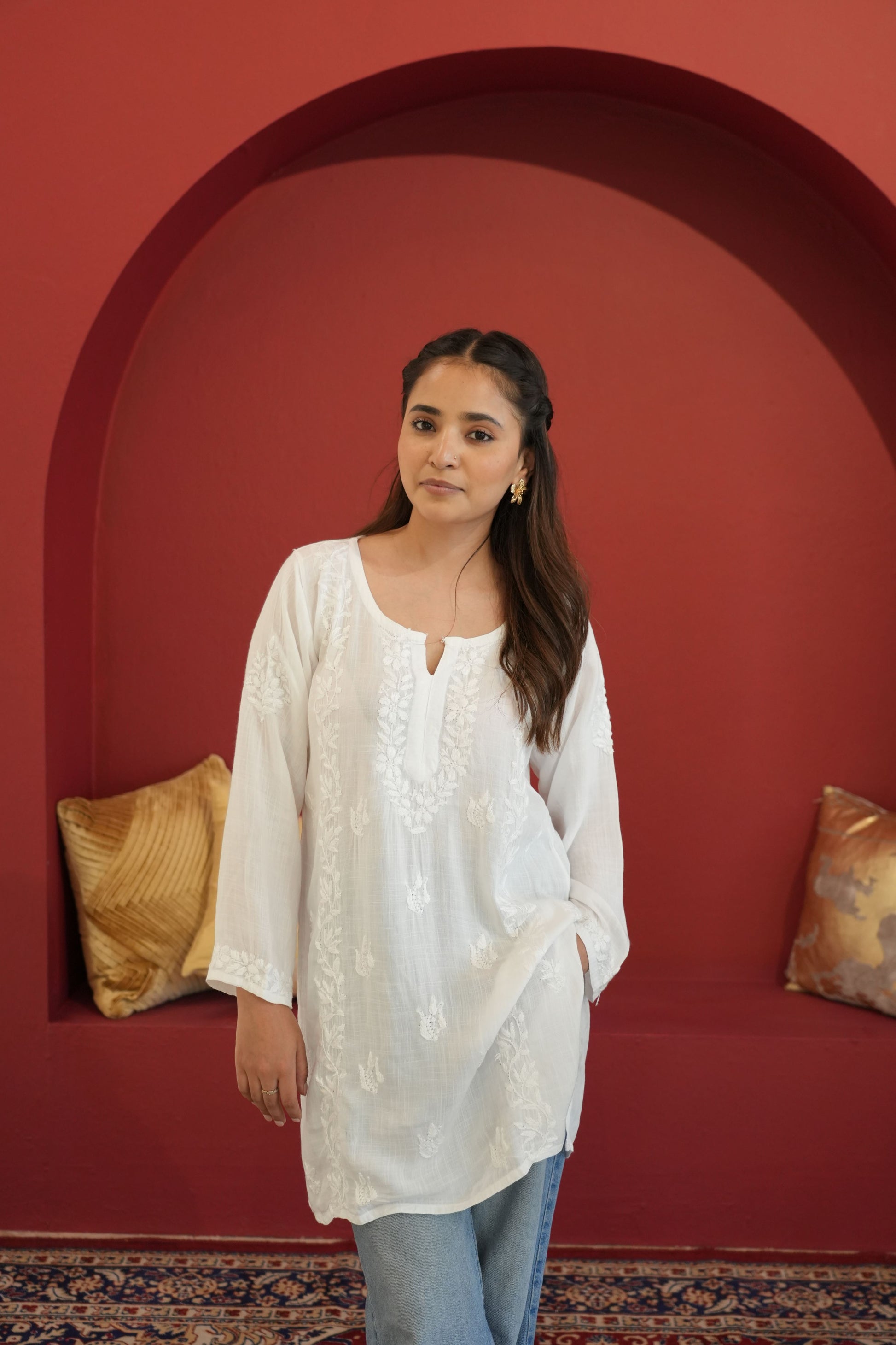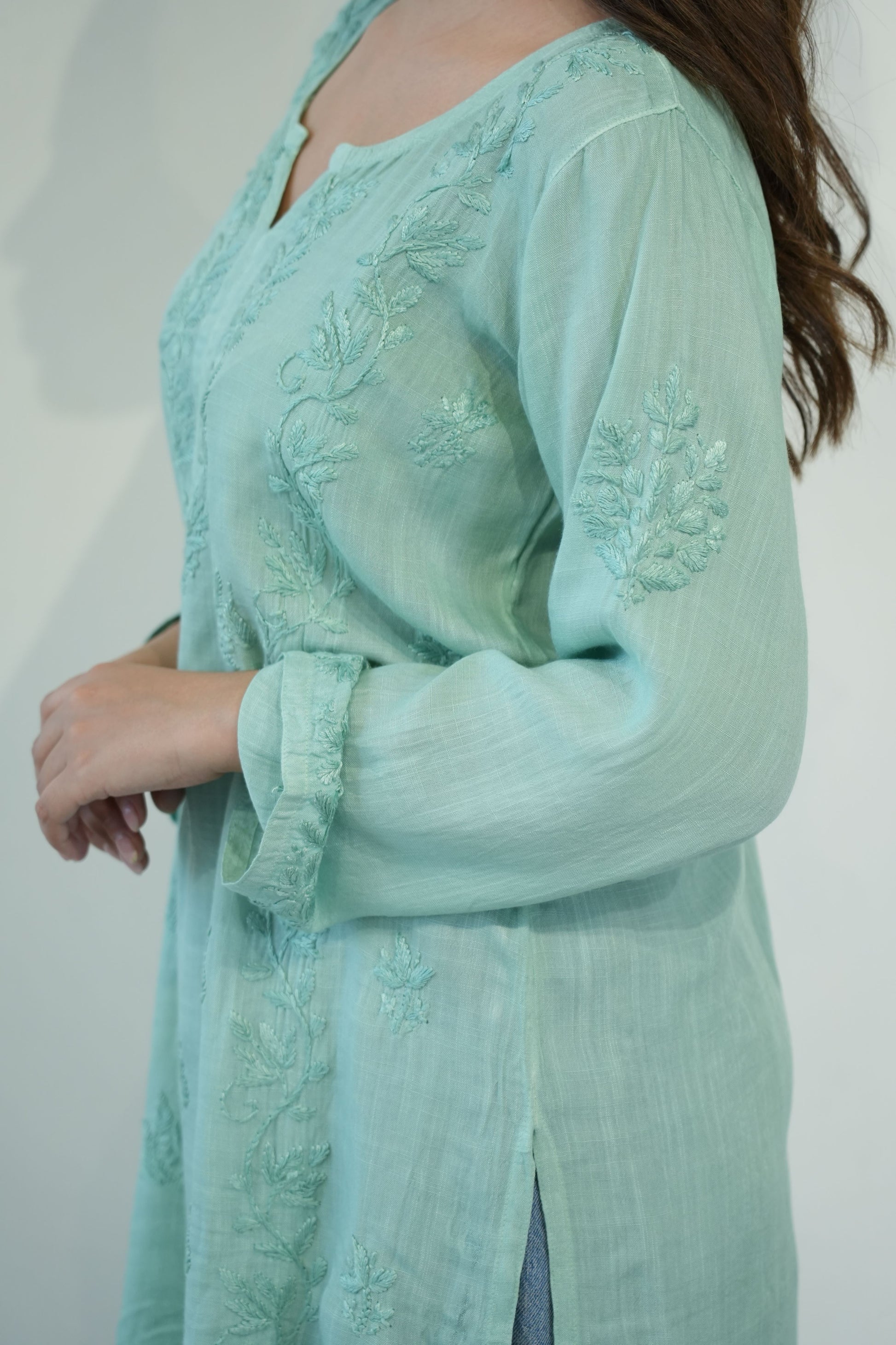 Made from premium quality soft and flowy linen cotton fabric, this kurta features delicate Chikankari embroidery, a centuries-old art form originating from the heart of India. Perfect for both casual outings and special occasions, our Chikankari Short kurta effortlessly blends classic charm with modern style.