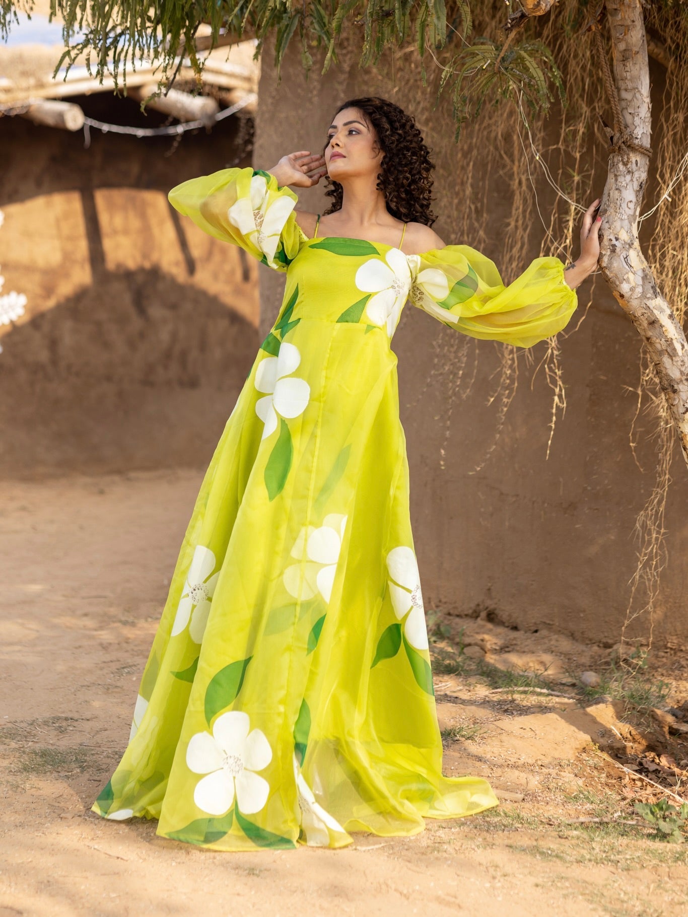 Unveil pure elegance with the White Rose Dress. Crafted in luxurious organza fabric, it features hand-painted floral motifs and off-shoulder balloon sleeves for a touch of sophistication. Pair with statement earrings and heels to complete this graceful, head-turning look.