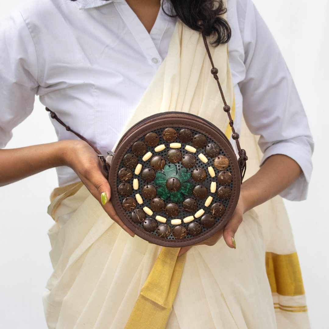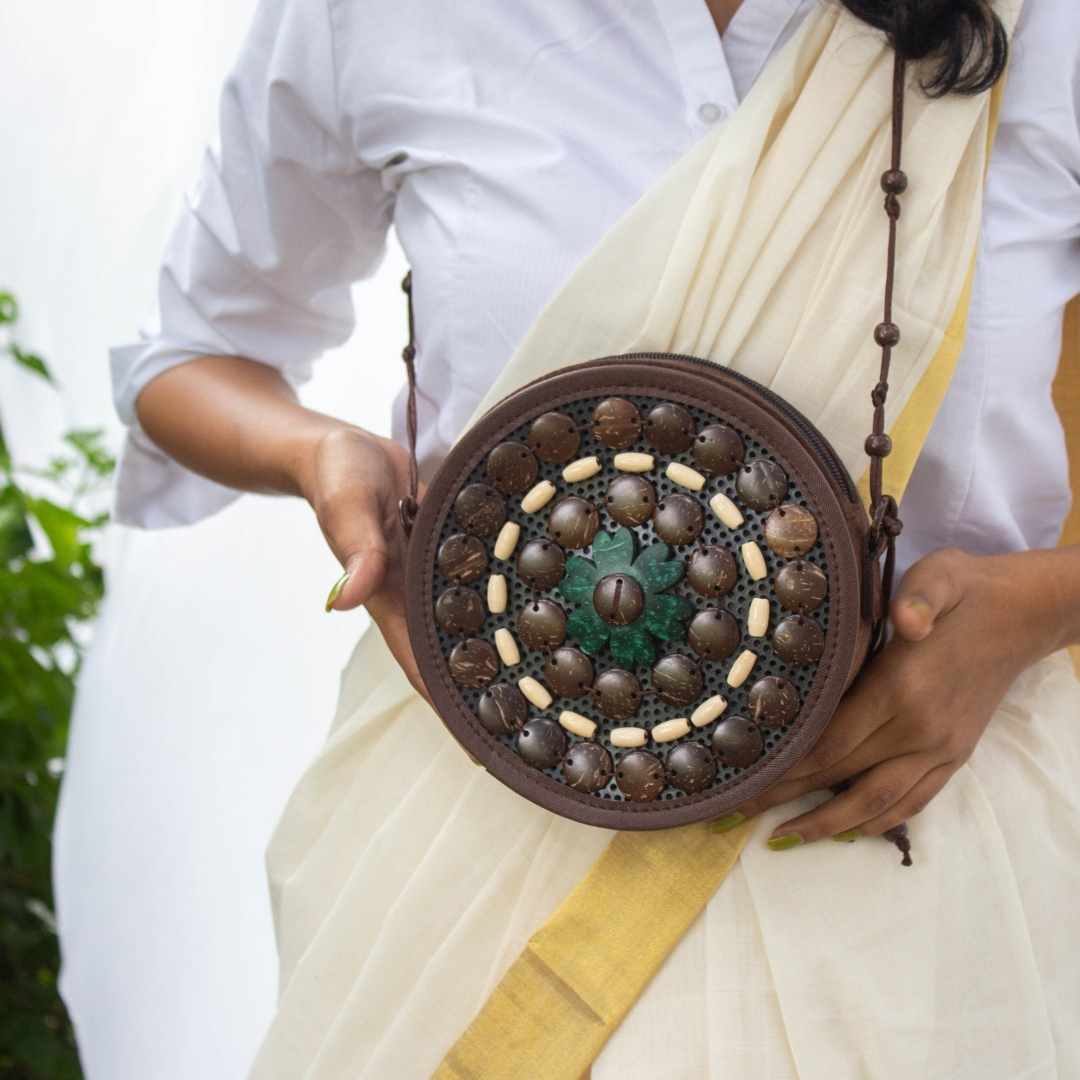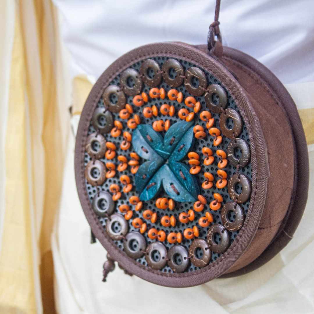Sling bags for fun moods and easy outings. Sustainably circular.Coconut shell motifs complemented by wooden beads, all hand stitched on recycled PU and trimmed with soft vegan leather.