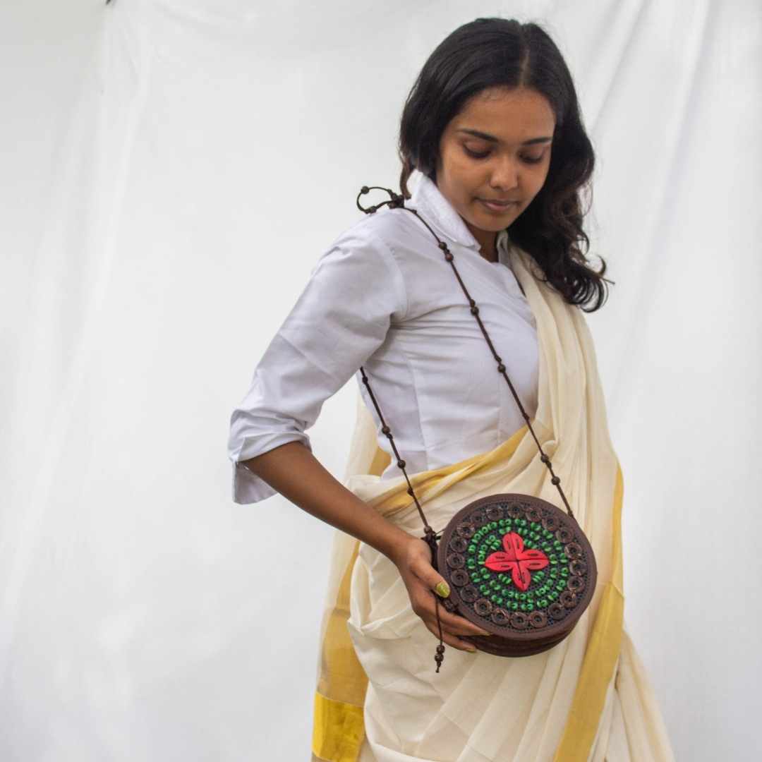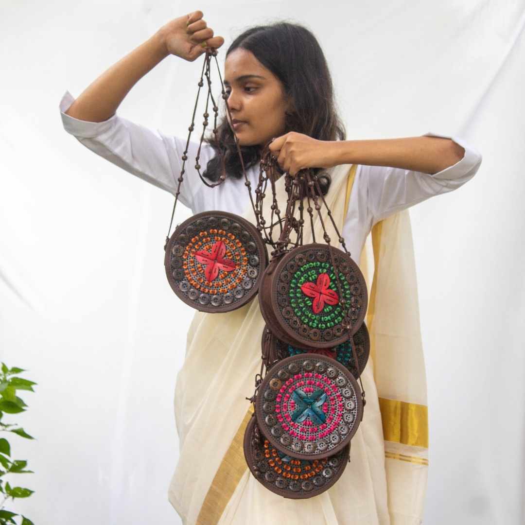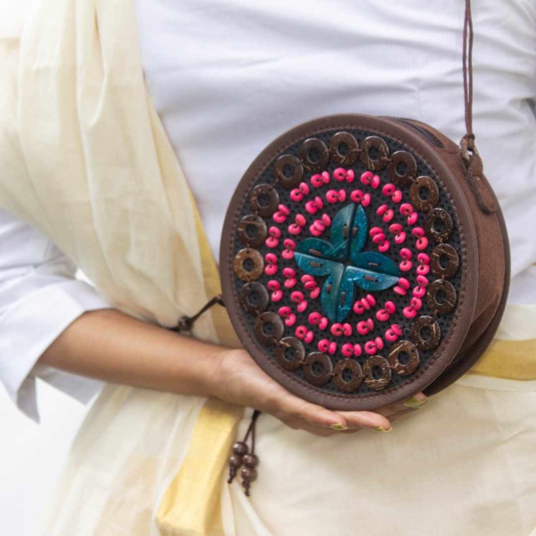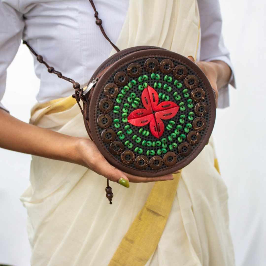 Sling bags for fun moods and easy outings. Sustainably circular.Coconut shell motifs complemented by wooden beads, all hand stitched on recycled PU and trimmed with soft vegan leather.