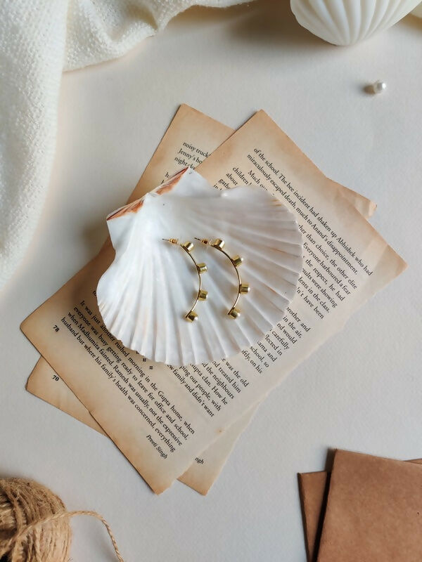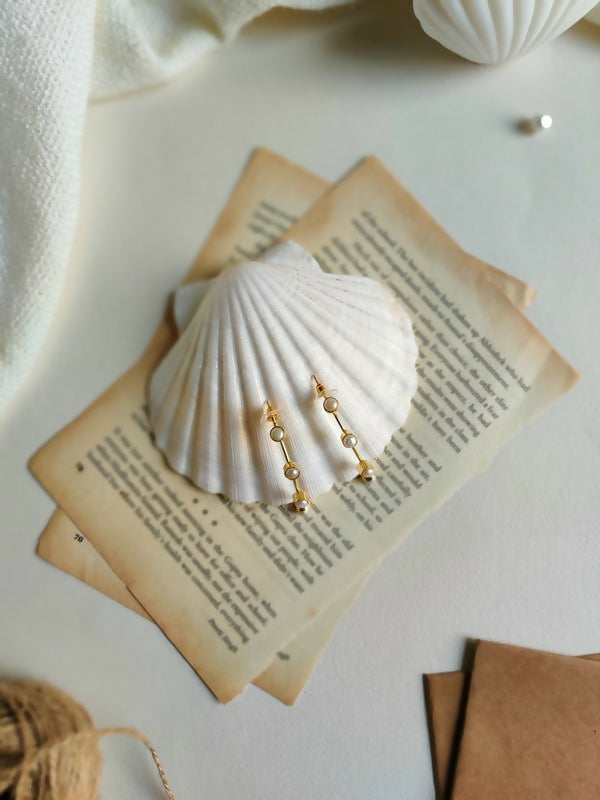 The curved stick design gives these earrings a unique and contemporary look that sets them apart. The seamless integration of the pearls and brass creates a harmonious balance between the materials, resulting in a refined and eye-catching piece of jewelry.