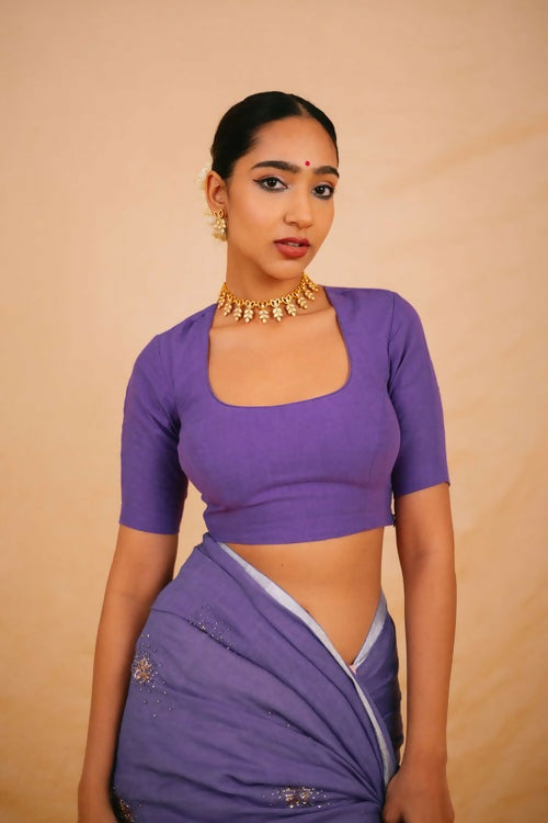 Return to the classic retro days with this blouse showcasing the perfect bright Purple hue. Round neck with the piping finish and potli buttons at back. Side seam zipper for closure.