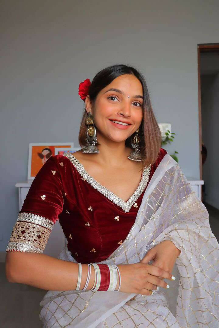 Elegantly designed to complement any saree, this blouse is a timeless fusion of tradition and style. And a perfect piece to add a statement to your attire! Pair it with a monotone saree or go all over by pairing it with a contrast saree. This one will surely will be a statement piece in your wardrobe.