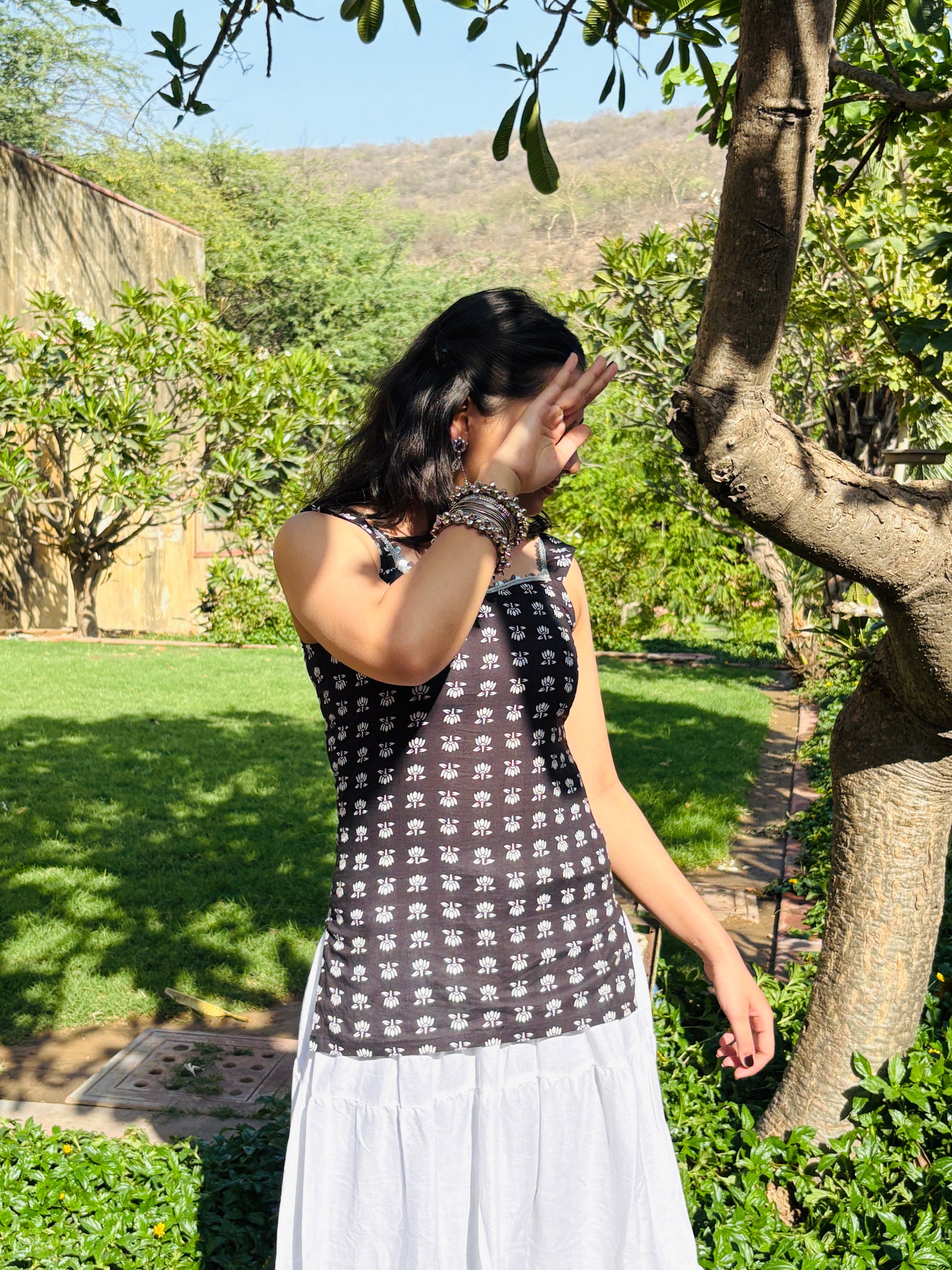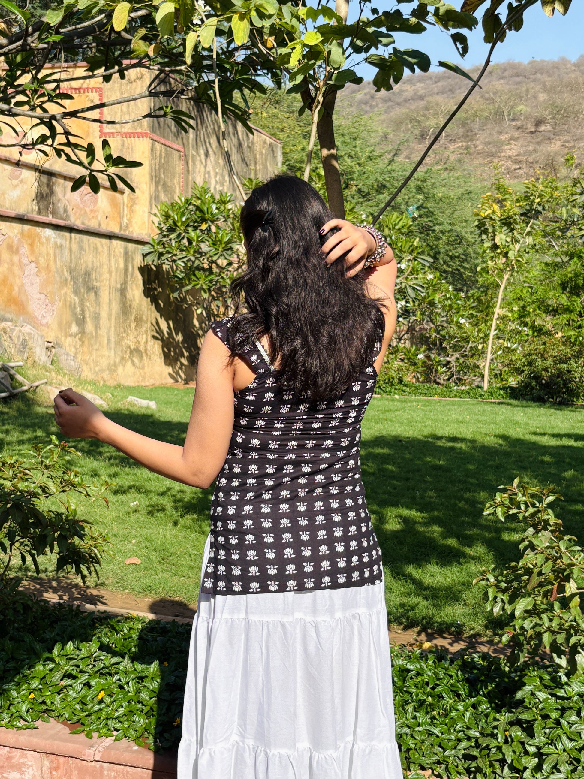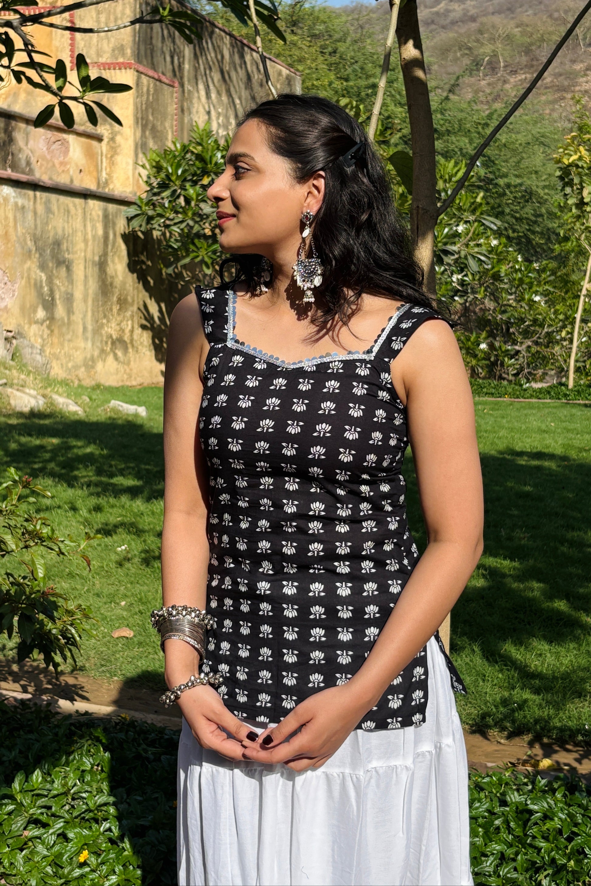 Rooted in the rich artistry of Rajasthan, the Kamli Kurti in black is for the woman who carries the night sky within her. The timeless monochrome hand-block print celebrates the elegance of simplicity, while the structured bodice and square neckline exude effortless confidence. Made from breathable cotton, it's your perfect companion for balmy summer evenings or golden-hour escapes.Wear it with silver jhumkas and a white skirt for a look that speaks of heritage with a modern twist.