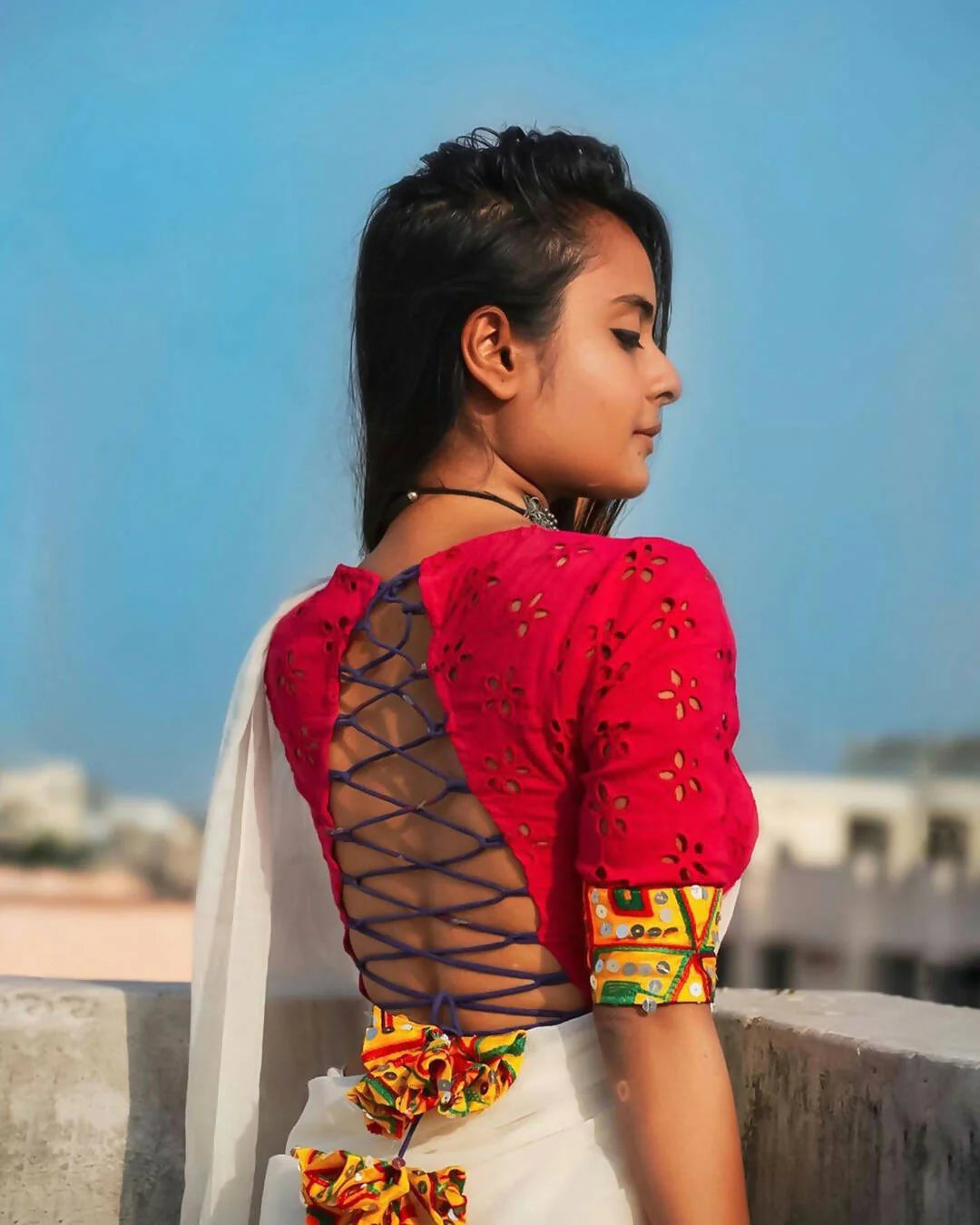 Elegantly designed to complement any saree, this blouse is a timeless fusion of tradition and style. And a perfect piece to add a statement to your attire! Pair it with a monotone saree or go all over by pairing it with a contrast saree. This one will surely will be a statement piece in your wardrobe.
