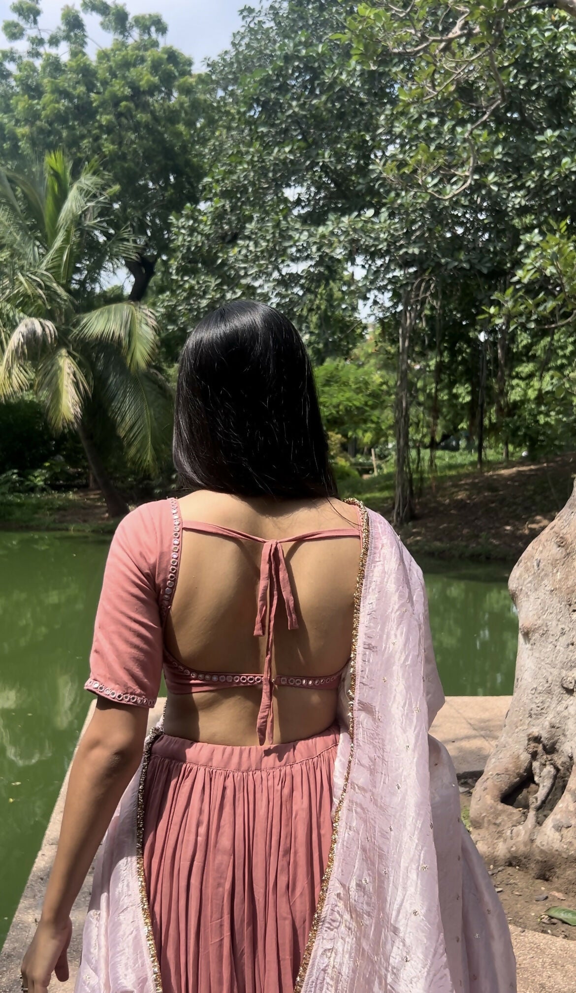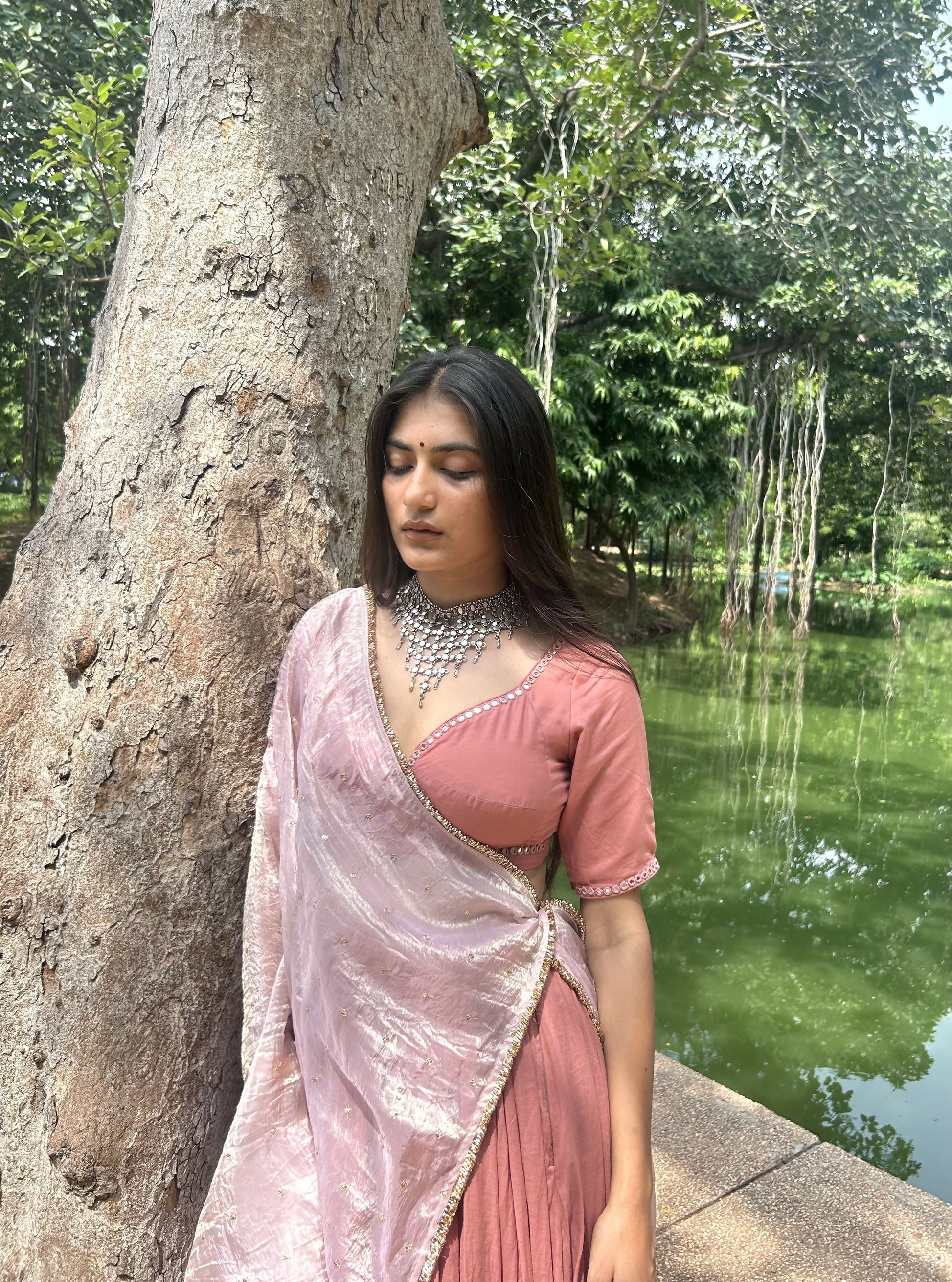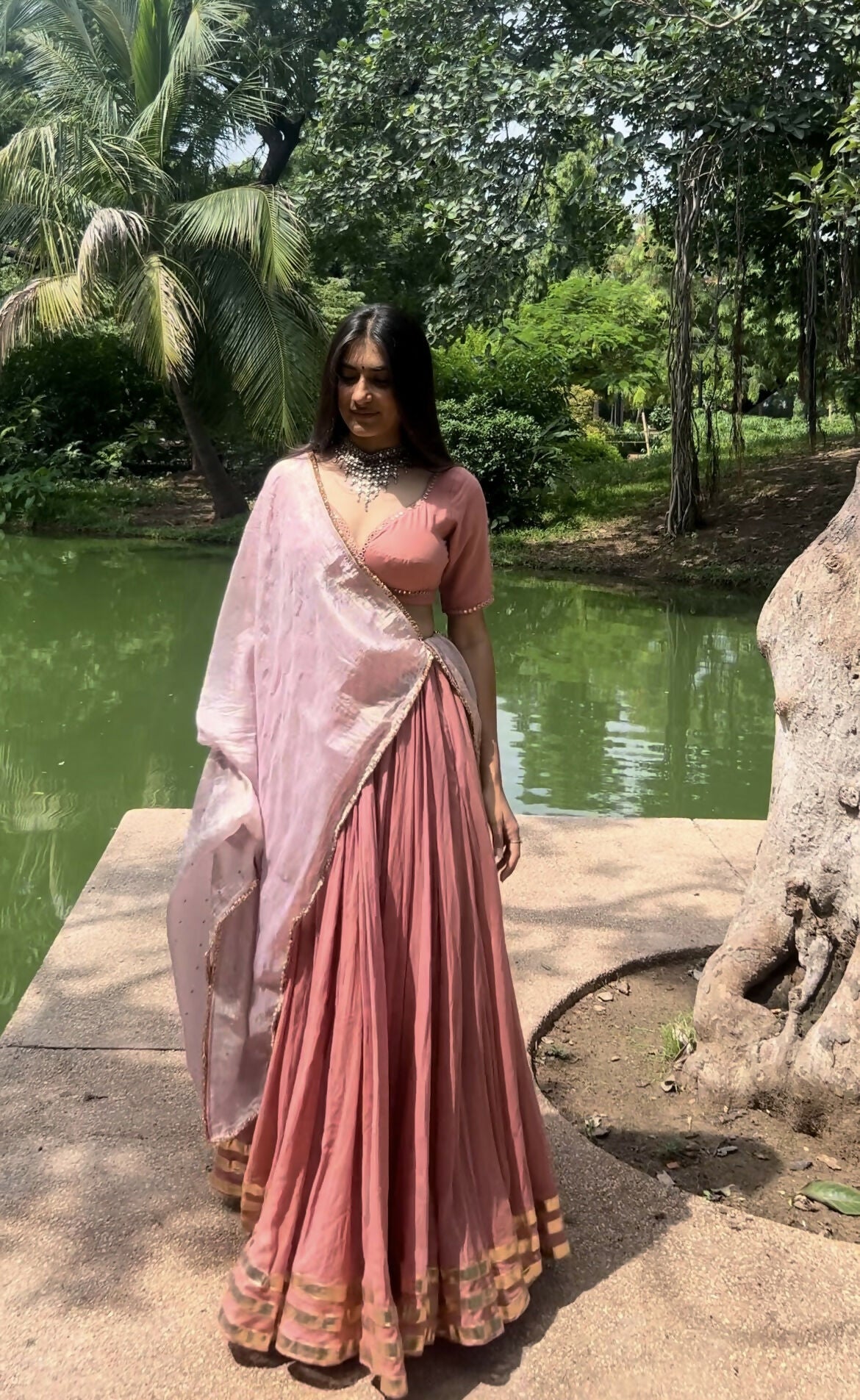 The Kaveri Choli set in soft nude pink combines elegance with sophistication. The mul cotton skirt features golden lace, the blouse has mirror work, and the tissue dupatta is adorned with delicate golden lace. Ideal for special occasions, it blends tradition with a touch of glamour.