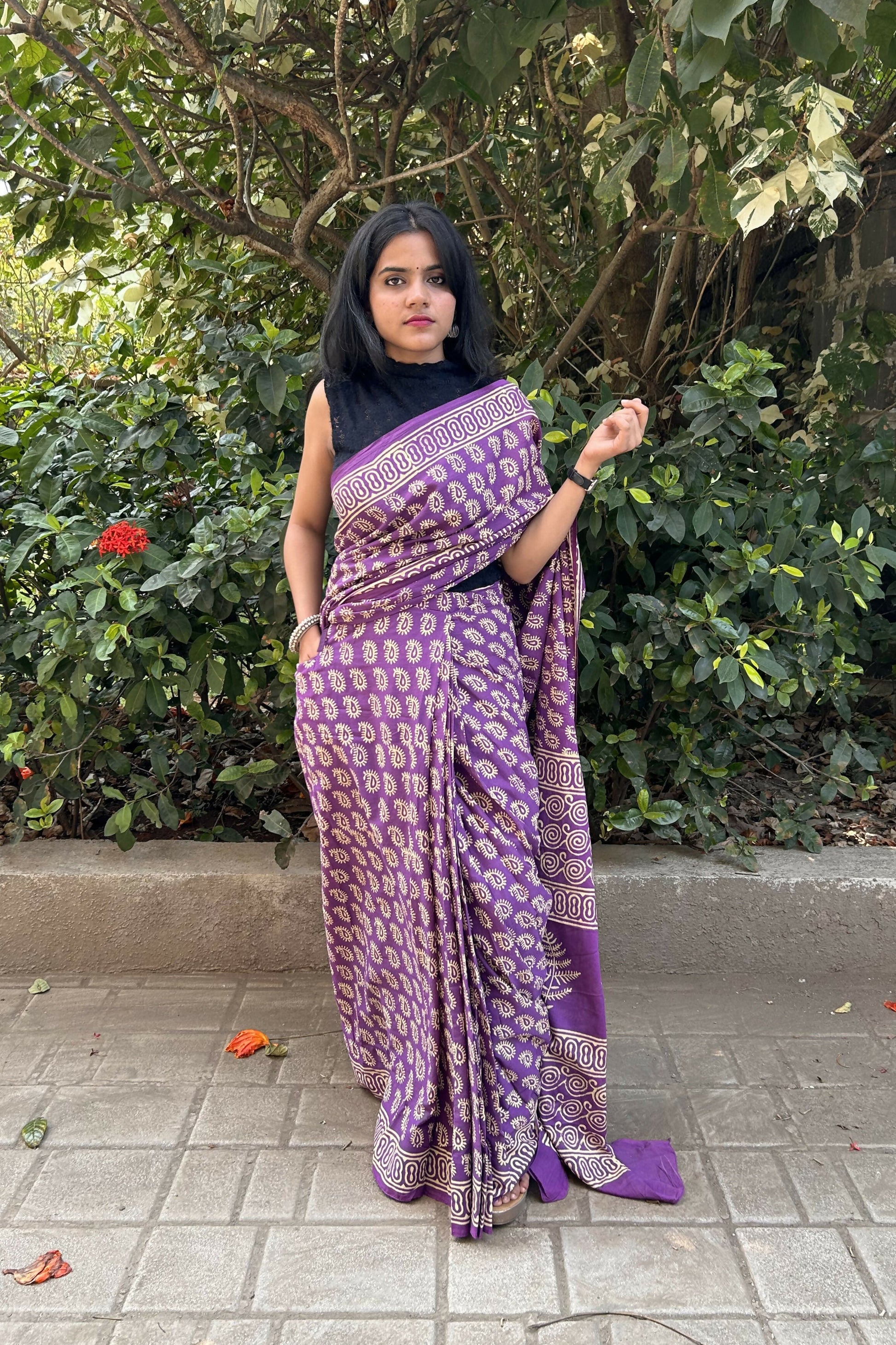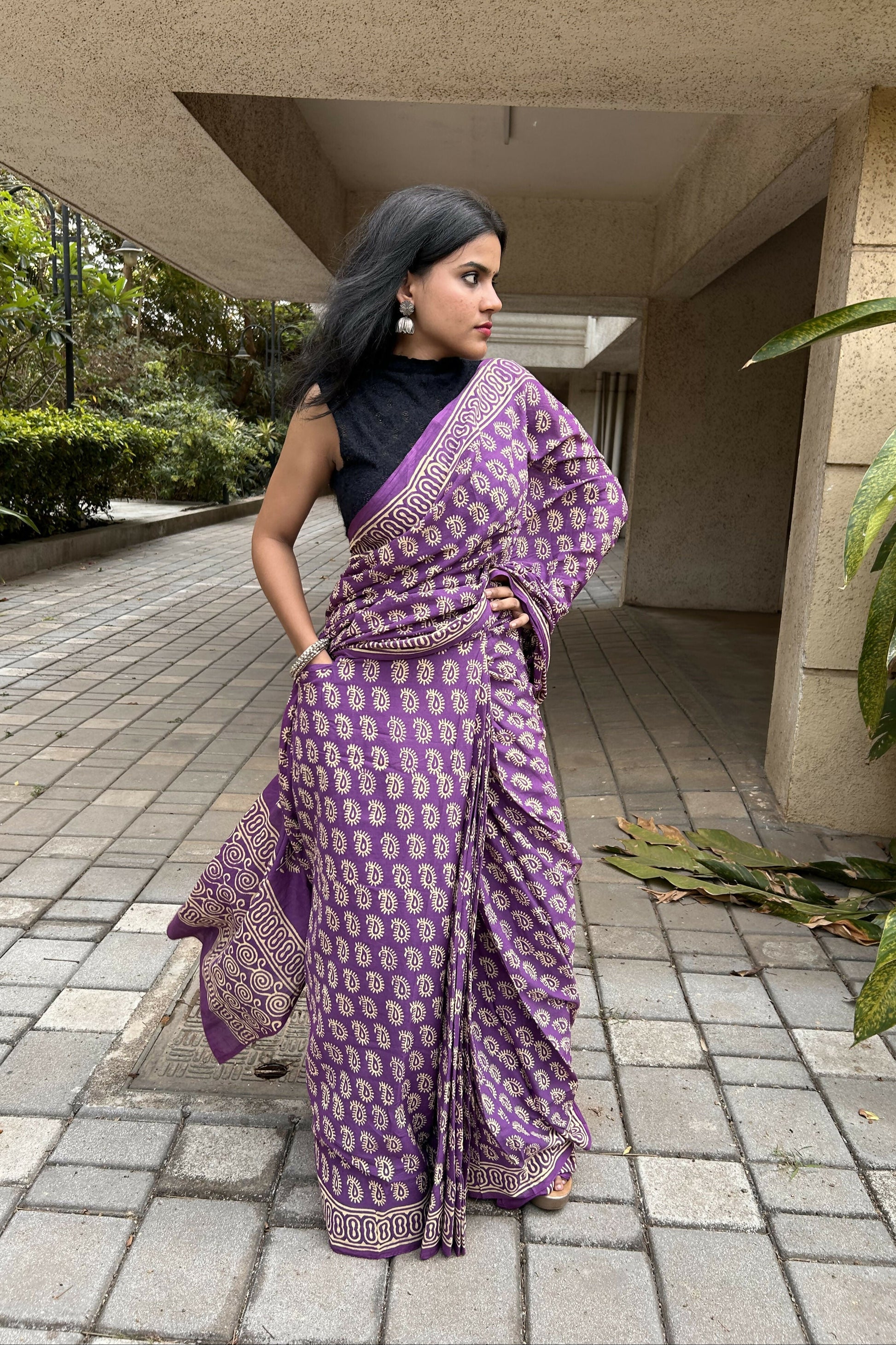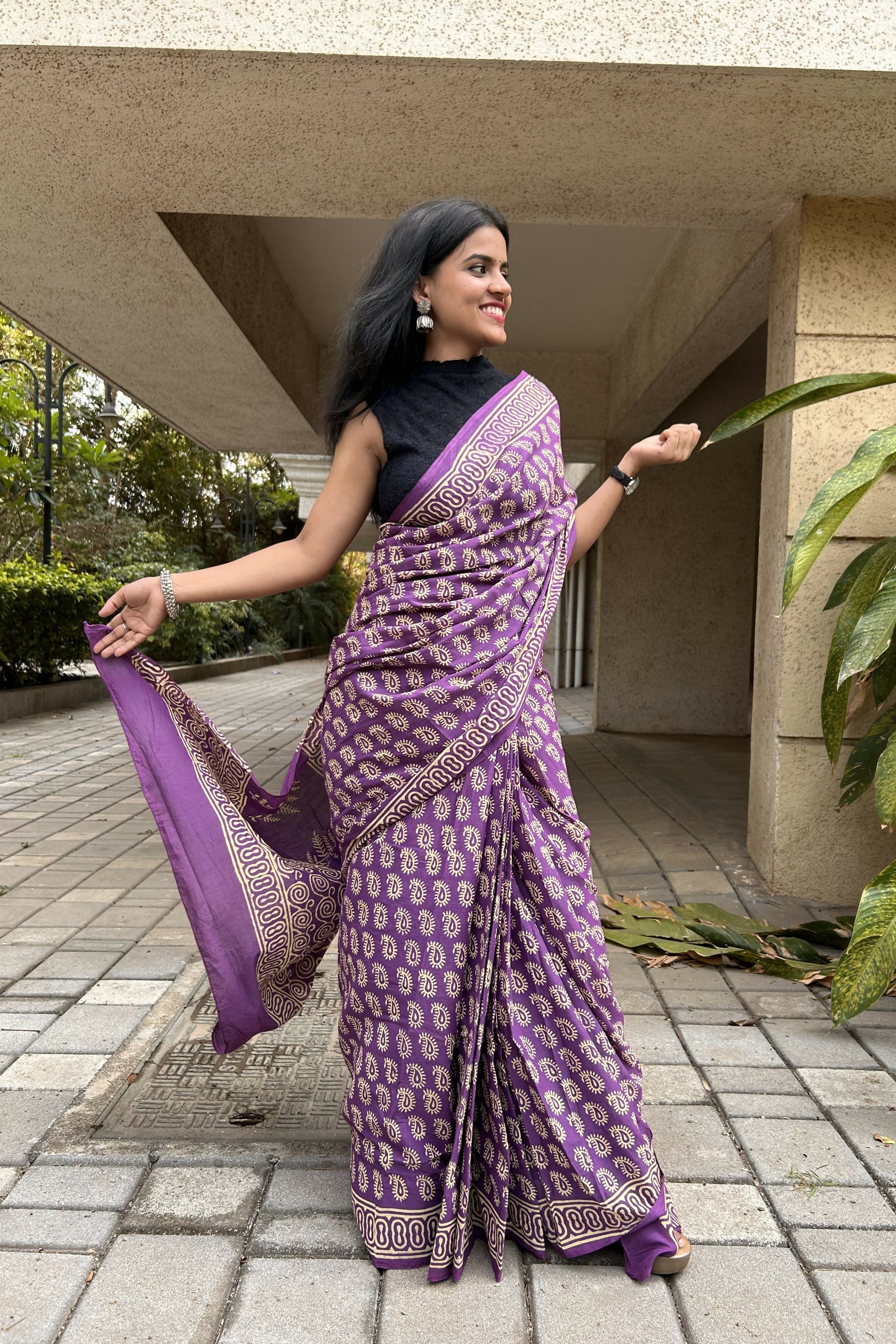Ready to wear hassle-free handblock printed saree that can be worn within 30 seconds without any help. The saree comes with lining and has a hidden pocket attached to provide functionality and comfort.
