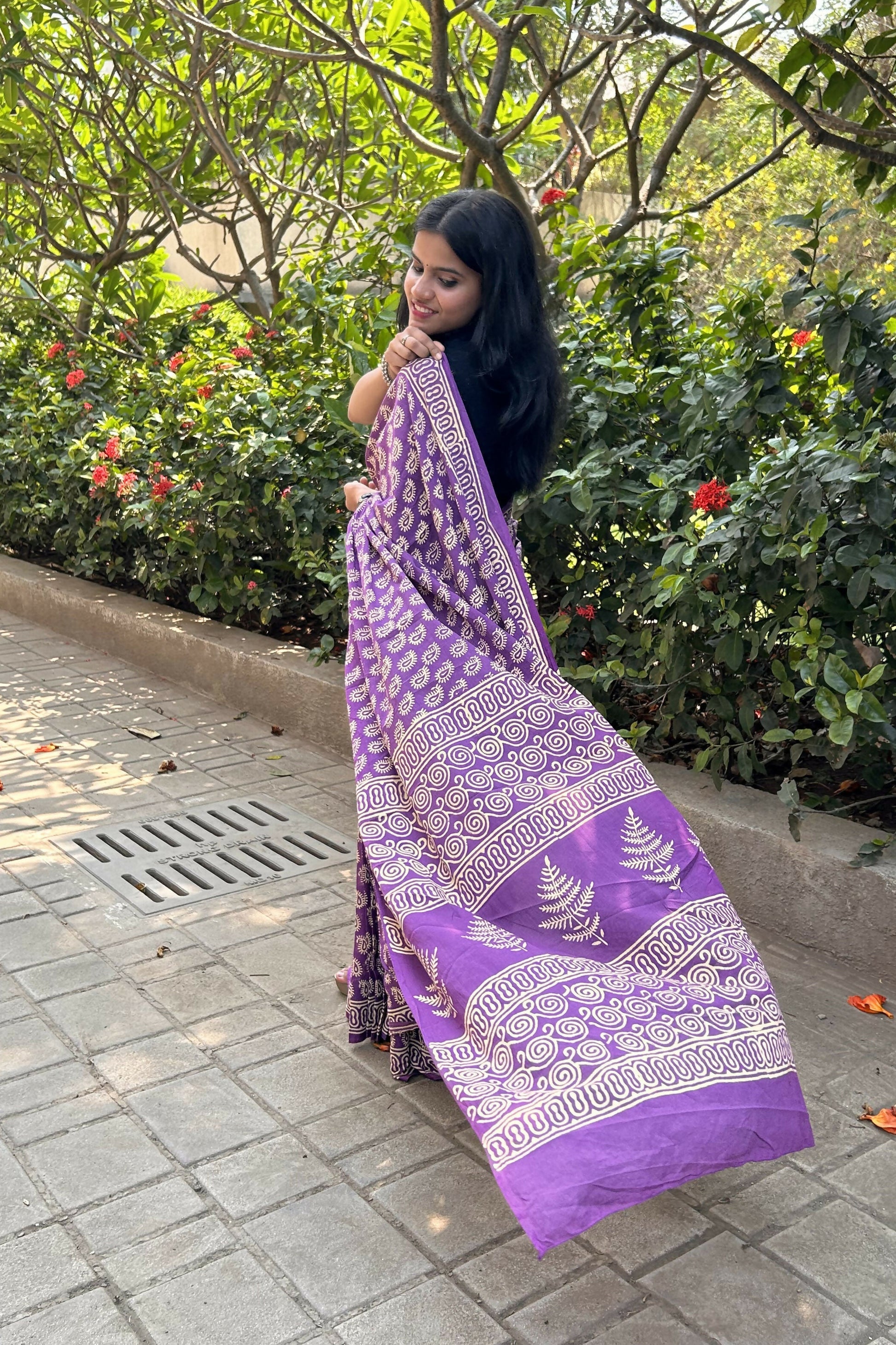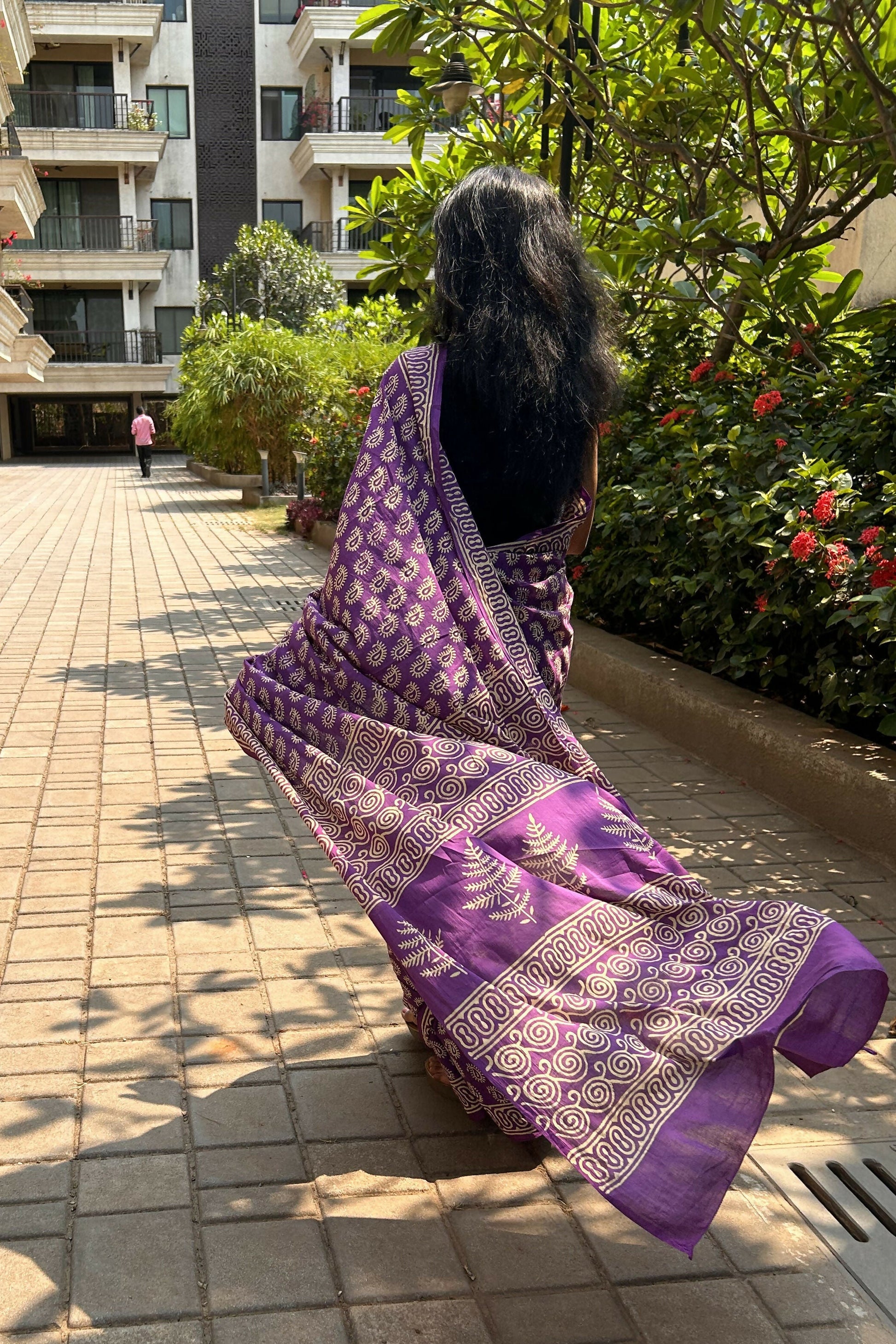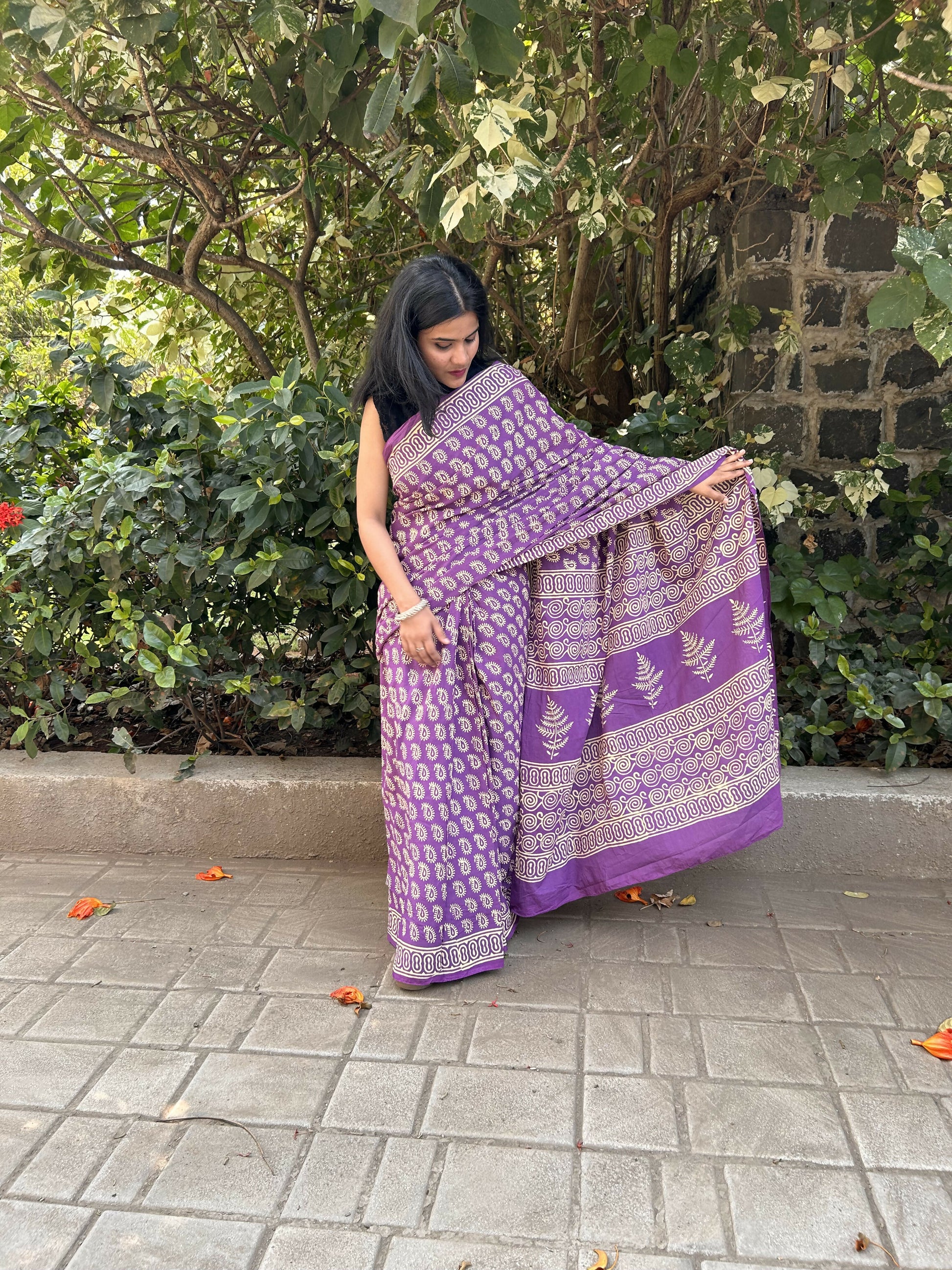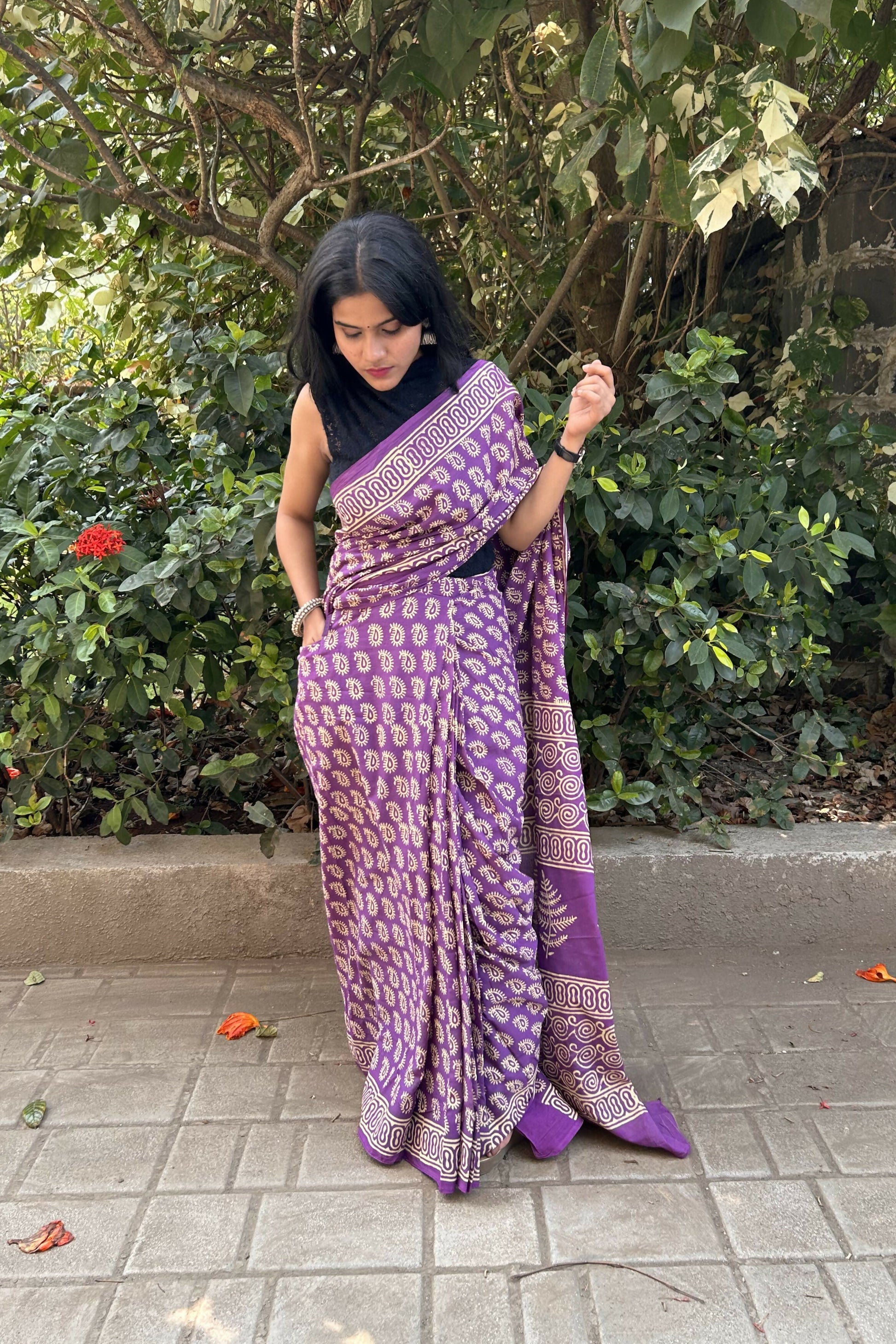 Ready to wear hassle-free handblock printed saree that can be worn within 30 seconds without any help. The saree comes with lining and has a hidden pocket attached to provide functionality and comfort.