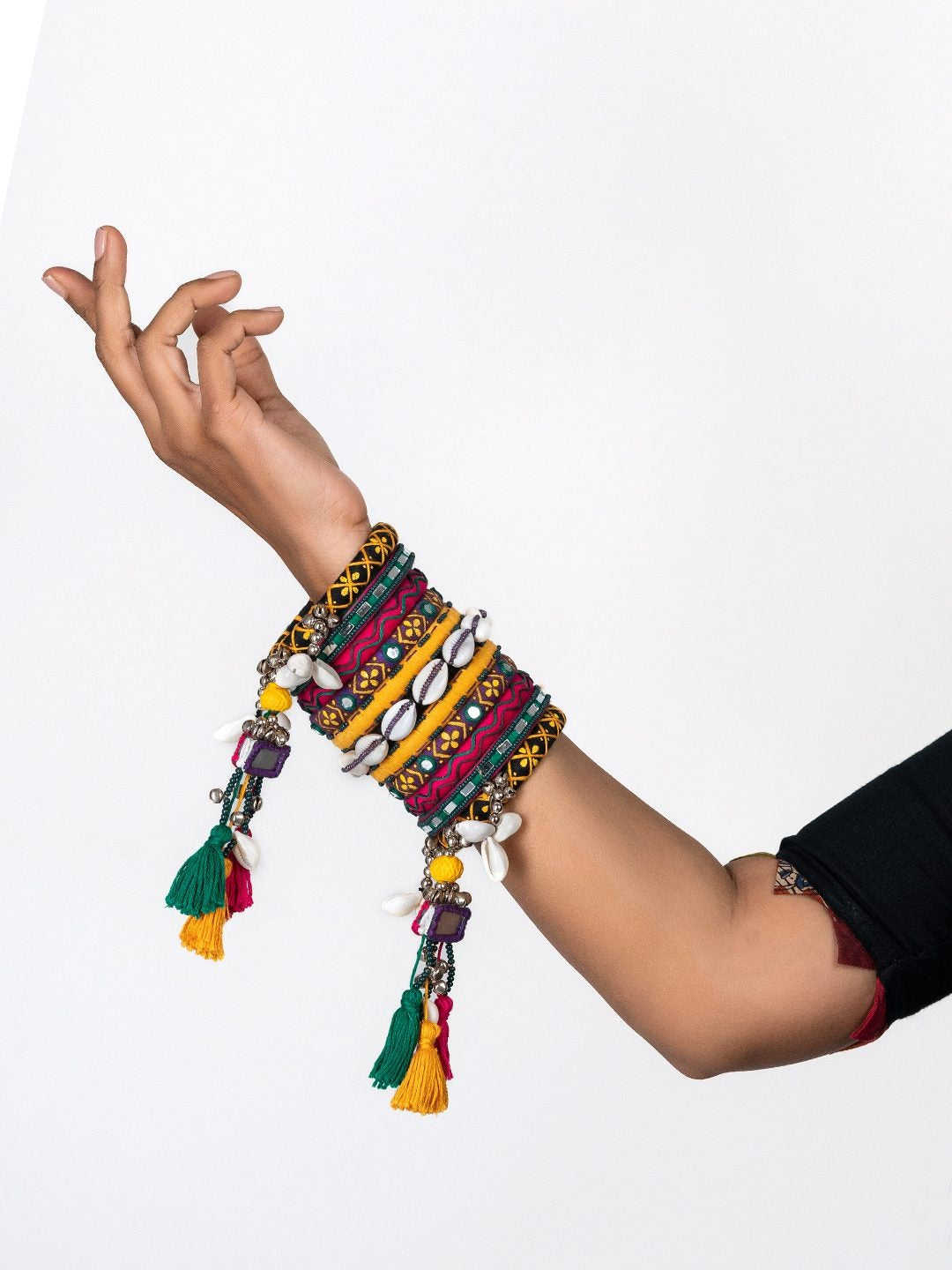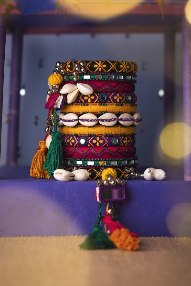 Vibrant coloured handmade mirror hanging shell bangles, featuring intricate designs. Perfect for Navratri festivities, adding a touch of glamour to your outfit. Add a pop of color and vibrancy to your Navratri celebrations with our stunning handmade bangles collection!