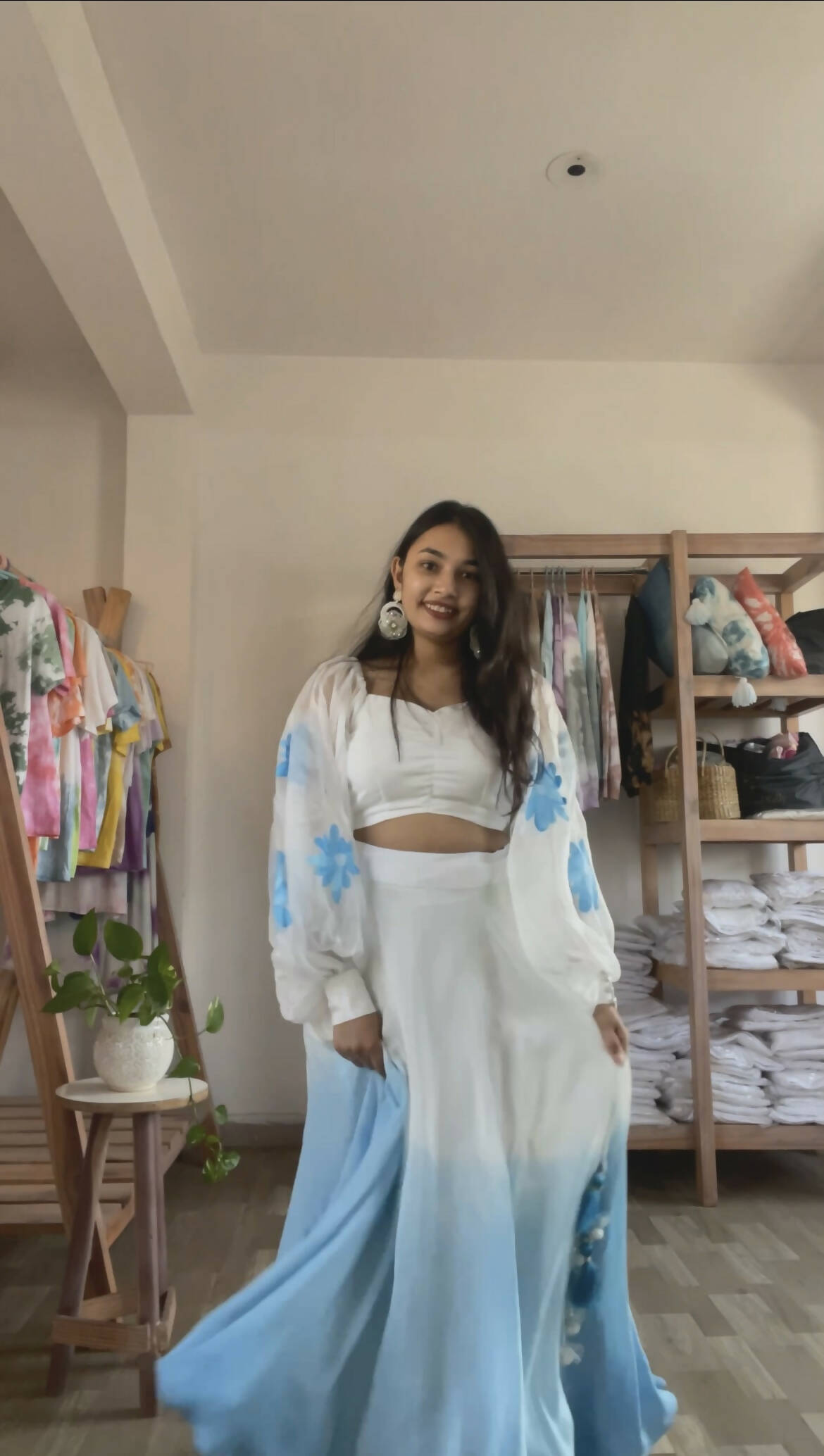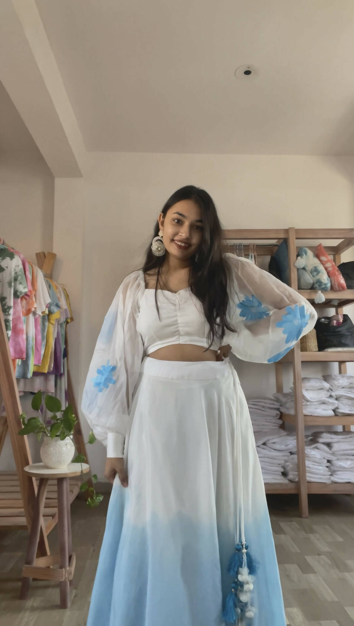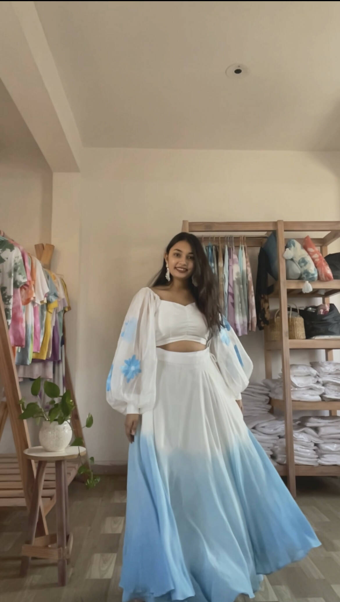 A perfect combination for your next Indian outing Pink dip dyed skirt with white top and handpainted sleeves. This outfit will be a total head turner.