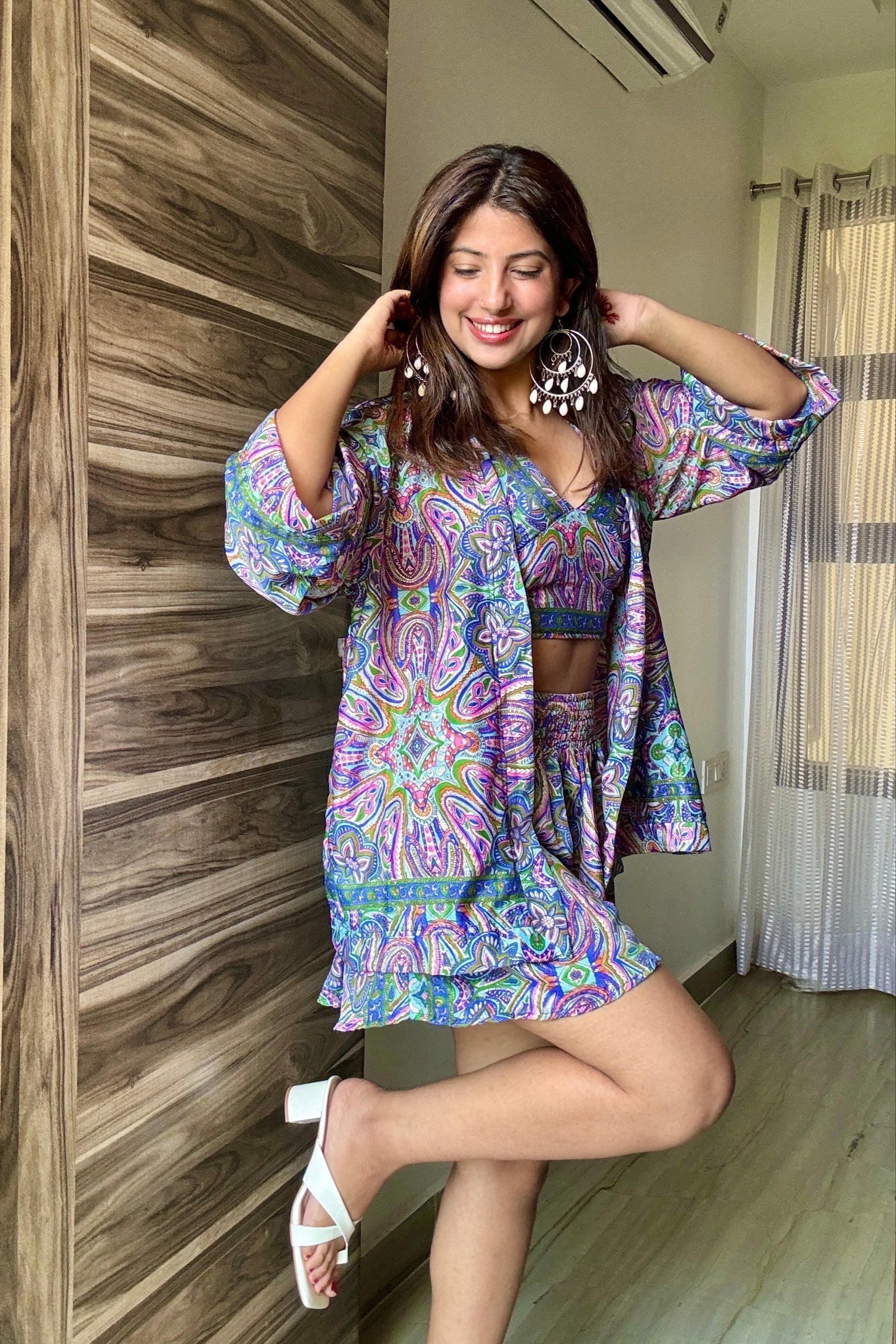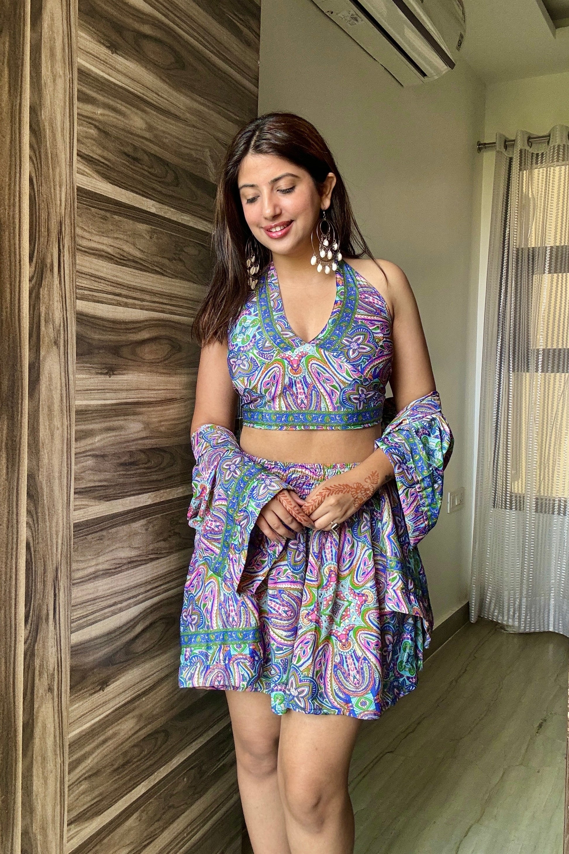 Breezy Kimono with Halter-Neck Top(that ties at the neck and back for the perfect fit for all body types) and super high waist Skort(shorts that flow like a skirt), with pockets.Our uniquely designed skort has a super-stretchable waist and a comfortable free-flowing hemline.The tie-back halter neck top allows you to tie it according to your own comfort and body type.