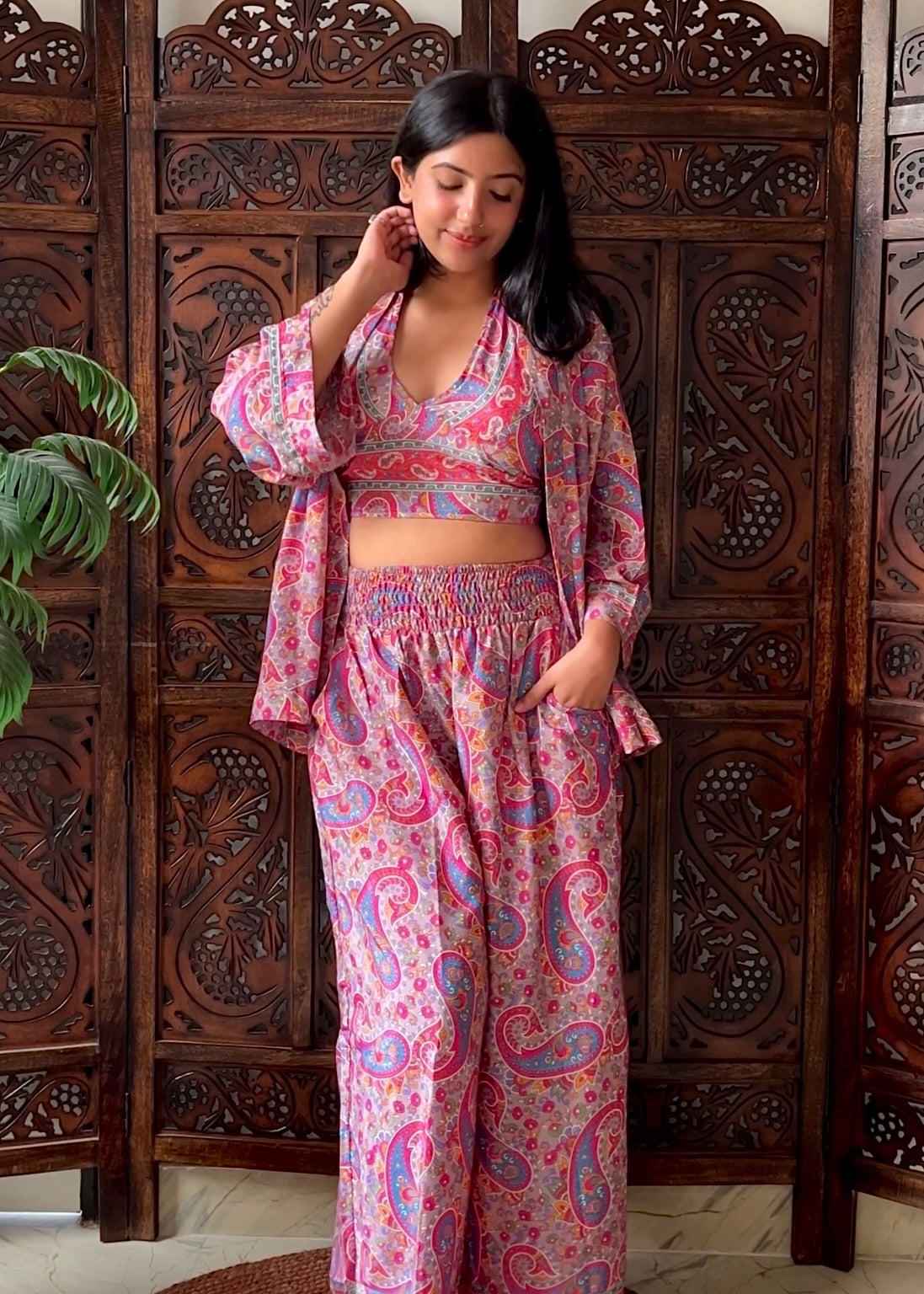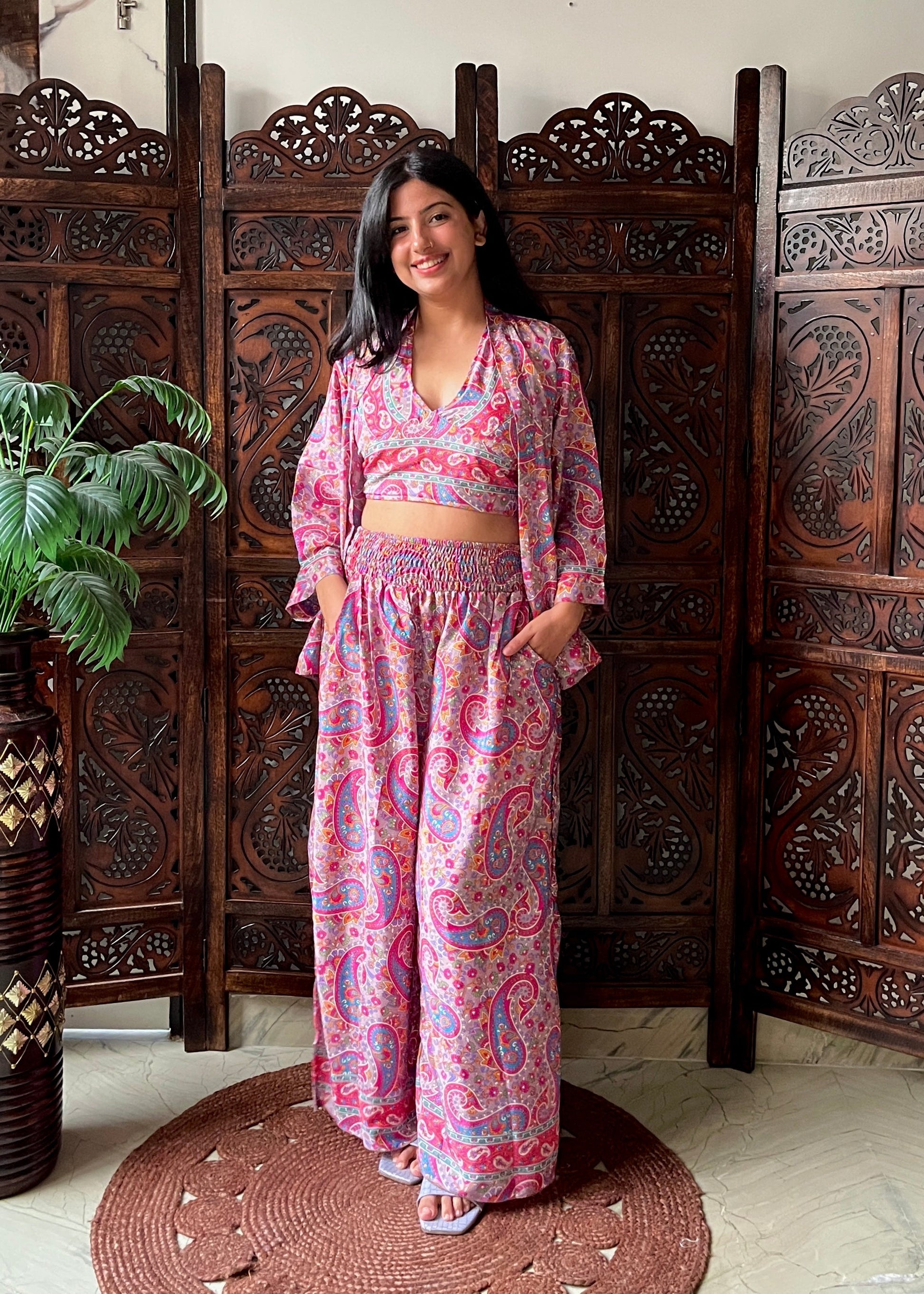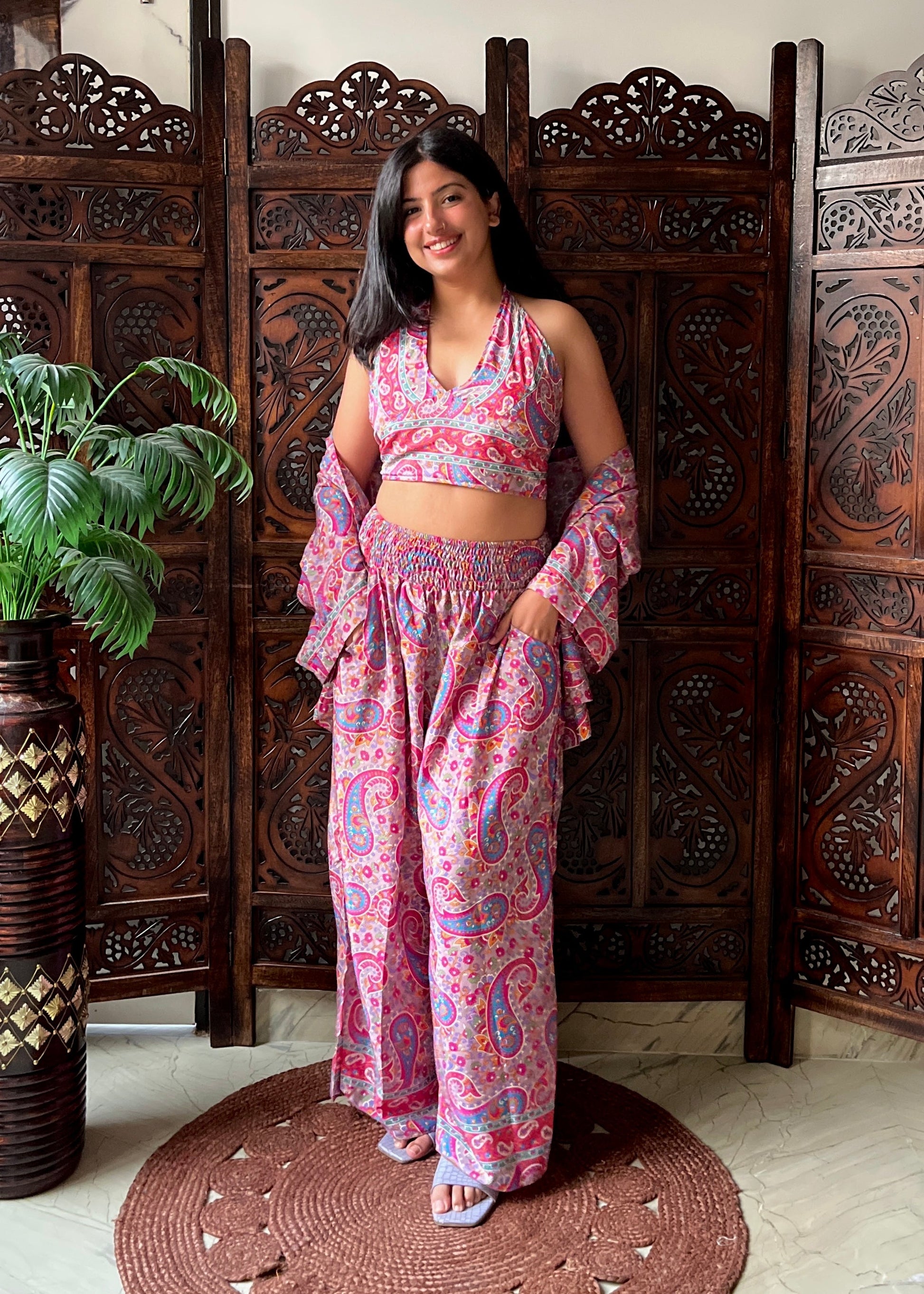 Breezy kimono with halter-neck top that ties at the neck and back for the perfect fit for all body types and comfy high-waist pants with pockets. The uniquely designed free-size pants have a super-stretchable waist, ultra high rise and a comfortable free-flowing structure for a gorgeous fit on all sizes and body types. The tie-back halter neck top allows people of every size to tie it according to their own comfort and body type.