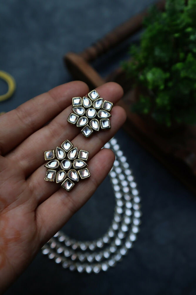 Get triple the glamor with our Kundan Layered Set! Three layers of square kundan chains, embellished with little pearls around the edges, come together to create this simple yet stylish necklace. The necklace comes with a pair of matching earrings. Pair this up with a saree or a pant shirt to make a style statement!