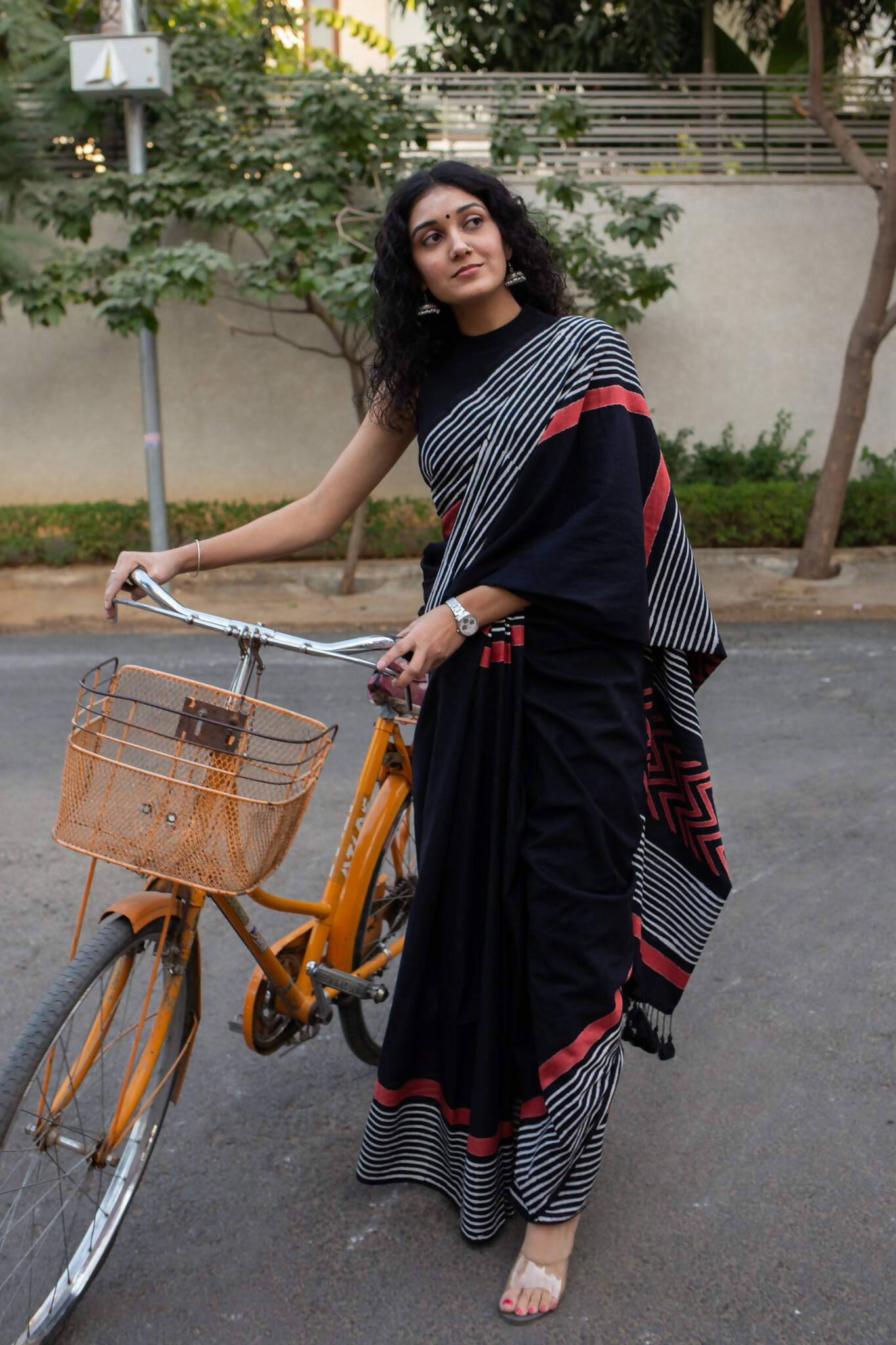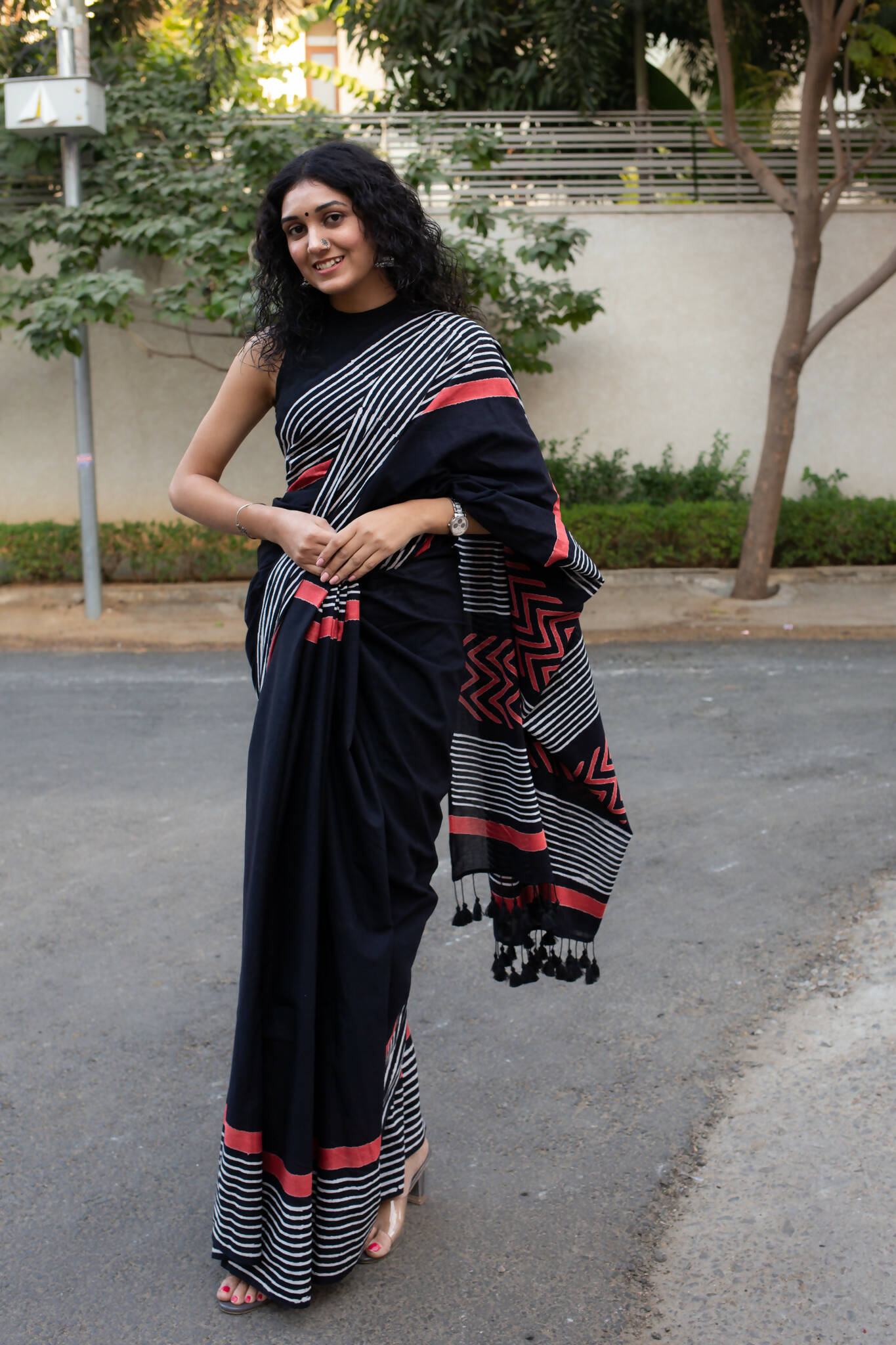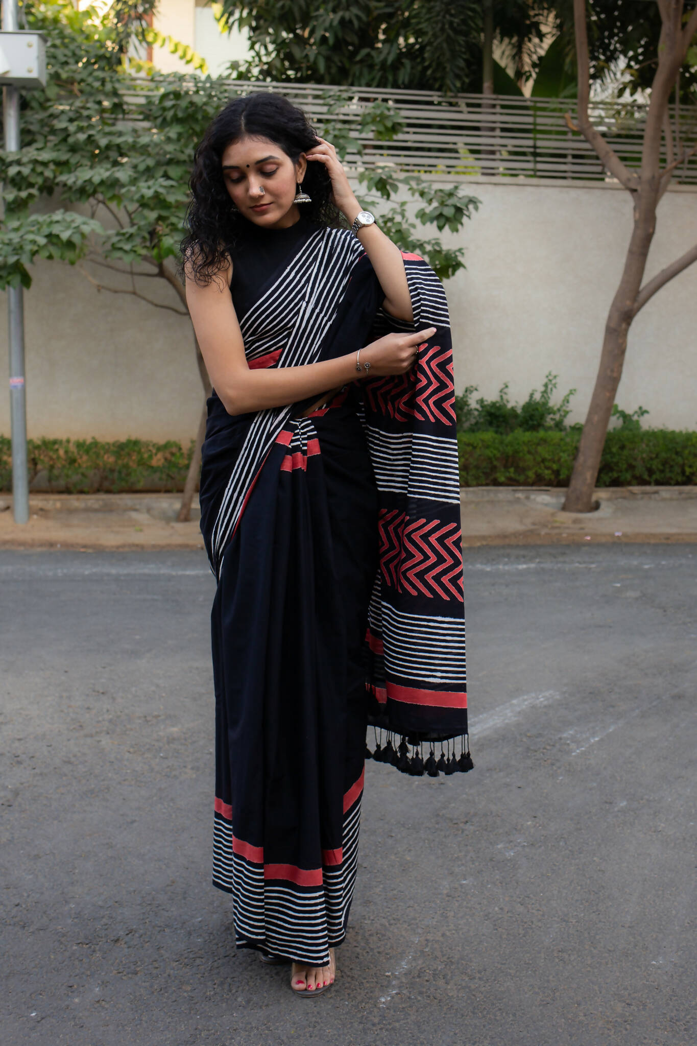 Lady in Black, a stunning hand block printed saree, is a tribute to the timeless elegance of black. The intricate patterns on this saree are created by our skilled artisans using traditional wooden blocks and natural dyes.The beauty of Lady in Black lies not only in its exquisite design but also in its versatility. Its deep black color is both sophisticated and alluring, making it the perfect choice for any occasion. The soft and airy fabric drapes gracefully, adding a touch of femininity to the overall look.