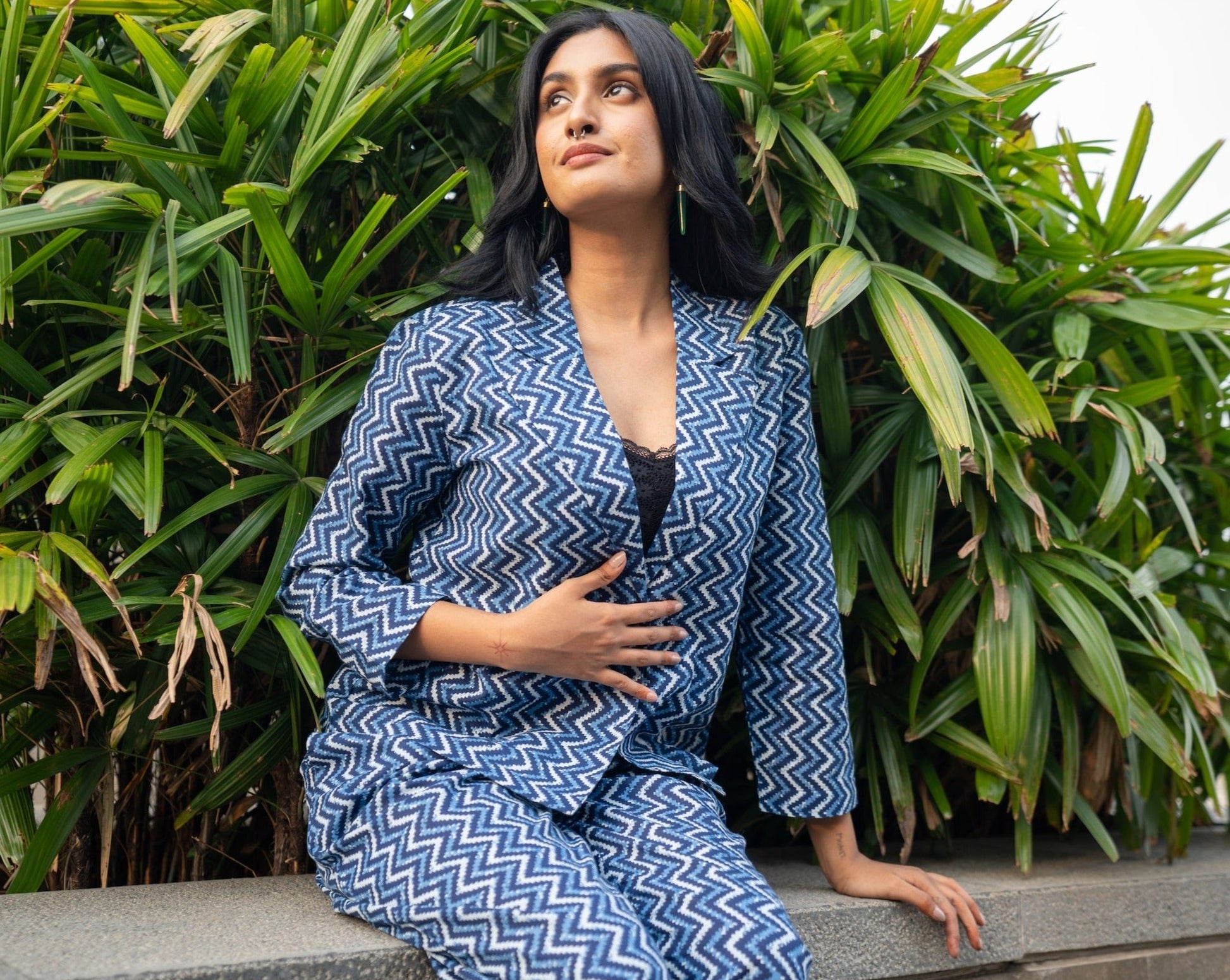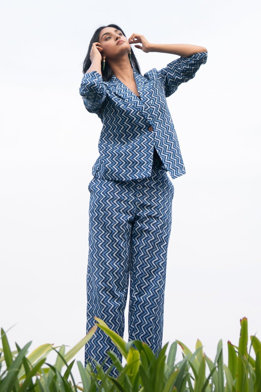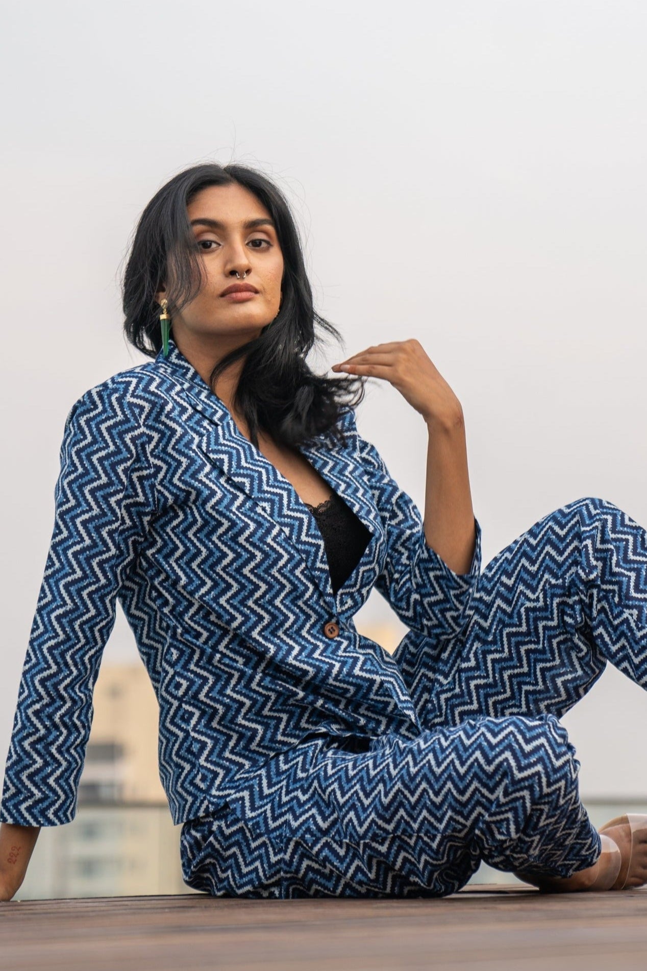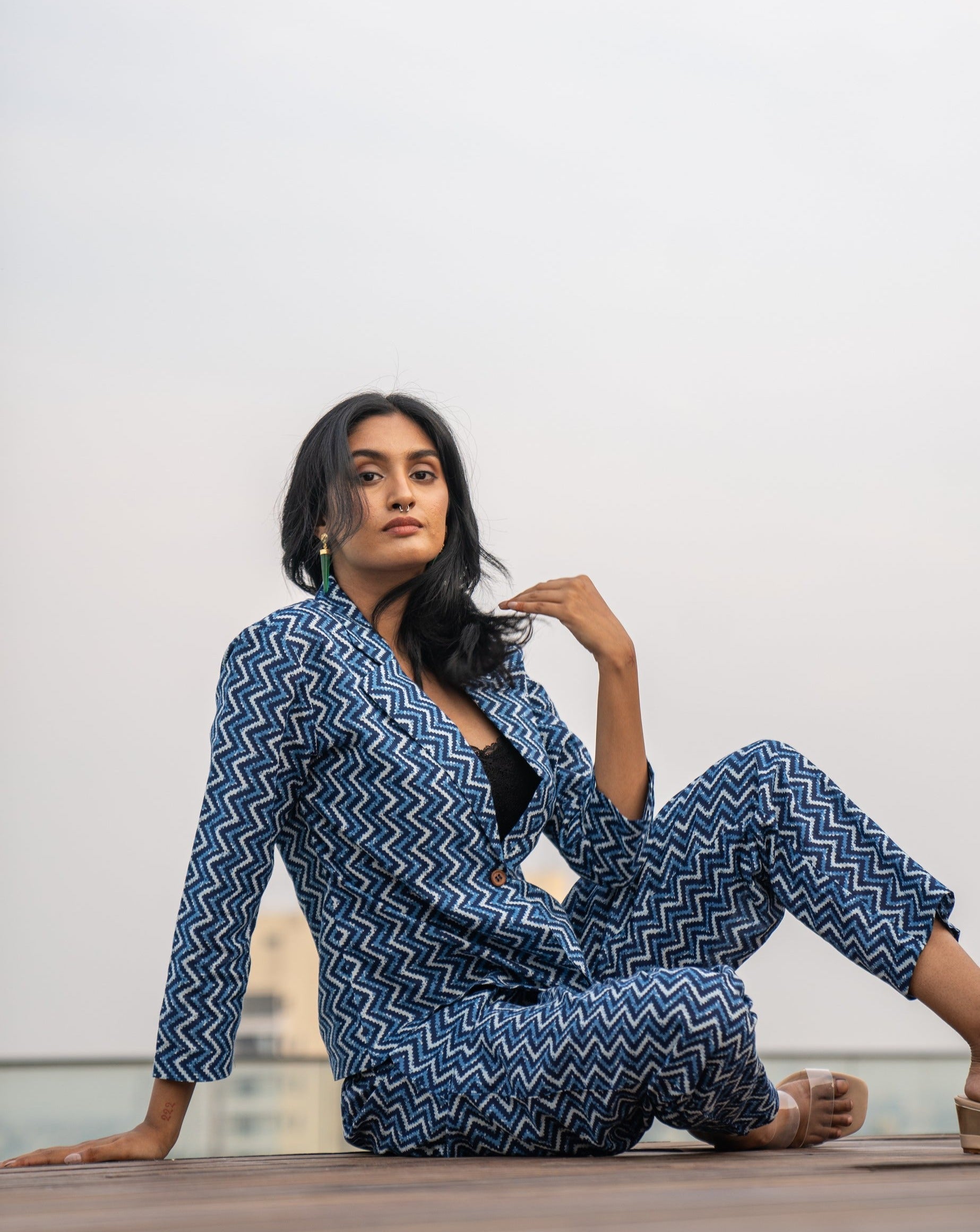 This light weight coord set will have a permanent place in your summer wardrobe. The blazer has full sleeves with a front button closure.