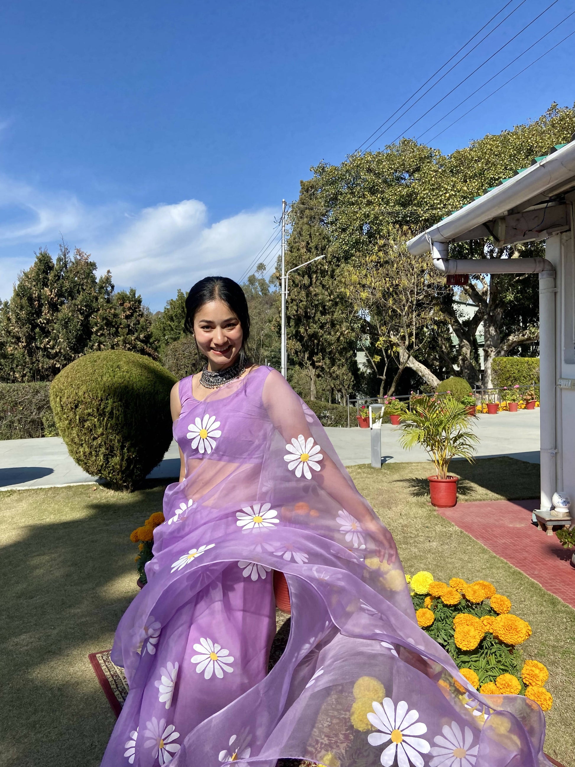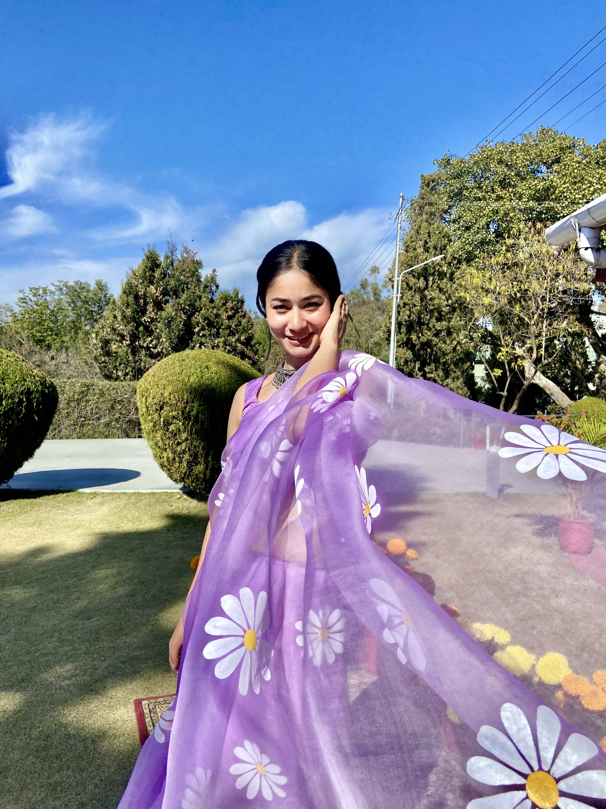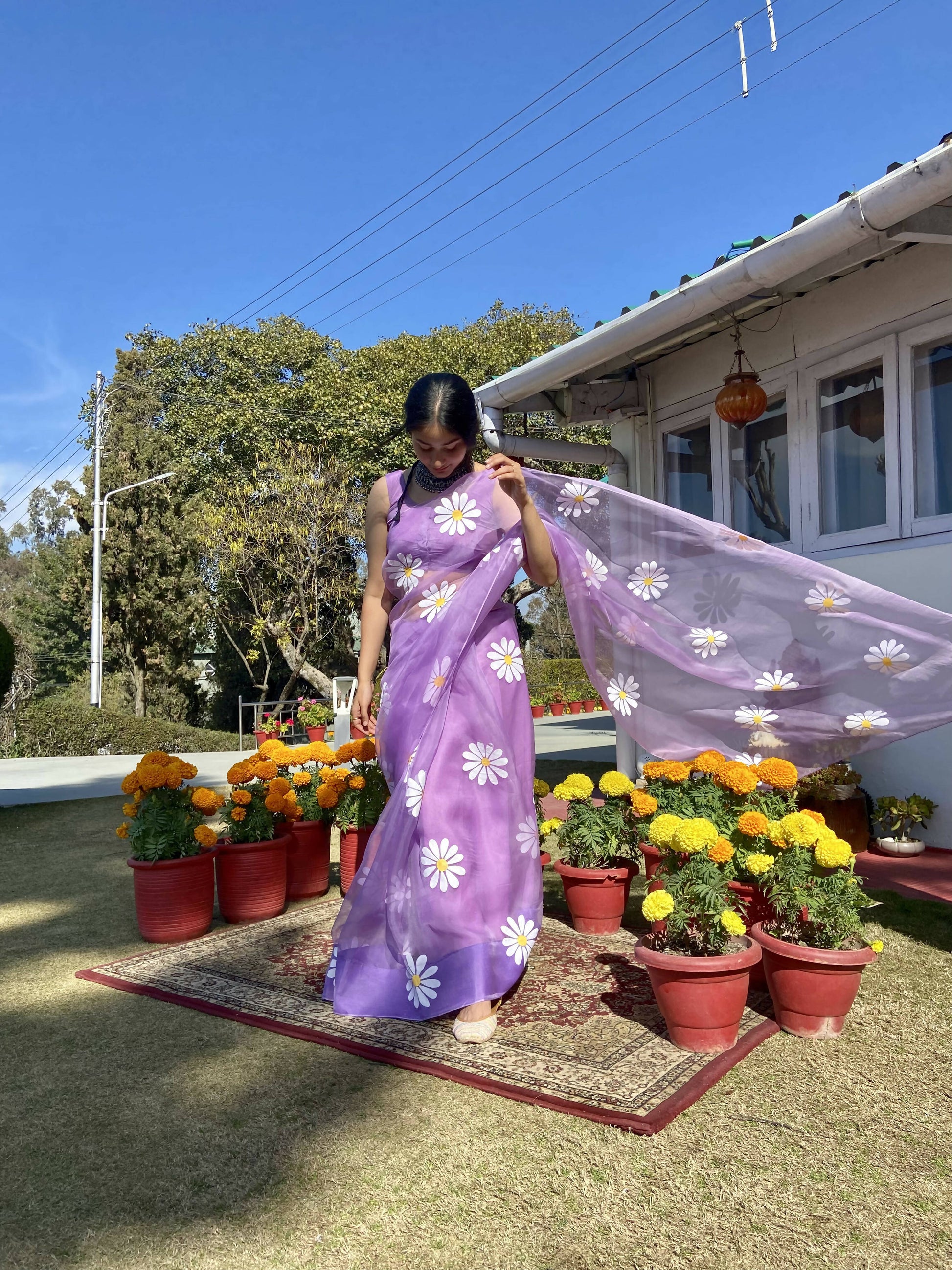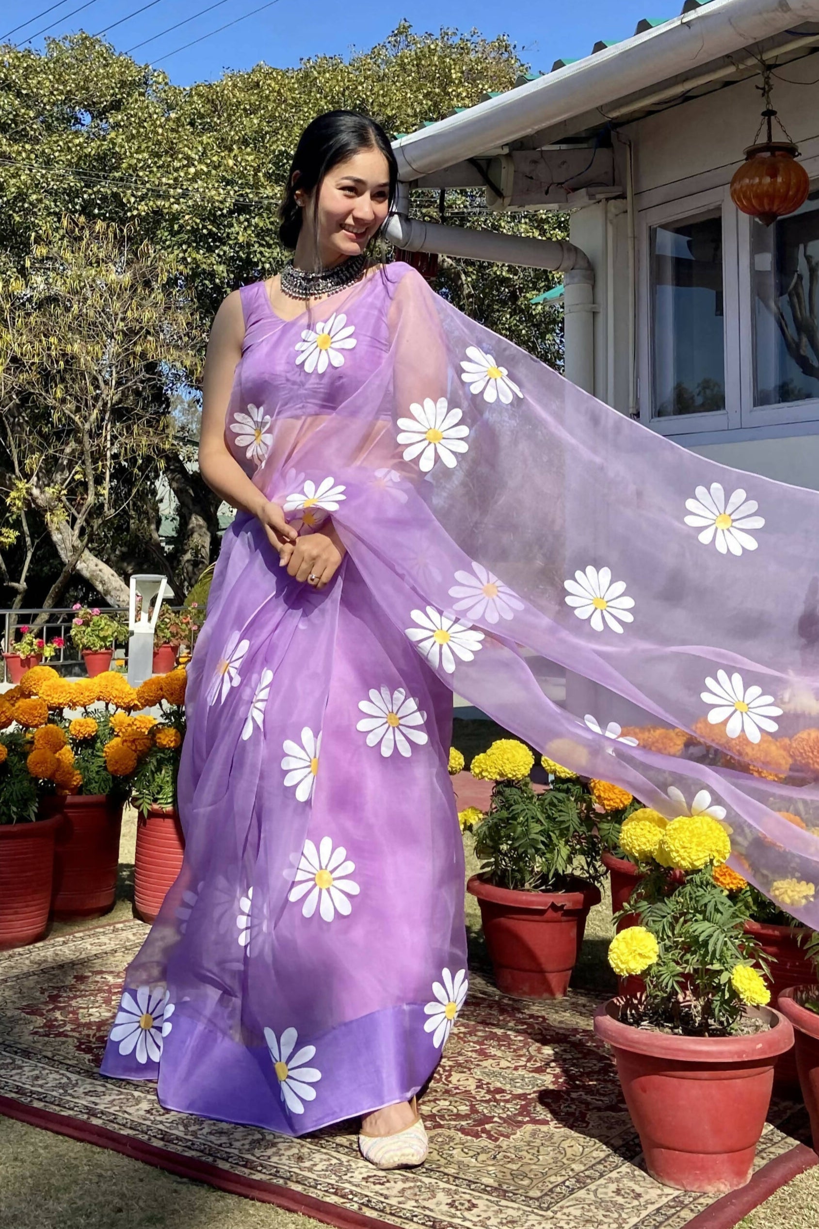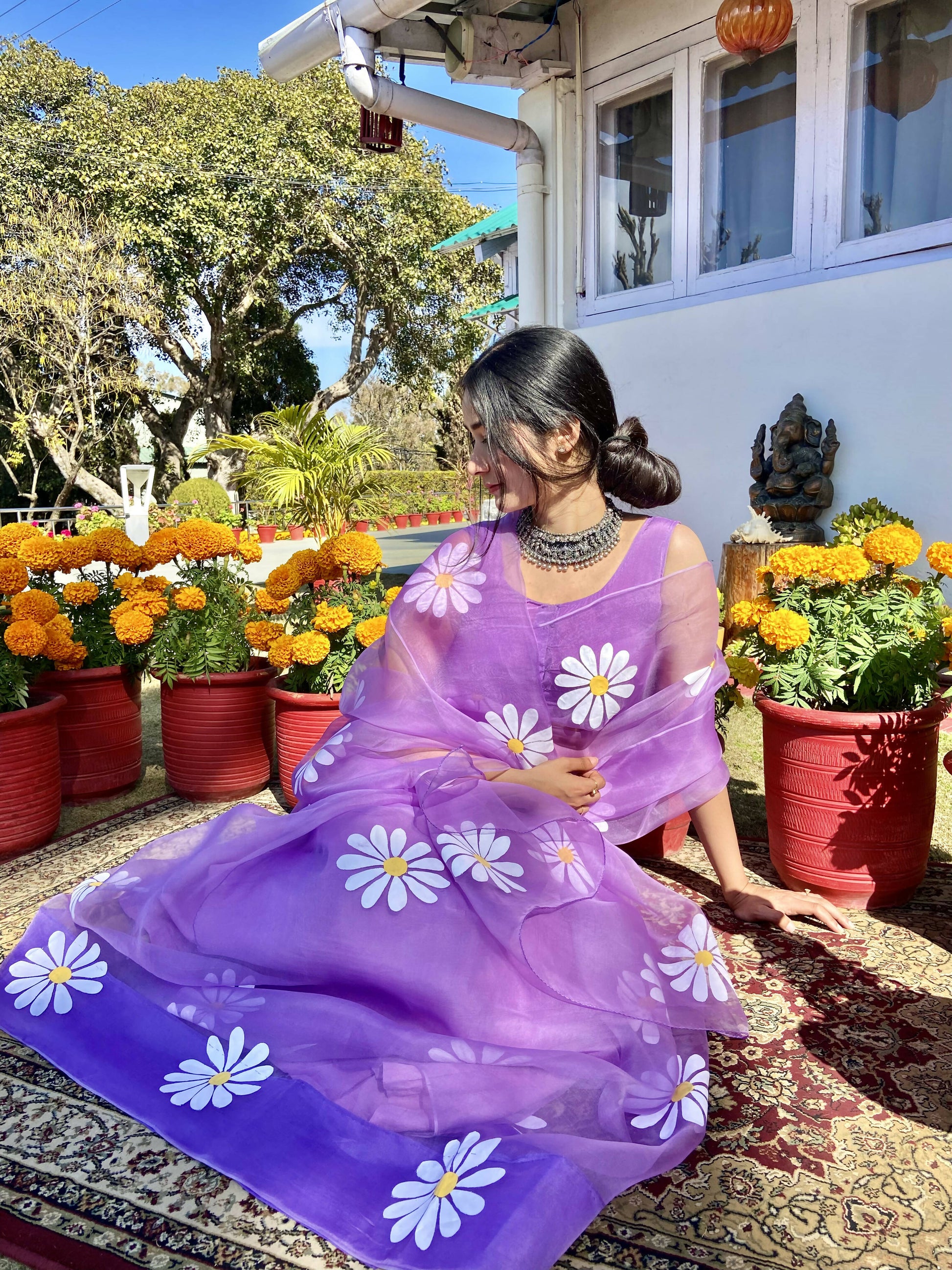Hand- painted daisy saree. Dry clean only. Its a 100% Hand-painted saree and might have slight irregularities. The actual color may vary due to different screen calibration.