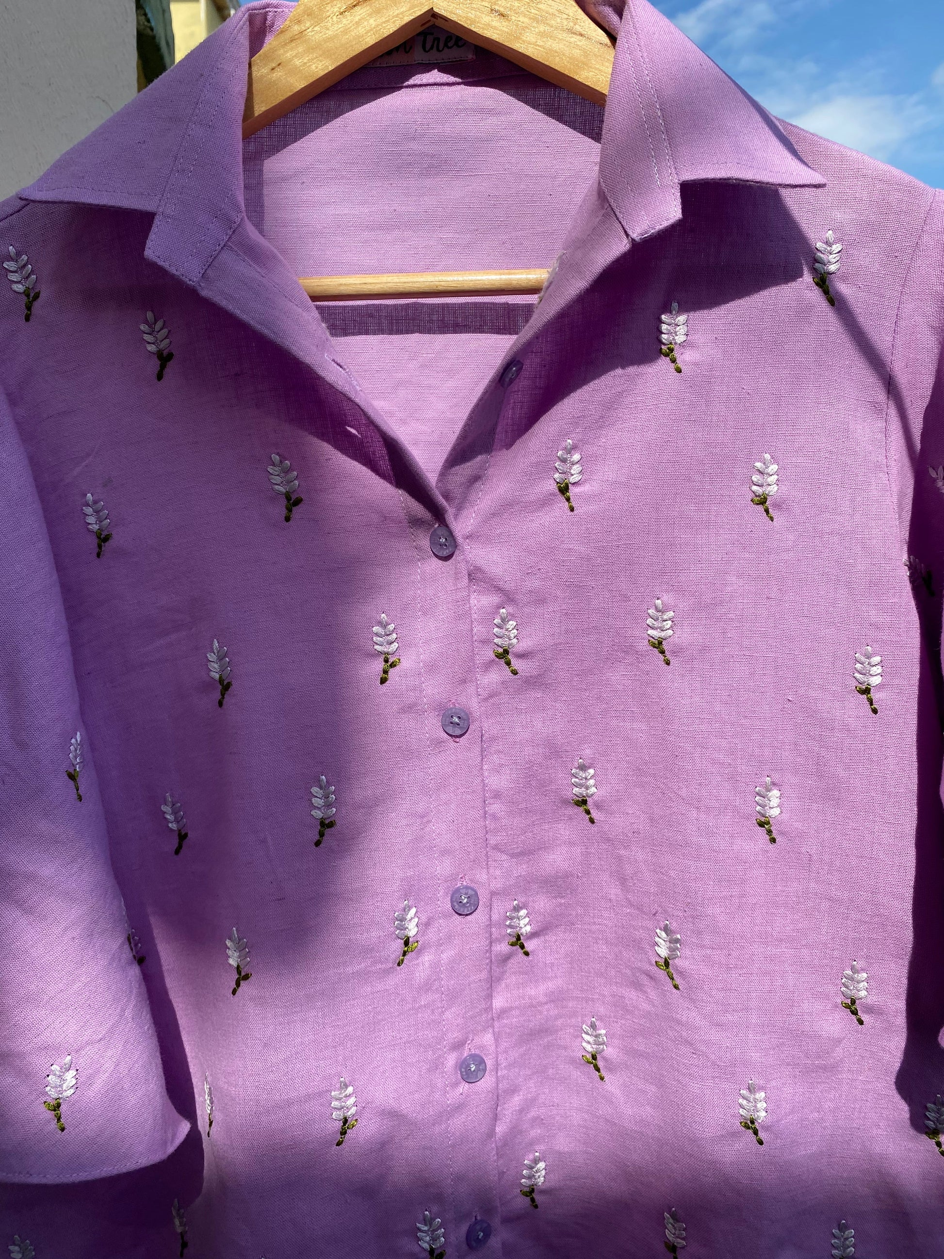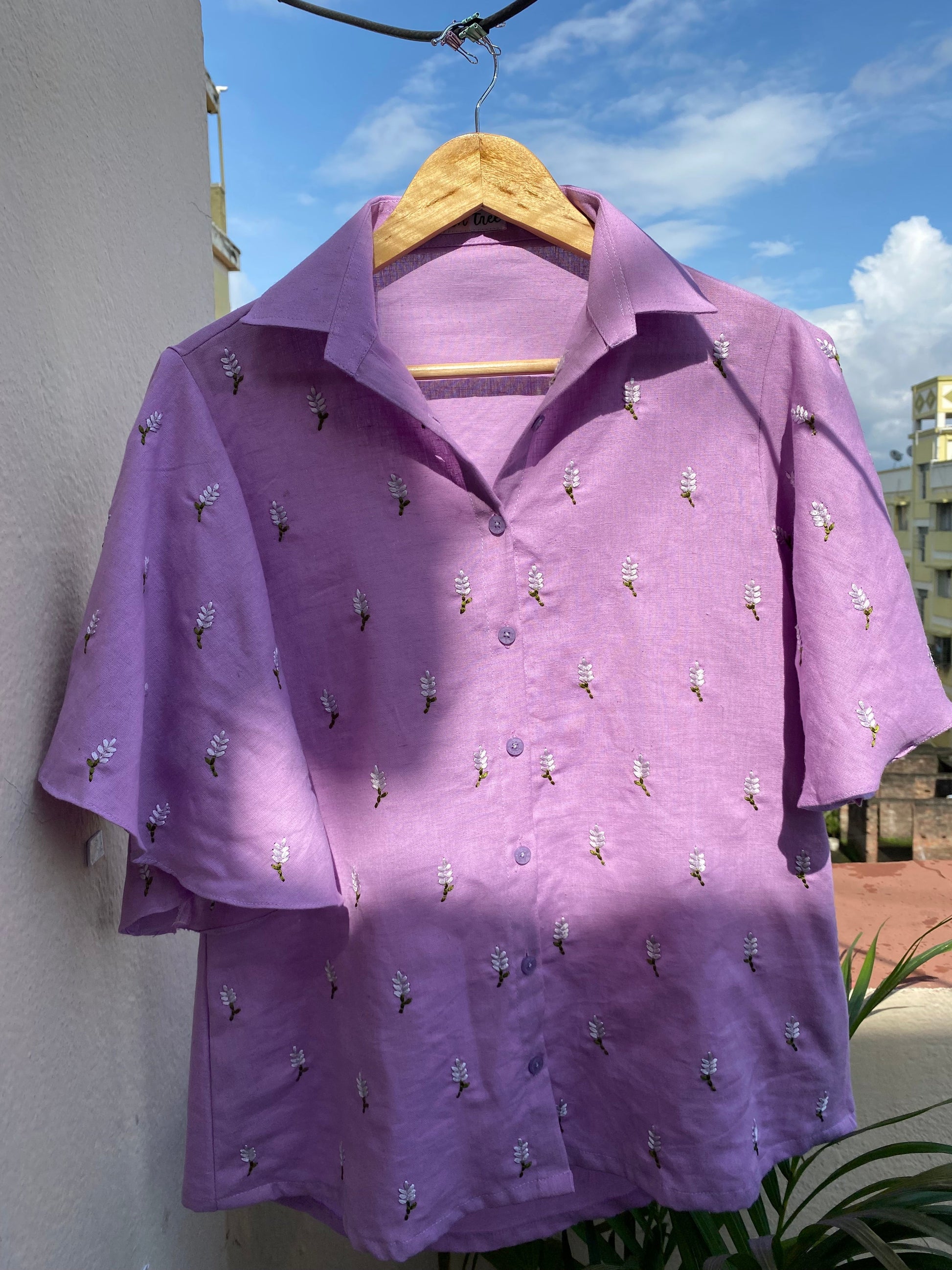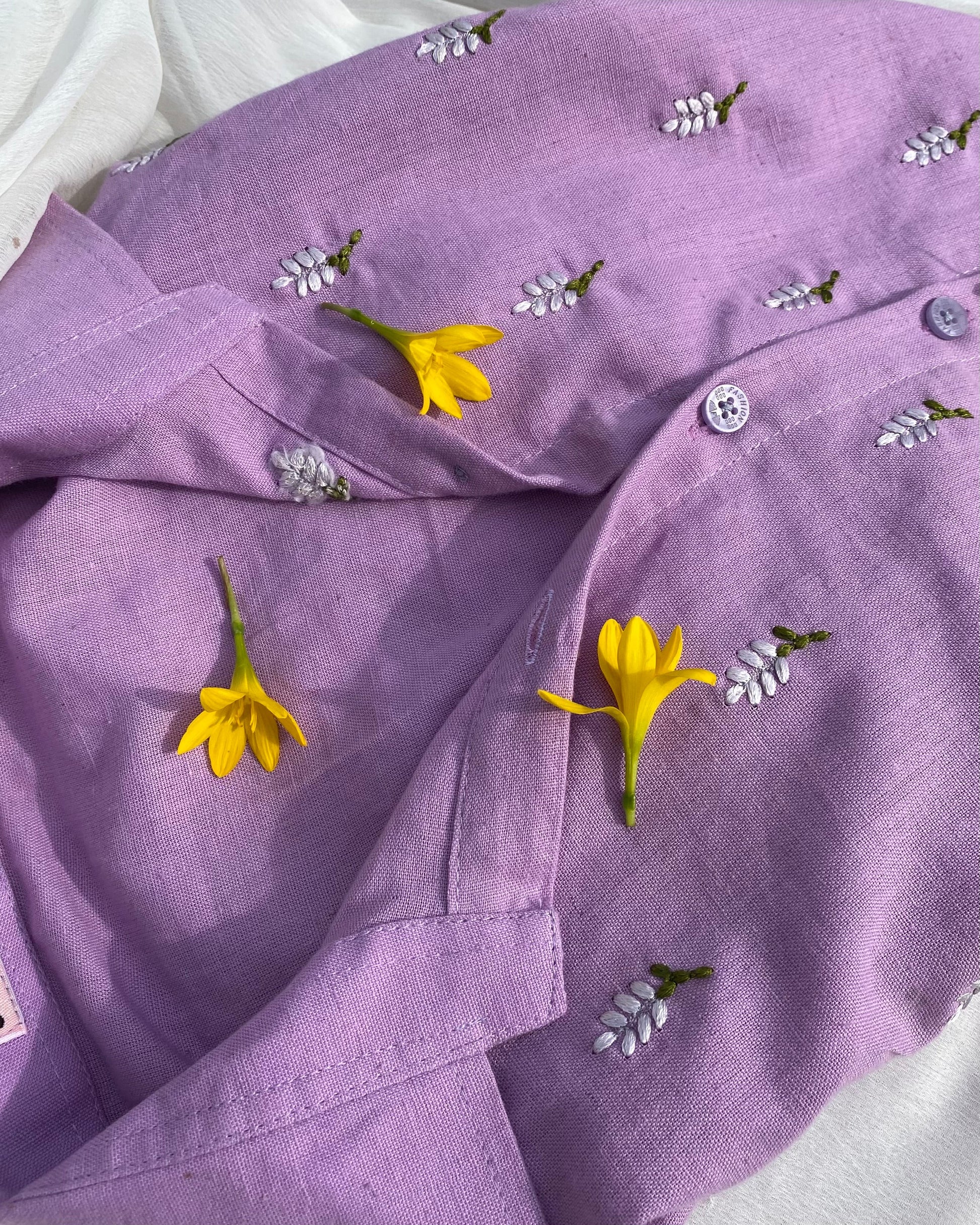 Experience the serene beauty of lavender fields with our exquisite cotton shirt. Meticulously crafted for comfort and style, this shirt features delicate lavender fields embroidered across its fabric, capturing the essence of a peaceful countryside. Made from premium quality cotton, it offers a soft touch against the skin, ensuring you stay cool and comfortable all day.