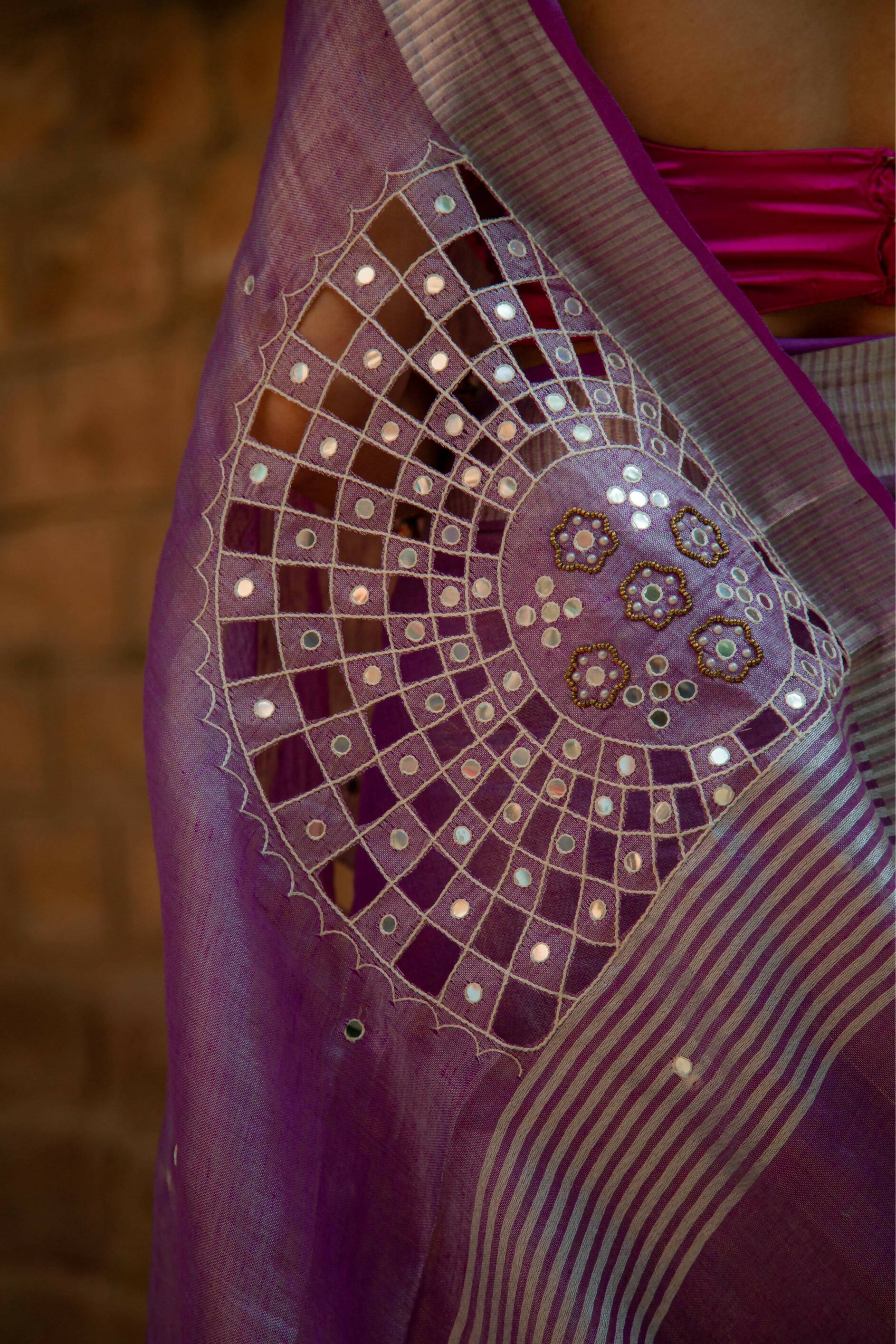 Crafted in authentic tissue linen featuring hand done cut work details with serene play of mirror work and delicate bead finishing this saree is one of a kind and a must have in a wardrobe!