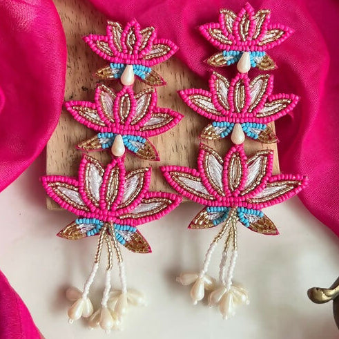 Three layered Lotus handmade earrings with delicate cut dana, resham & bead work with pearl dangling, perfect to pair with all your indian looks.